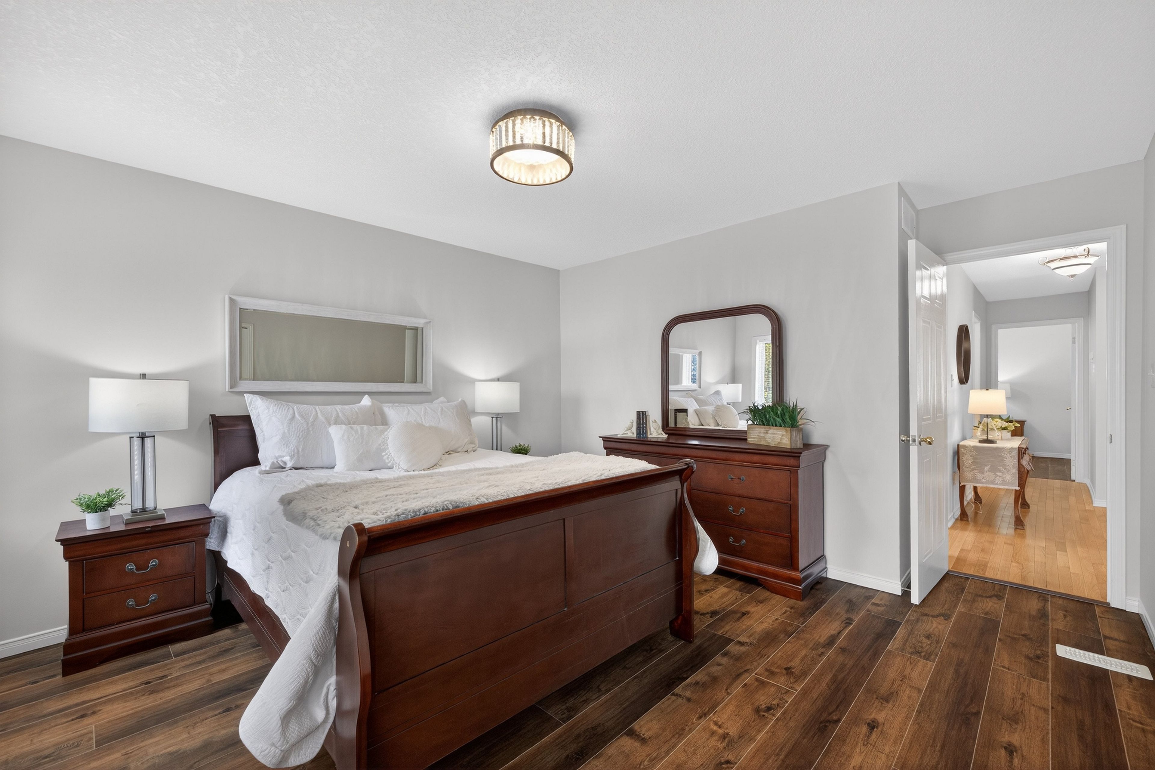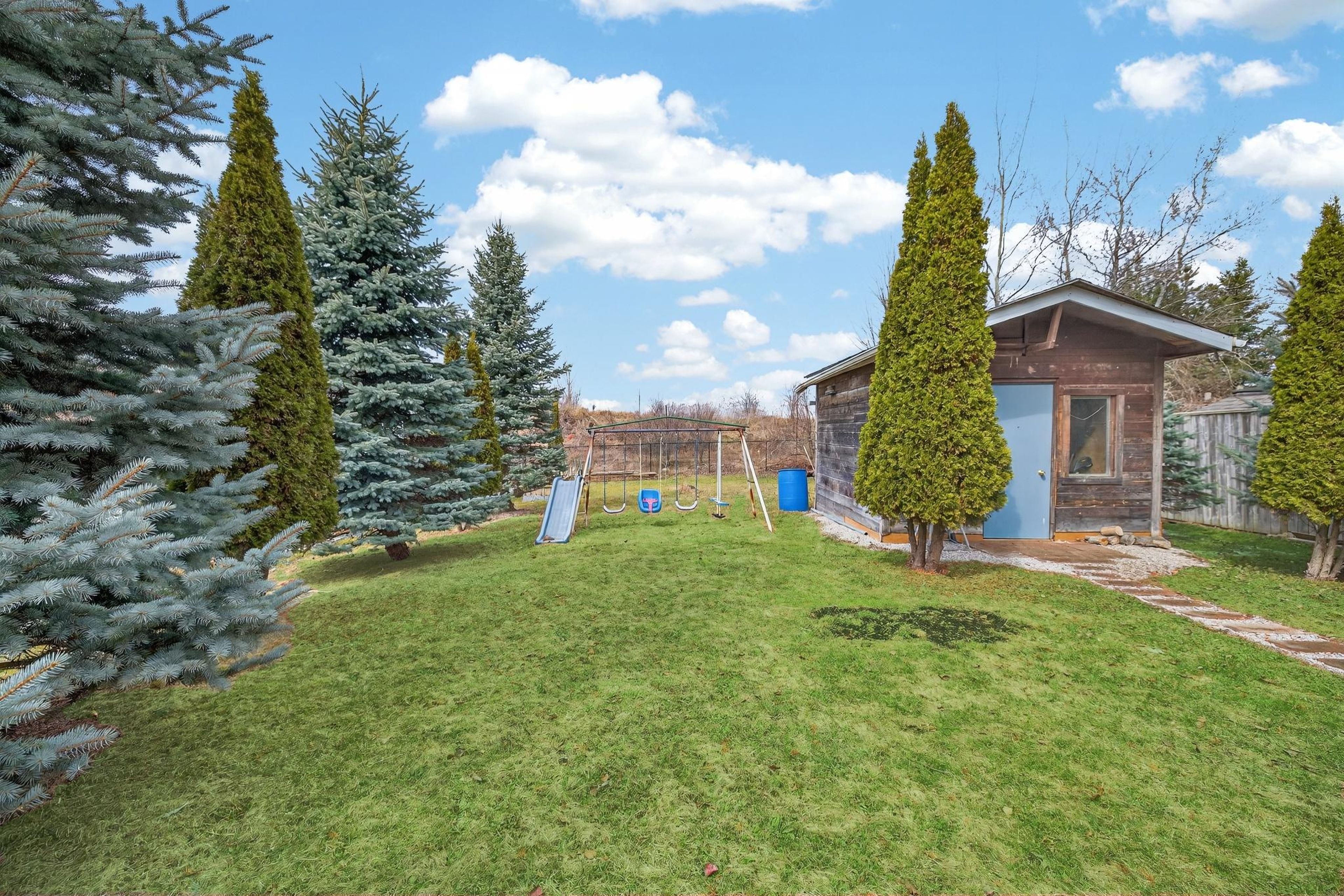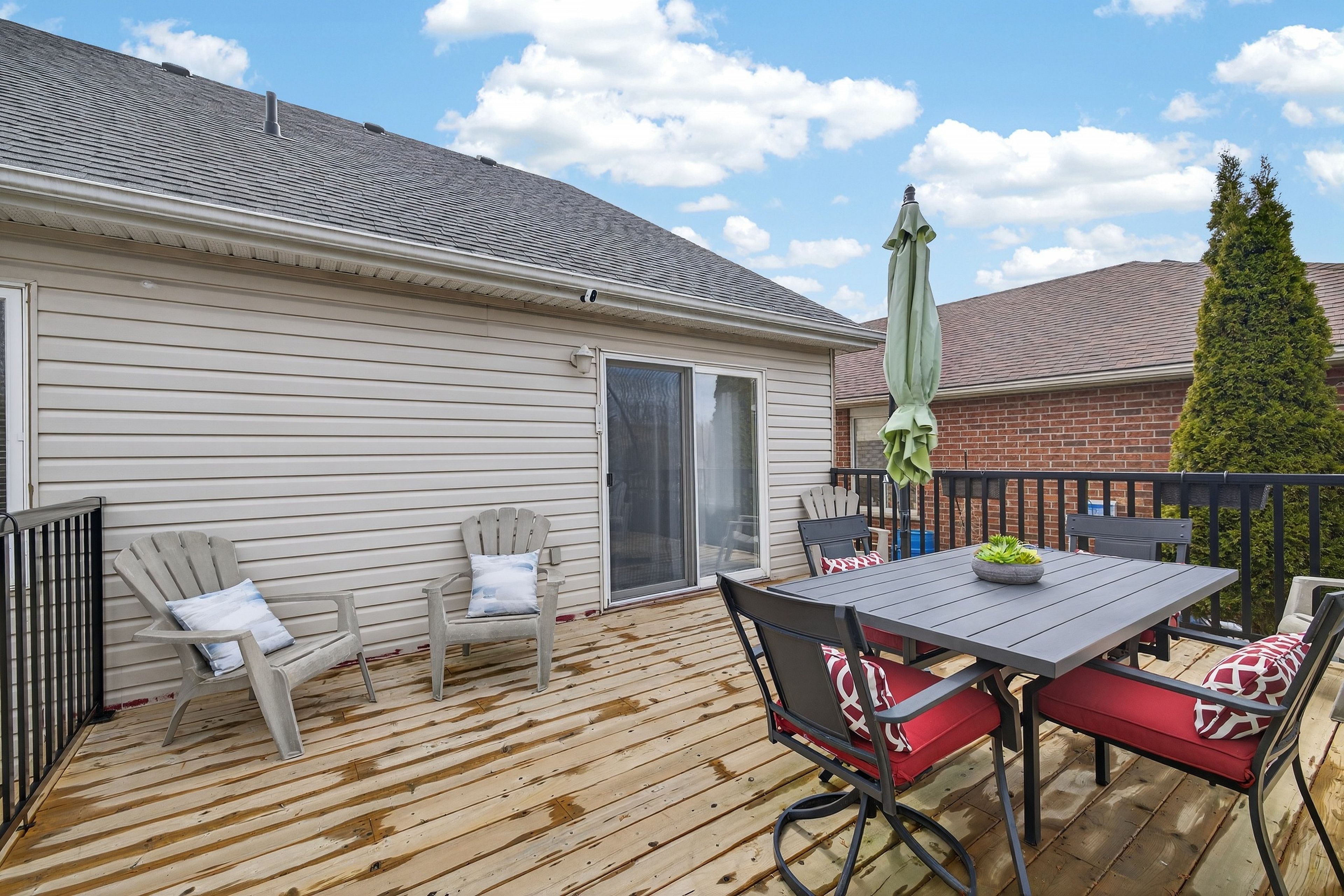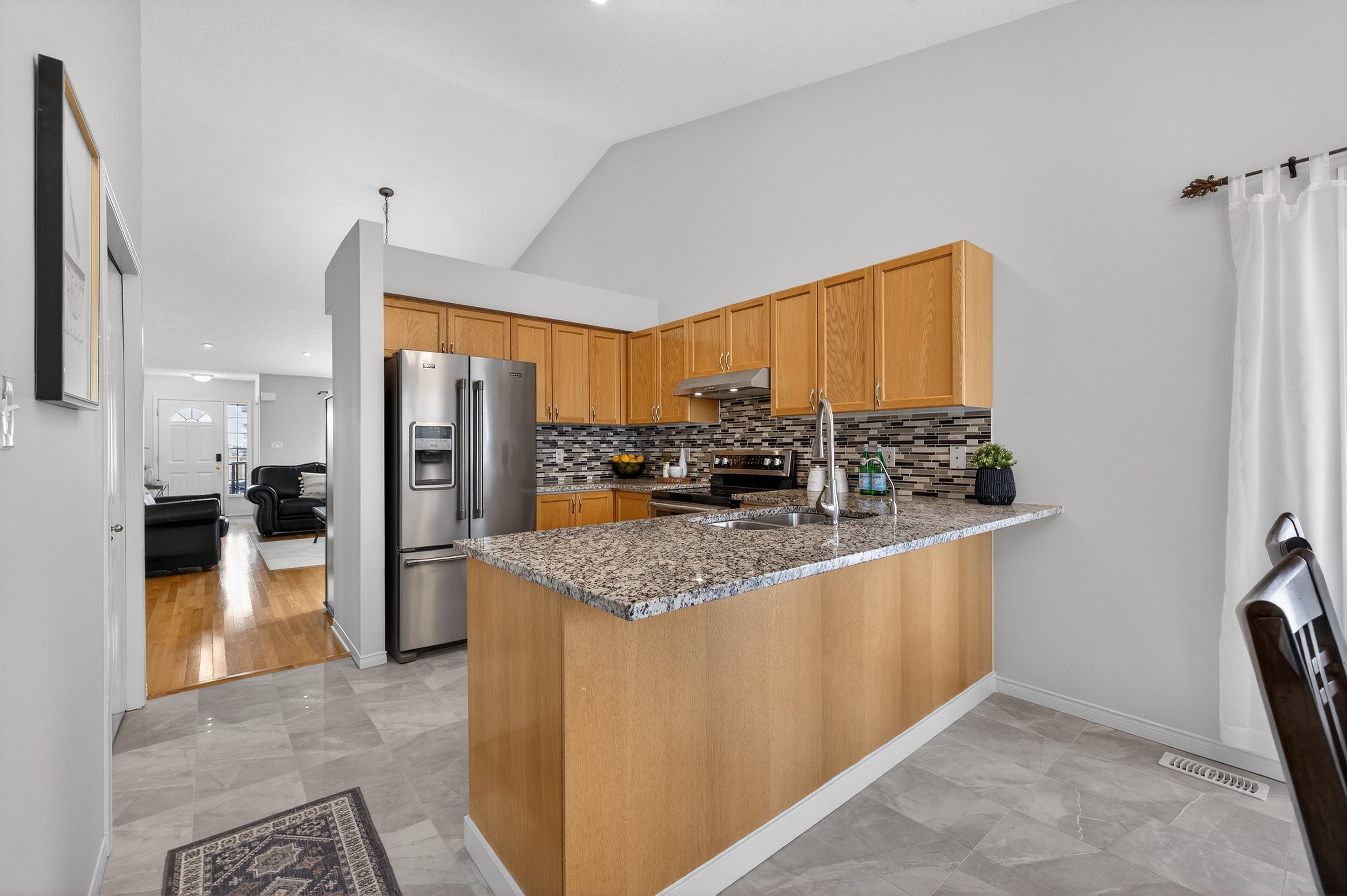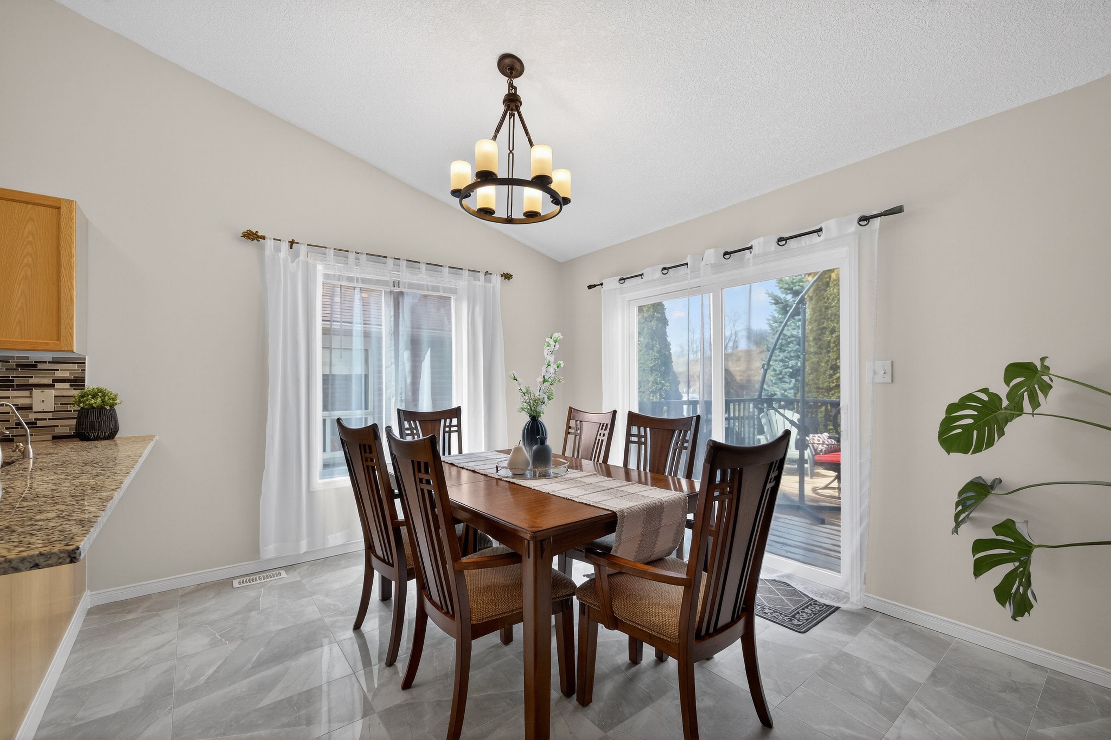 Welcome to 91 flaherty dr, an exceptional bungalow on a rare, oversized lot nearly 200 feet deep. This well-maintained home features a two-car garage and soaring cathedral ceilings that create an immediate sense of elegance and space. The main level offers three bright bedrooms and two bathrooms (one with a jacuzzi tub), anchored by an inviting living room filled with natural light. The recently updated kitchen is a highlight, featuring a charming dining area and sliding doors that lead directly to a new 12'x14' deck-perfect for outdoor entertaining and summer bbqs. Kitchen updates include: granite counters with a breakfast bar, stylish backsplash new range hood, stainless steel appliances and modern tiles throughout. The fully finished basement nearly doubles your living space, offering a massive recreation room, a fourth bedroom, and a 4-piece bathroom complete with a corner jacuzzi tub and a separate shower. Additional conveniences include ample storage and a dedicated cold cellar. The main floor is spacious, bright and freshly painted. The shingles were upgraded at the time the home was built. Situated on one of the largest lots in the city with no rear neighboors, this home is just steps away from the west end rec centre and major shopping amenities (costco, zehrs, banks, lcbo...).