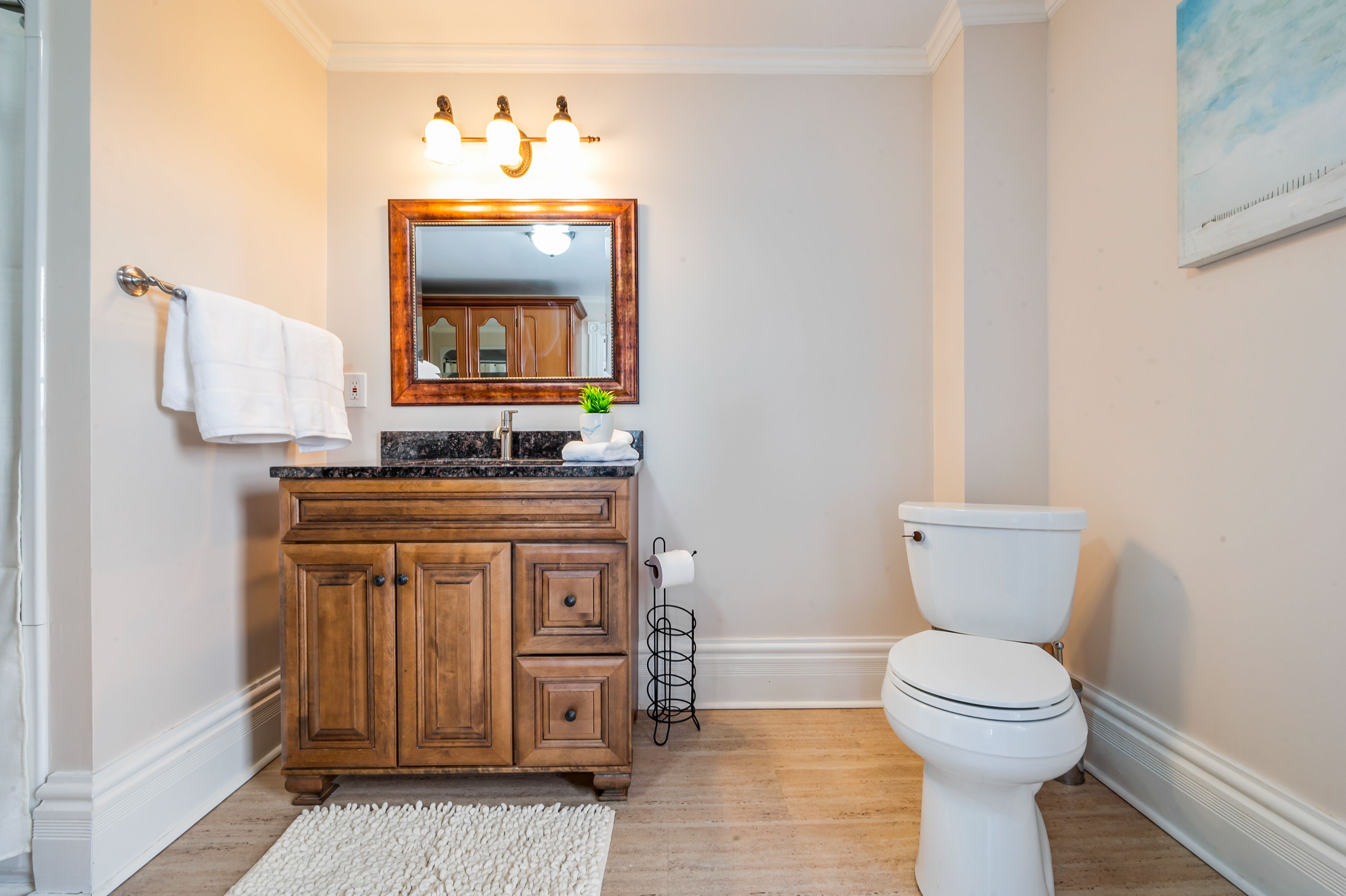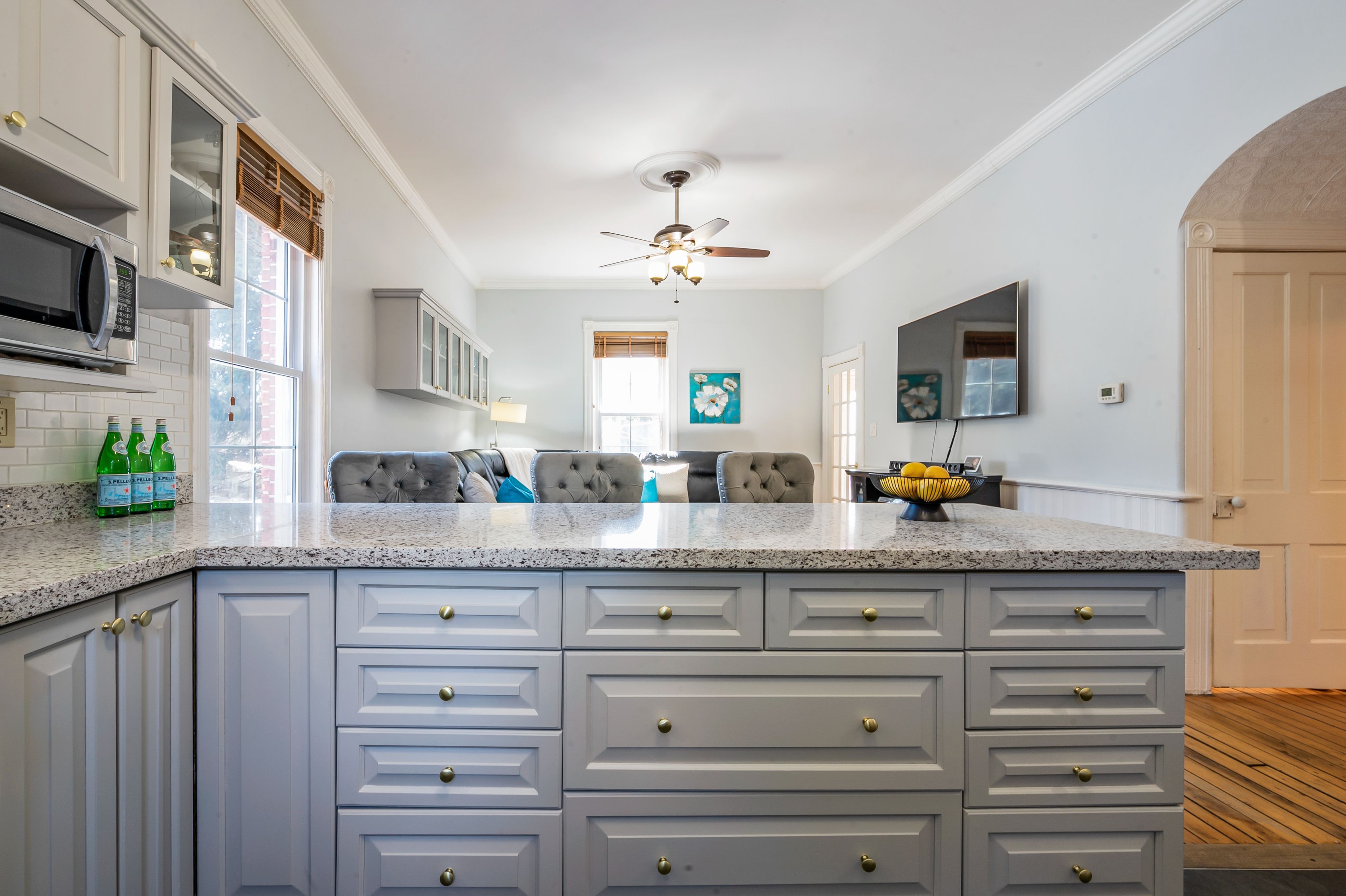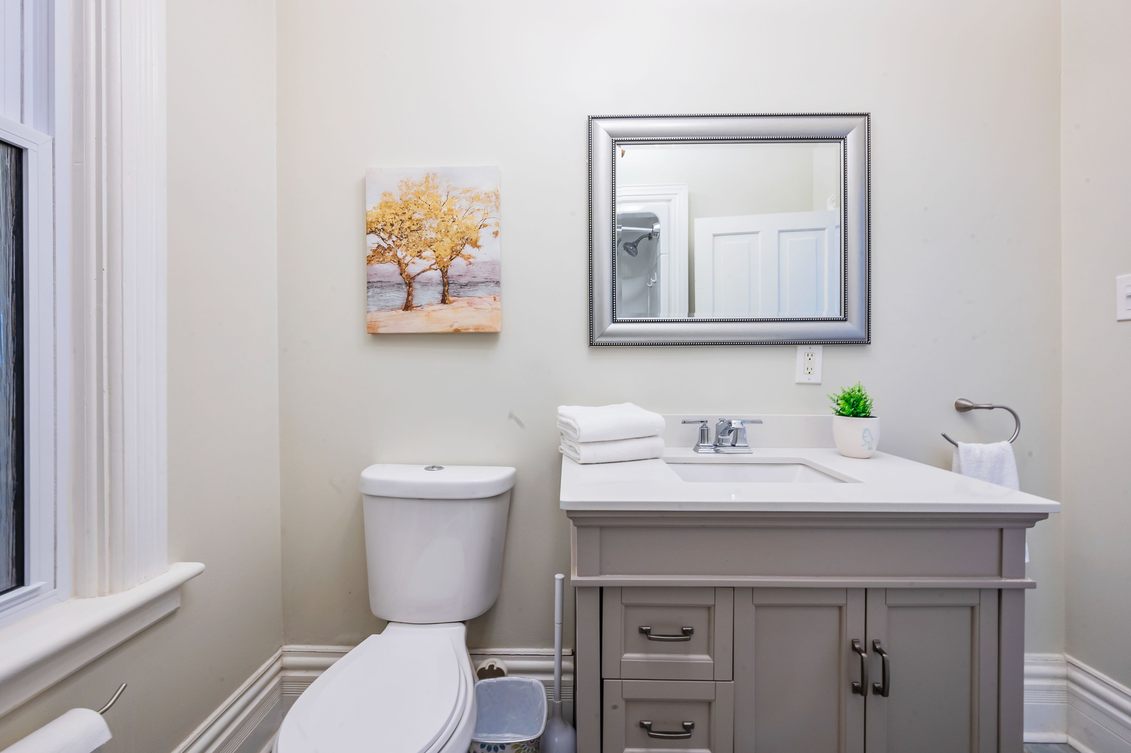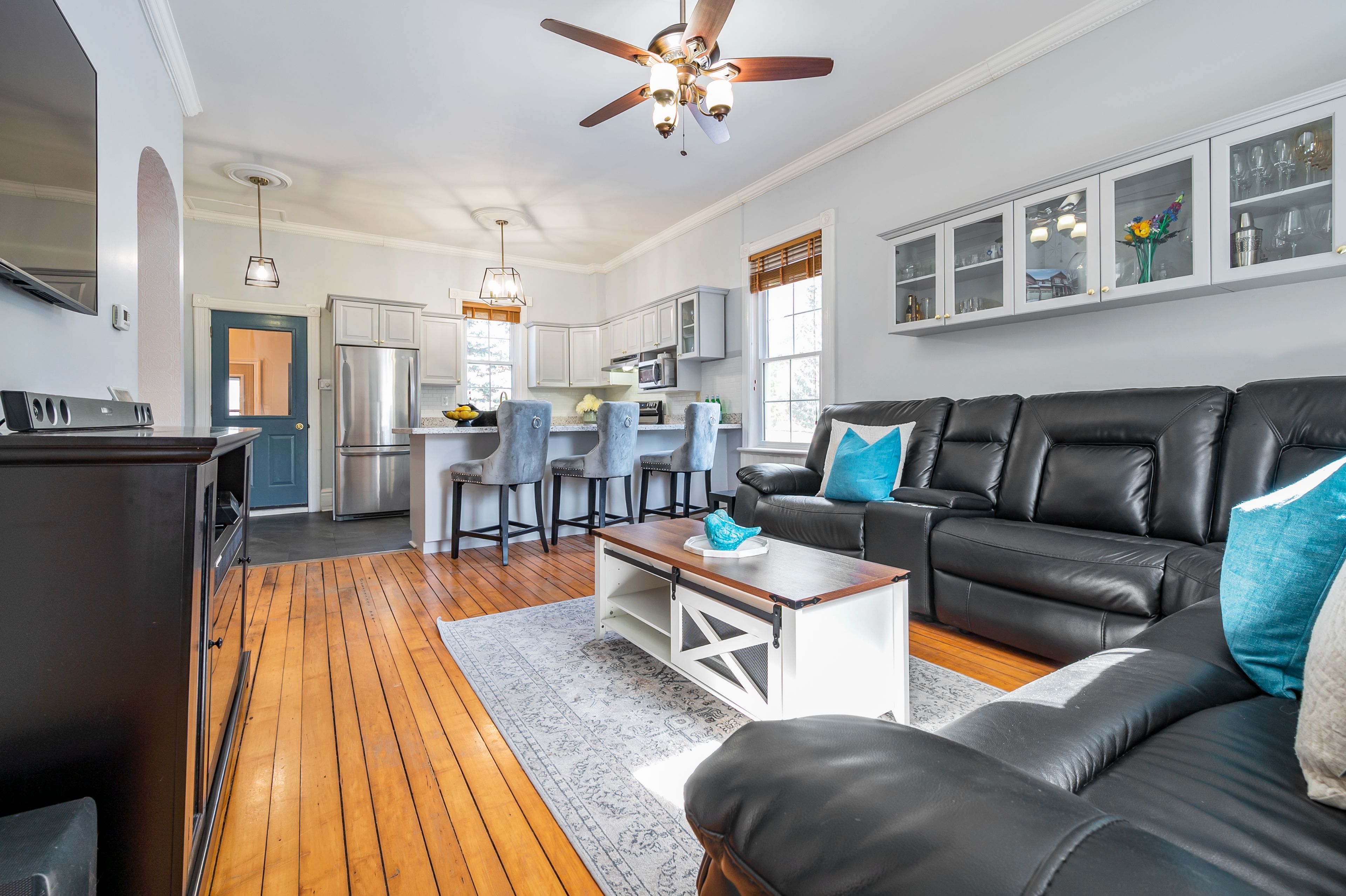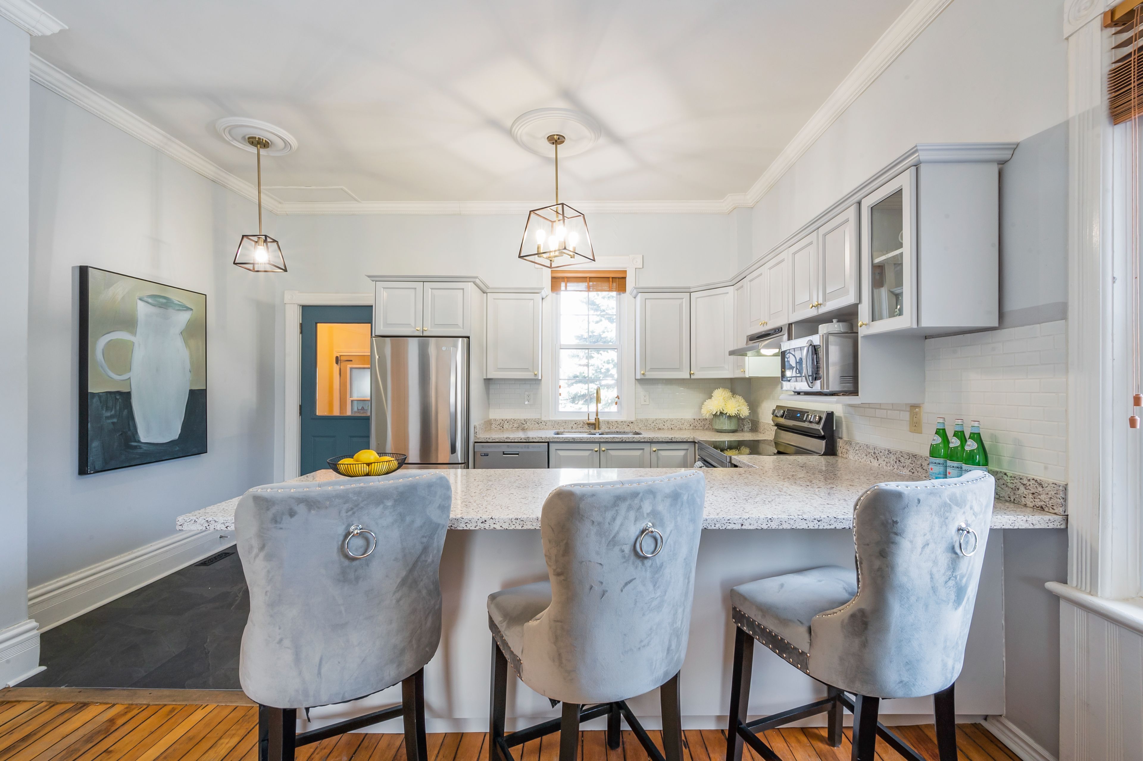 • Modern kitchen with quartz counters and stainless steel appliances for easy cooking.