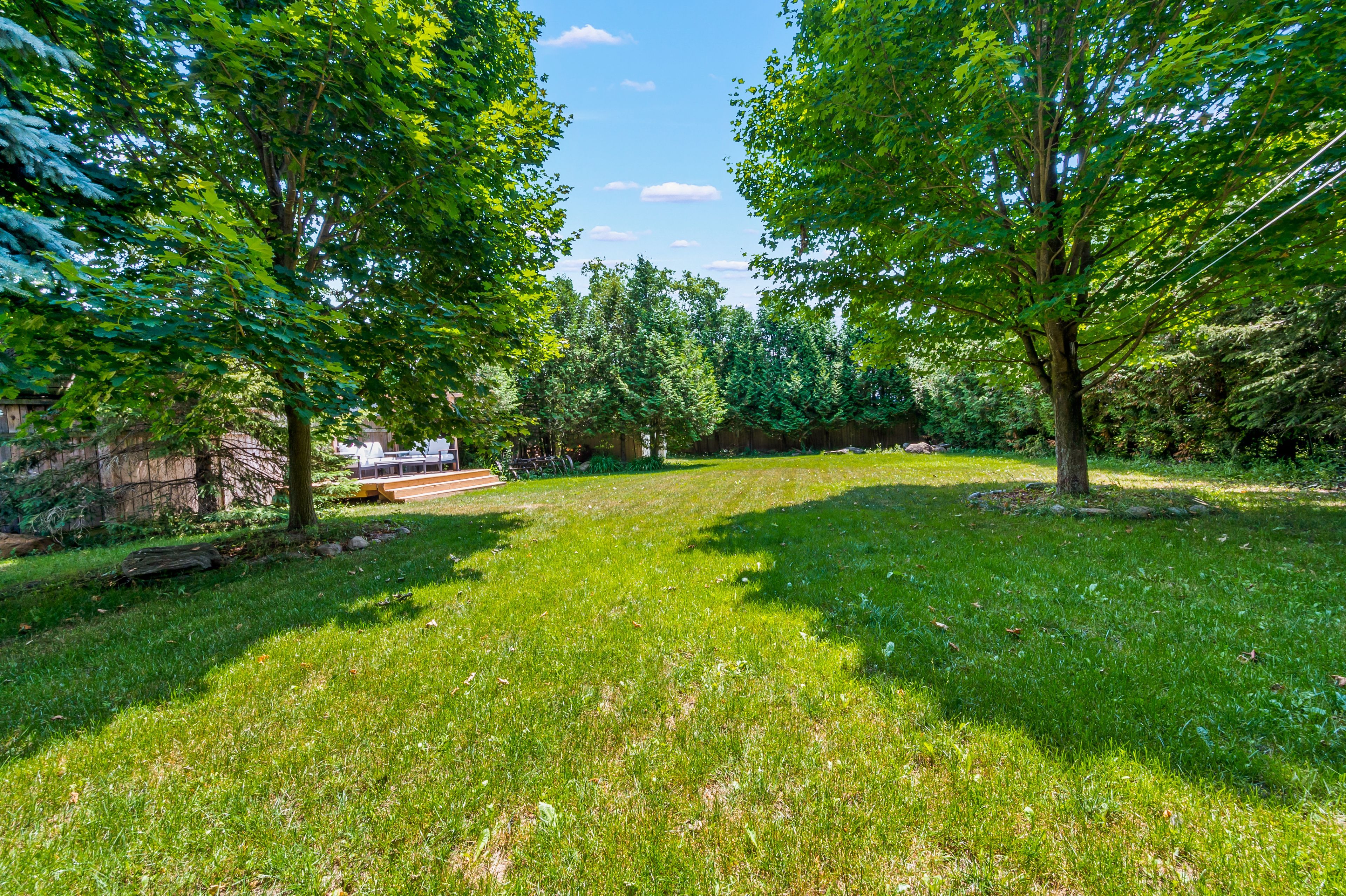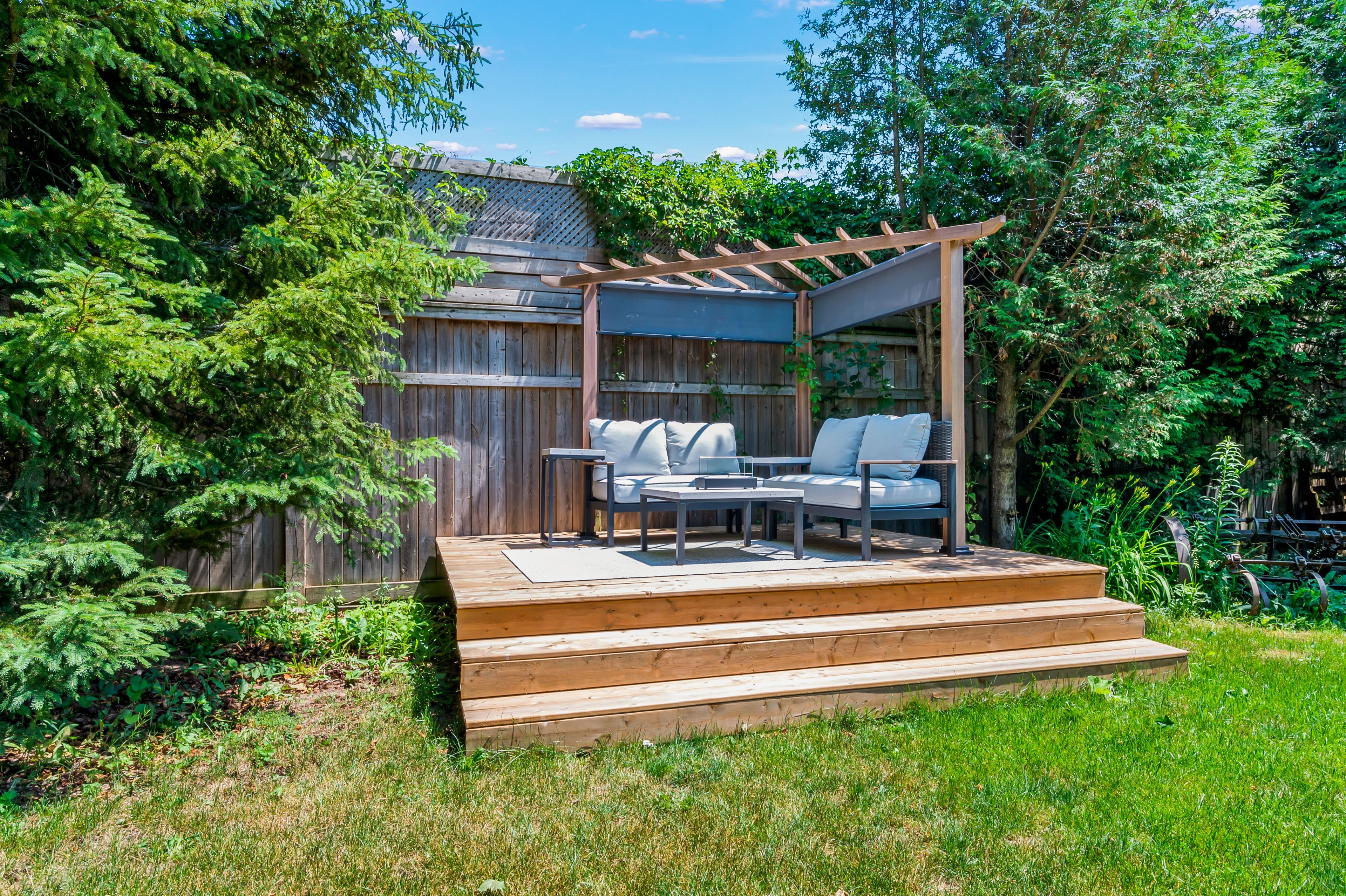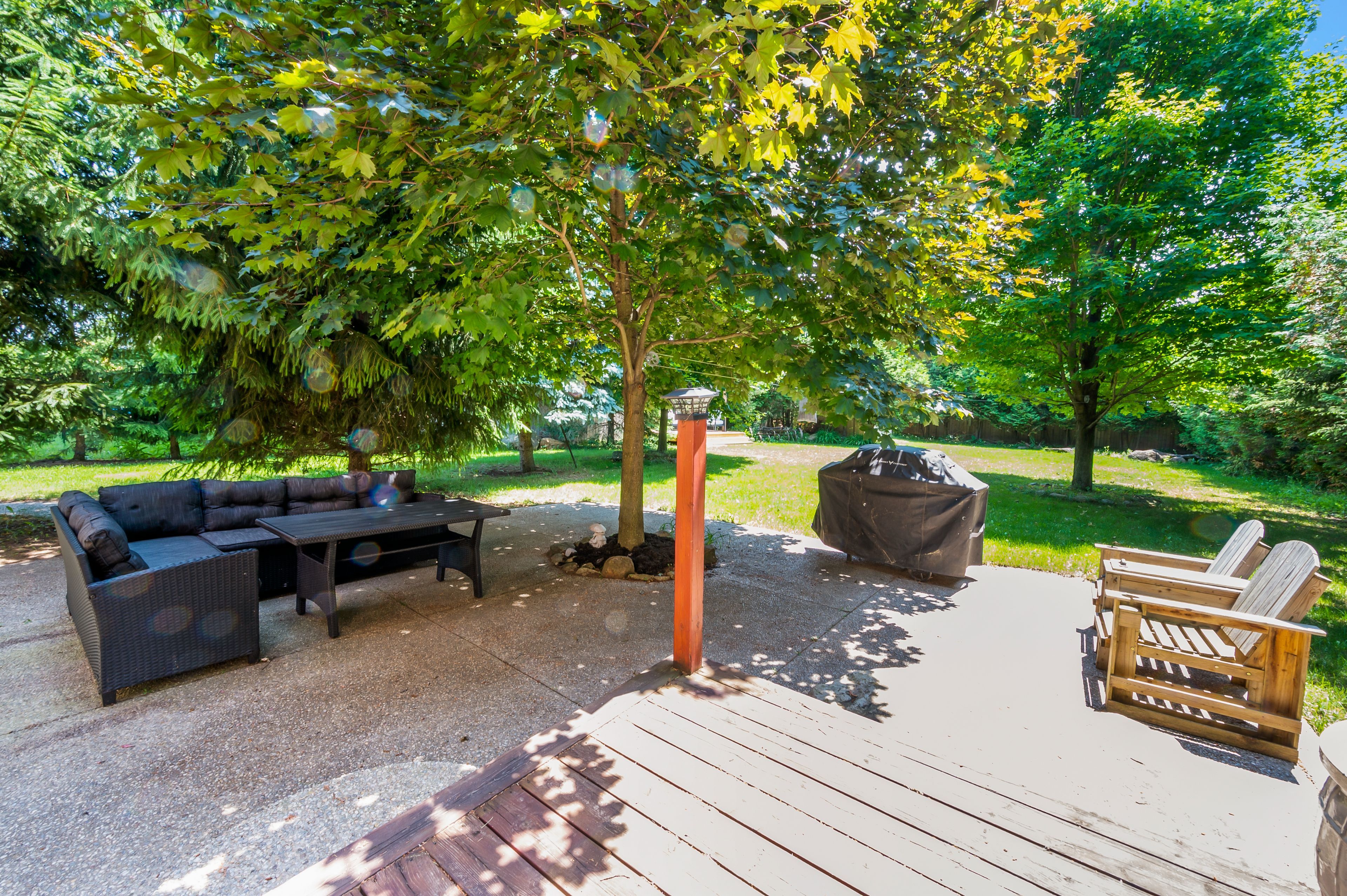 • Private backyard retreat with patio, fire pit, and mature trees for relaxation.