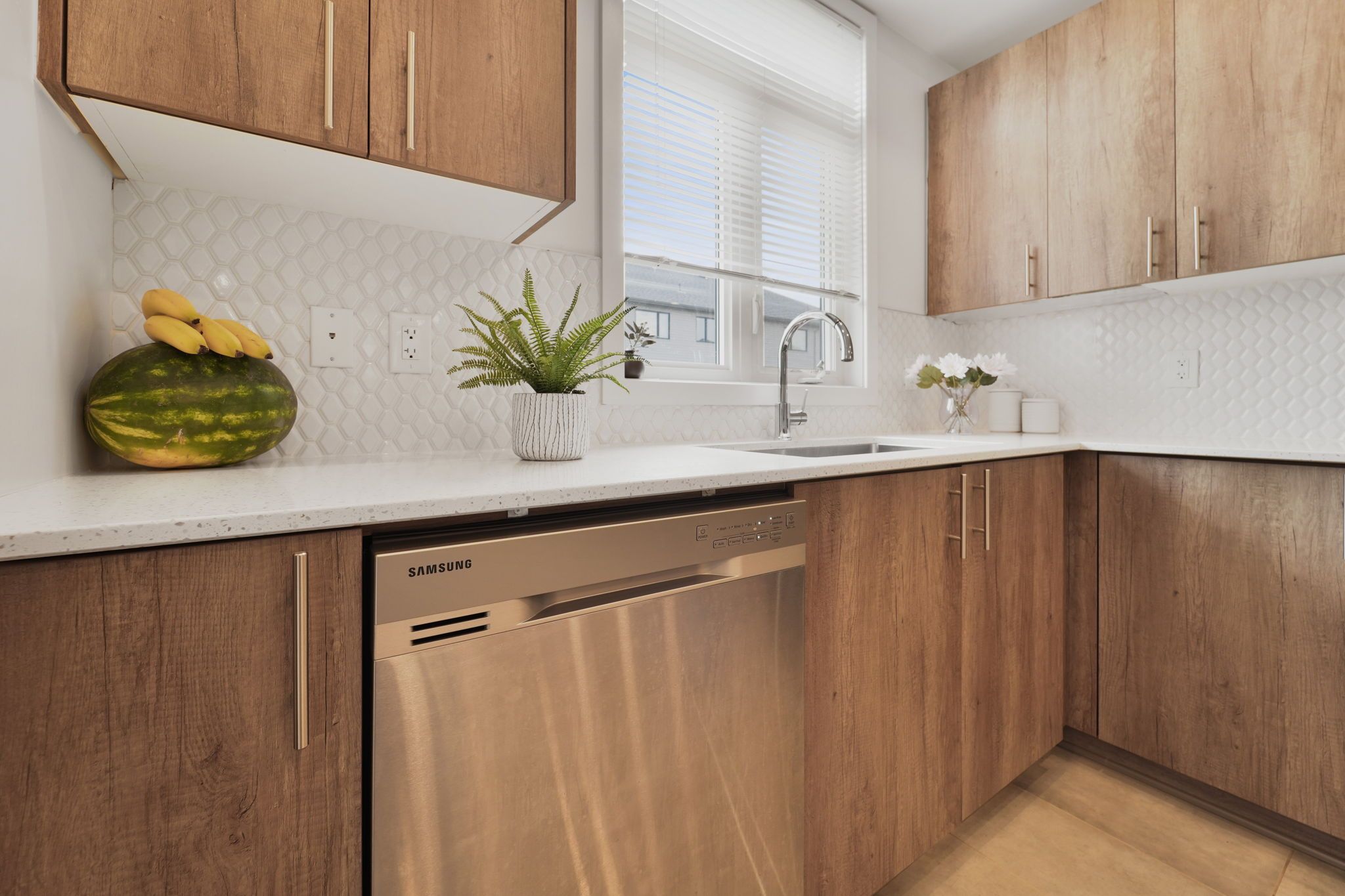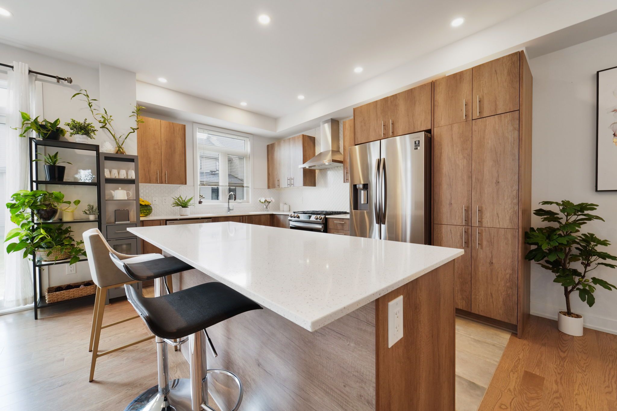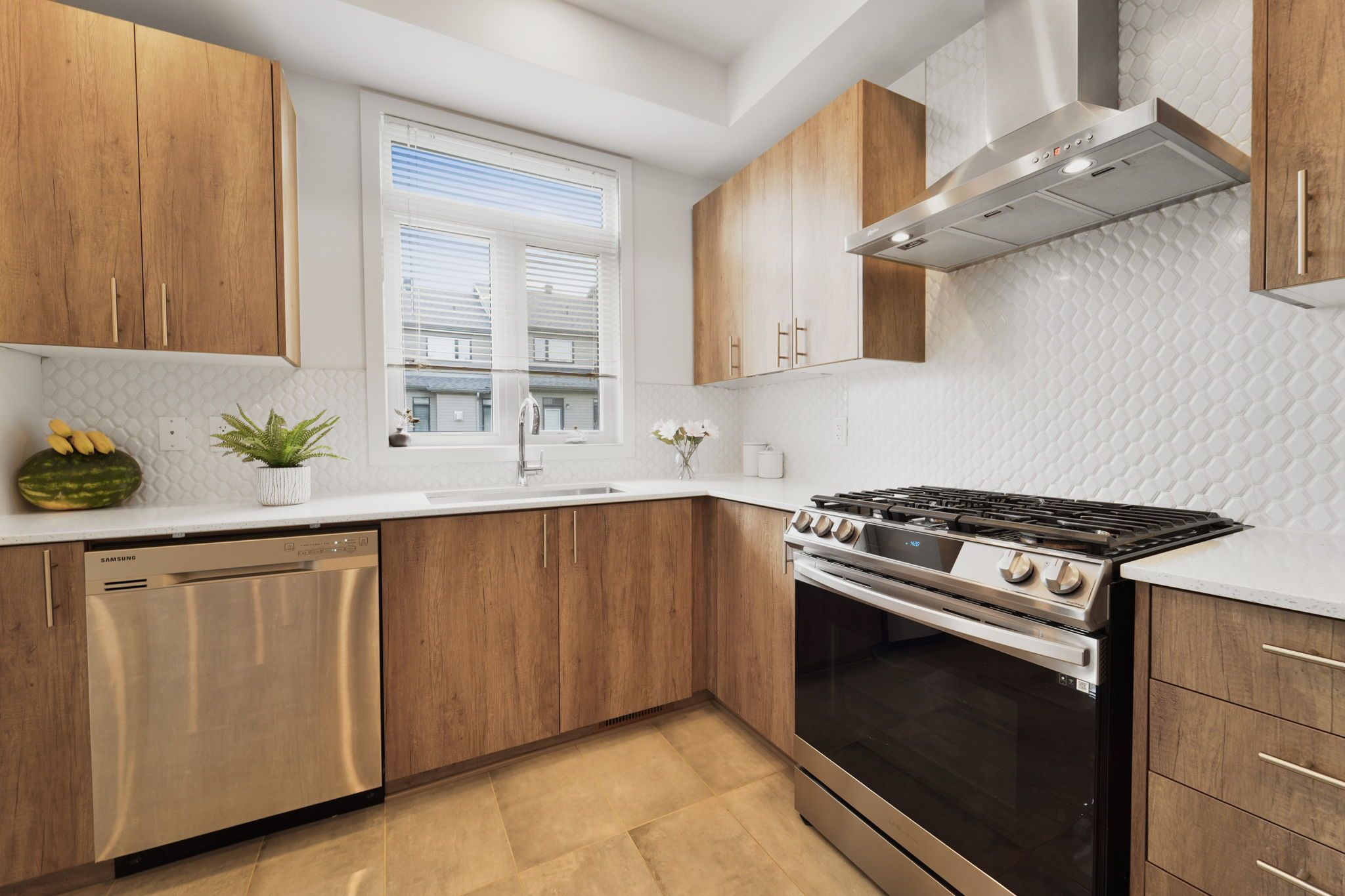 • Stylish kitchen with quartz countertops and stainless steel appliances.