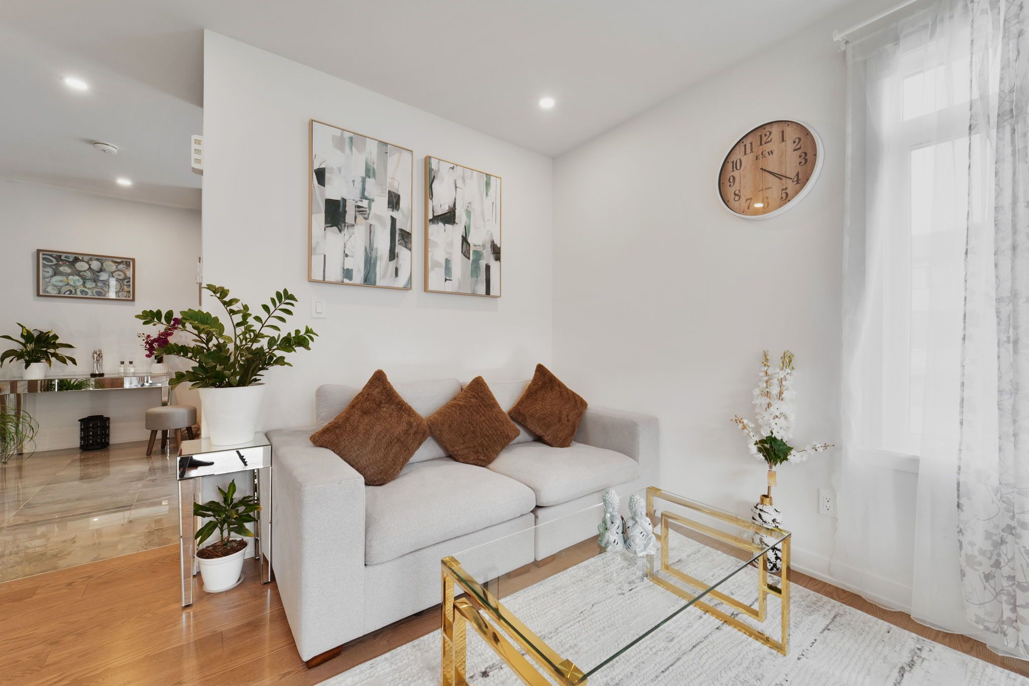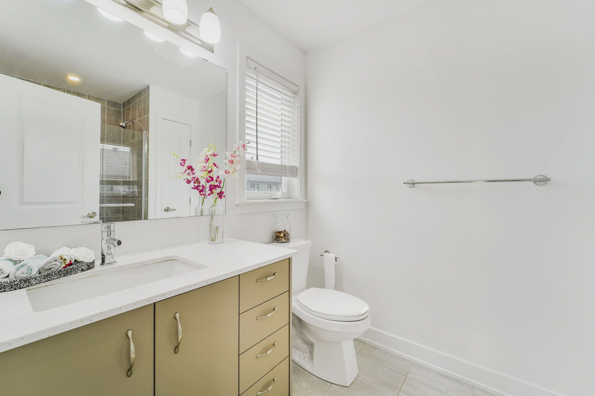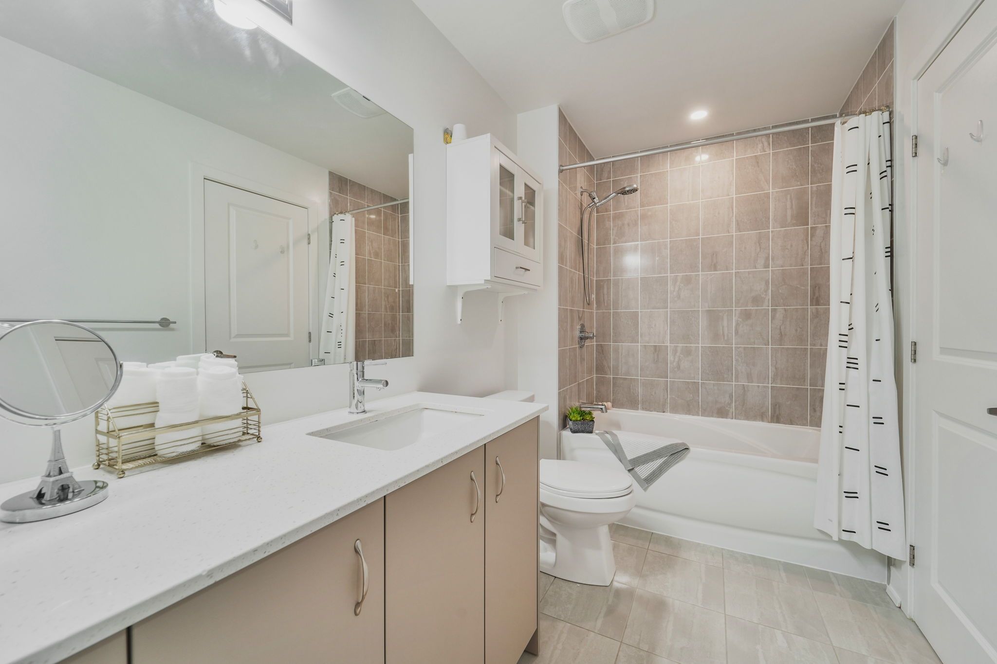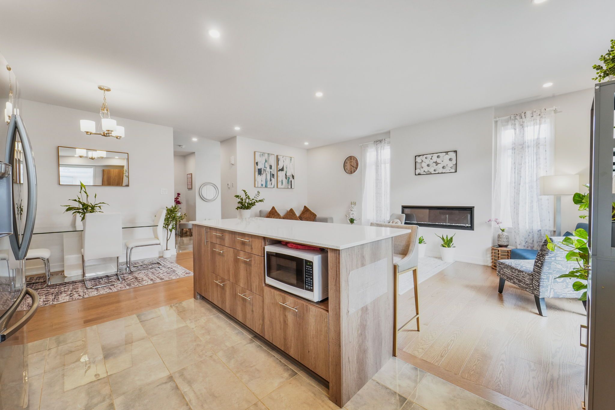 • Stylish kitchen with quartz countertops and stainless steel appliances.