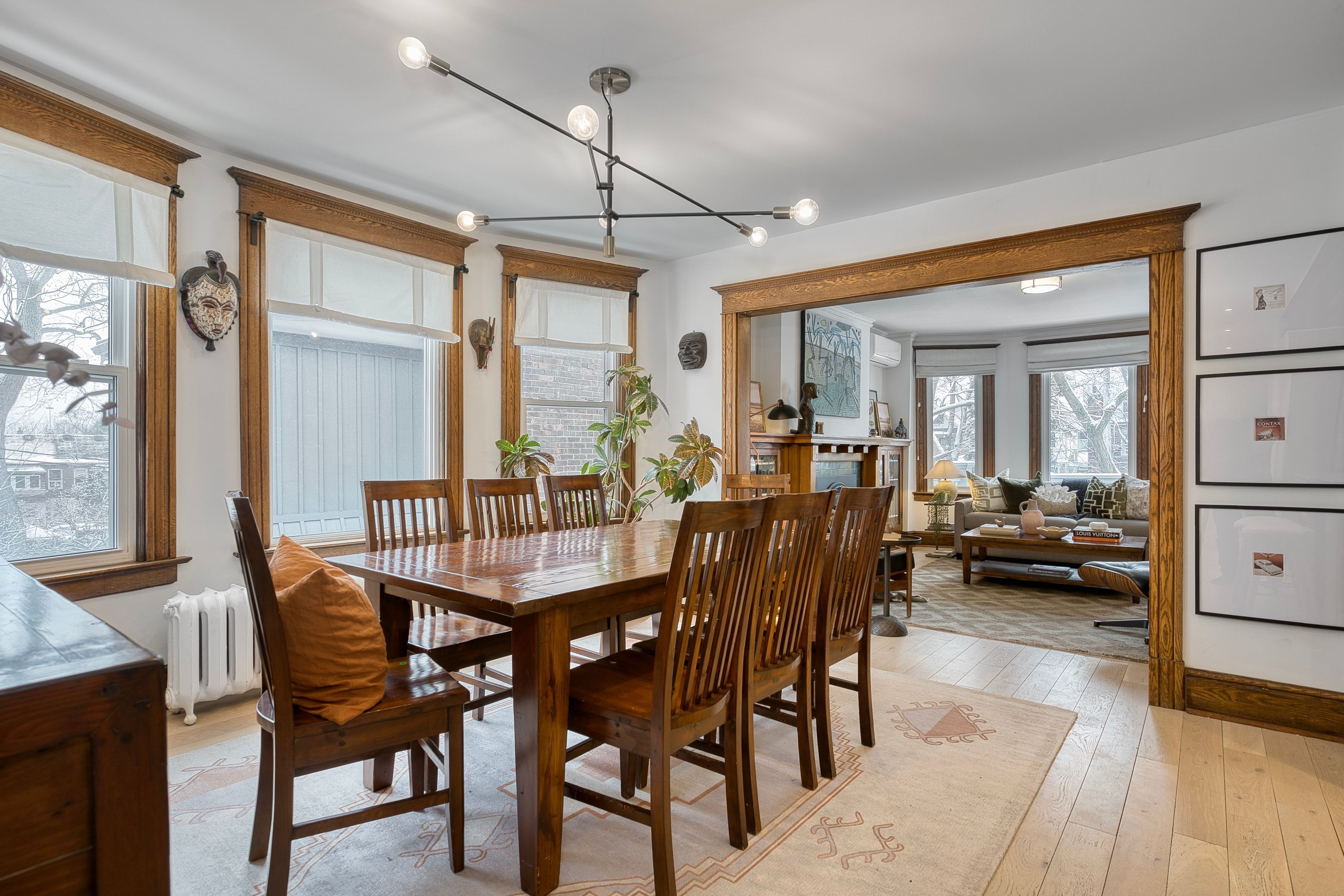Stunning arts & crafts duplex in high park! This exquisite detached residence blends timeless architectural character with exceptional modern design, offering 4,120 sq. Ft of finished living space across three levels plus a beautifully renovated basement suite. An extraordinary opportunity for multigenerational living, premium rental income, or an expansive owner's retreat. The main floor showcases classic arts & crafts detailing, original built-ins with leaded glass doors, rich wood trim, & an ornamental fireplace in the formal living rm. A separate formal dining rm enhances the home's elegance, while 2 spacious bedrooms-one ideal as a sunroom or office-and a renovated 4-piece bath complete this level. There are 2 ductless a/c units that cool this main floor unit. The upper suite, spanning the 2nd and 3rd floors, has been fully renovated & thoughtfully designed by renowned felix leicher of baukultur. The chef-inspired kitchen features a large island, integrated appliances (miele oven & island cooktop), & a walk-in pantry. It flows seamlessly into the open-concept living & dining spaces with original woodwork, custom cabinetry, & a gas fireplace. This level also includes 2 generous east-facing bedrms with wall-to-wall windows, a powder rm, a large laundry rm, & abundant storage. The 3rd floor offers 2 additional spacious bedrooms, including one with a w/o to a private tree-top balcony. The luxurious primary suite impresses with cathedral ceilings, floor-to-ceiling windows, wall-to-wall built-in dressers, and a spa-like 5-piece ensuite. A skylit family rm, serene meditation space, additional powder rm, and extensive closet space complete this remarkable level. Hardwood floors run throughout, and the owner's suite is equipped with 7 ductless a/c units for optimal comfort. The recently renovated basement suite features a separate entrance, quartz kitchen with new stainless steel appliances, stylish 3-piece bath, and generous living and bedroom areas-currently vacant.