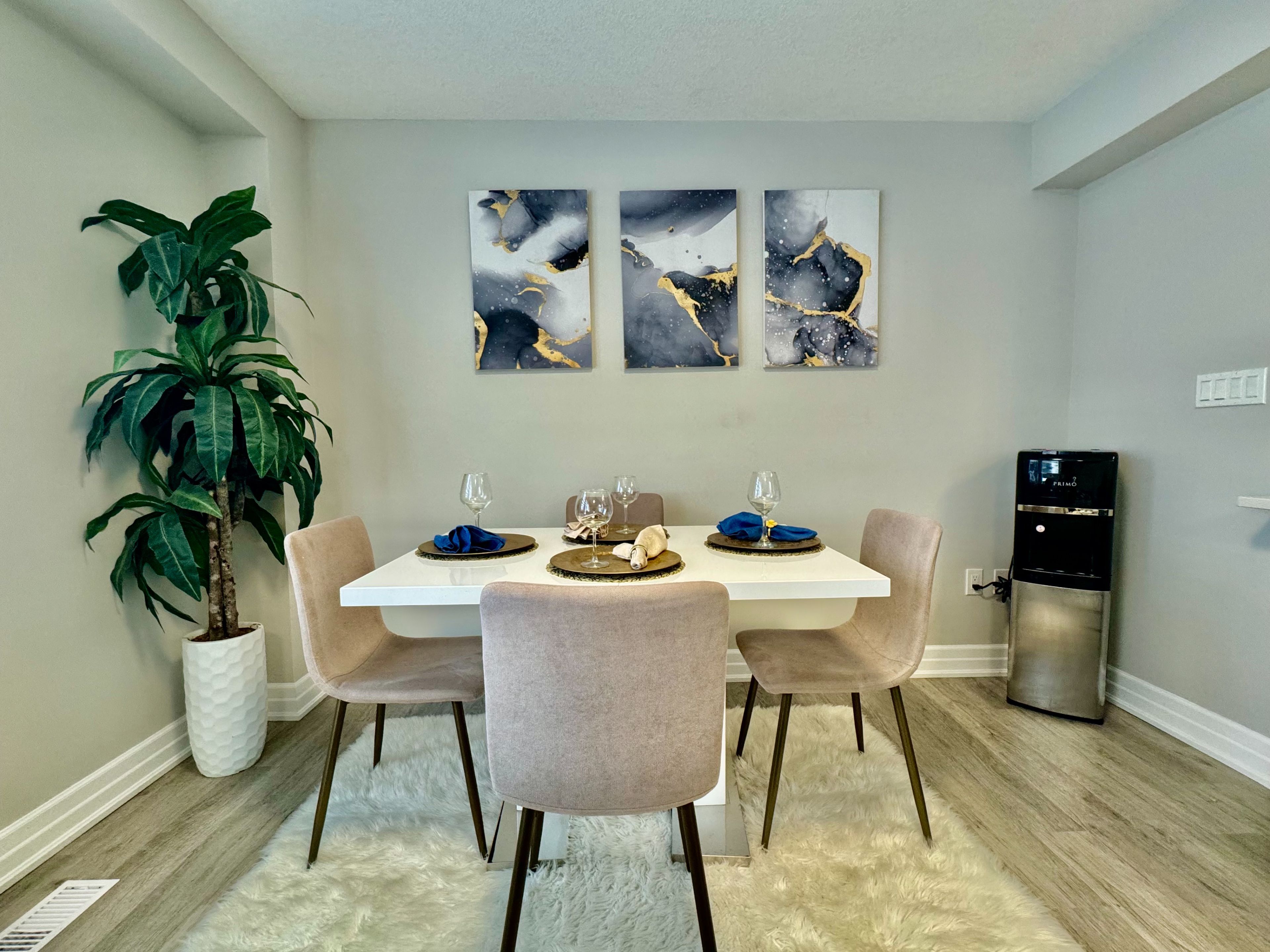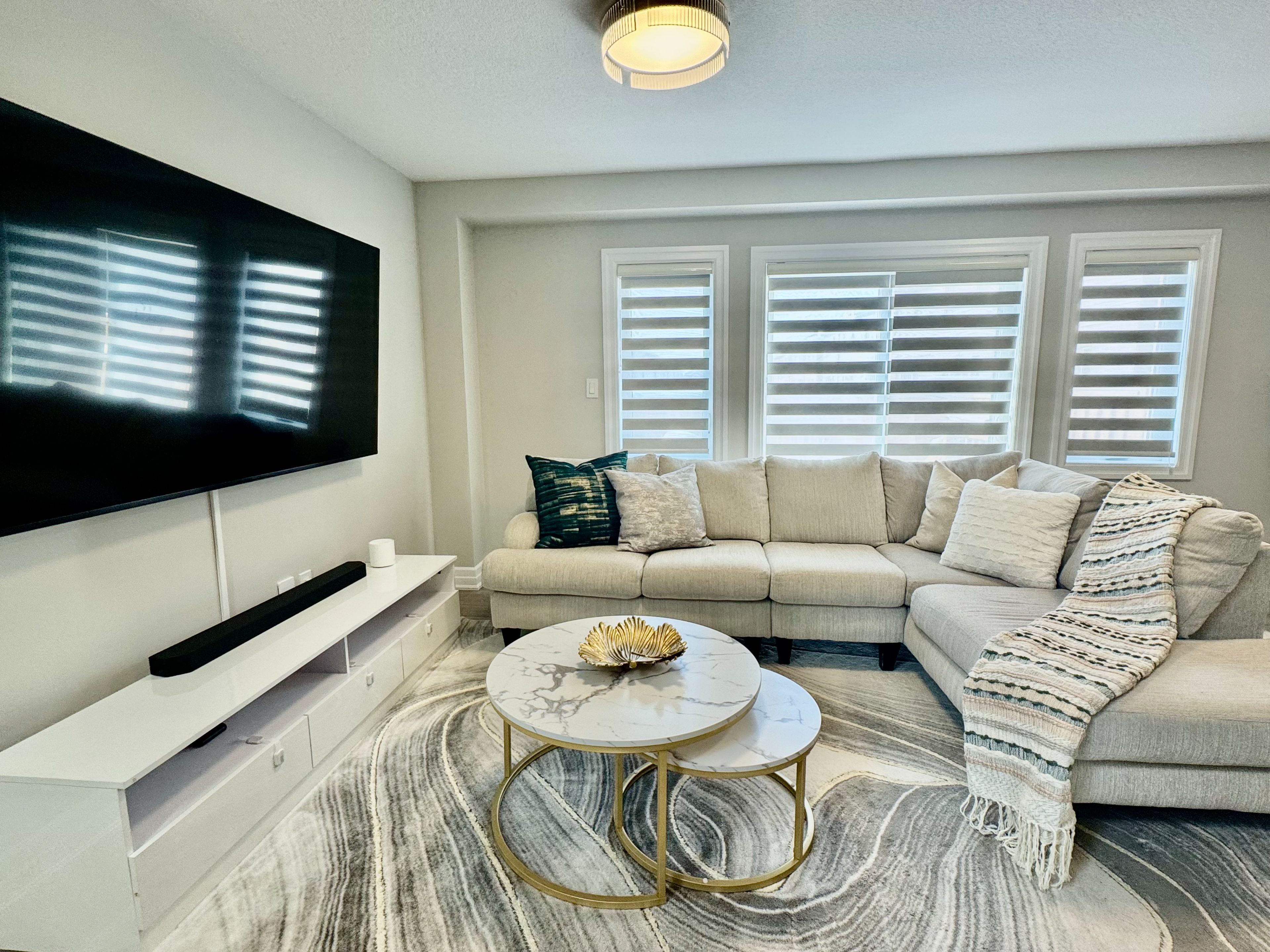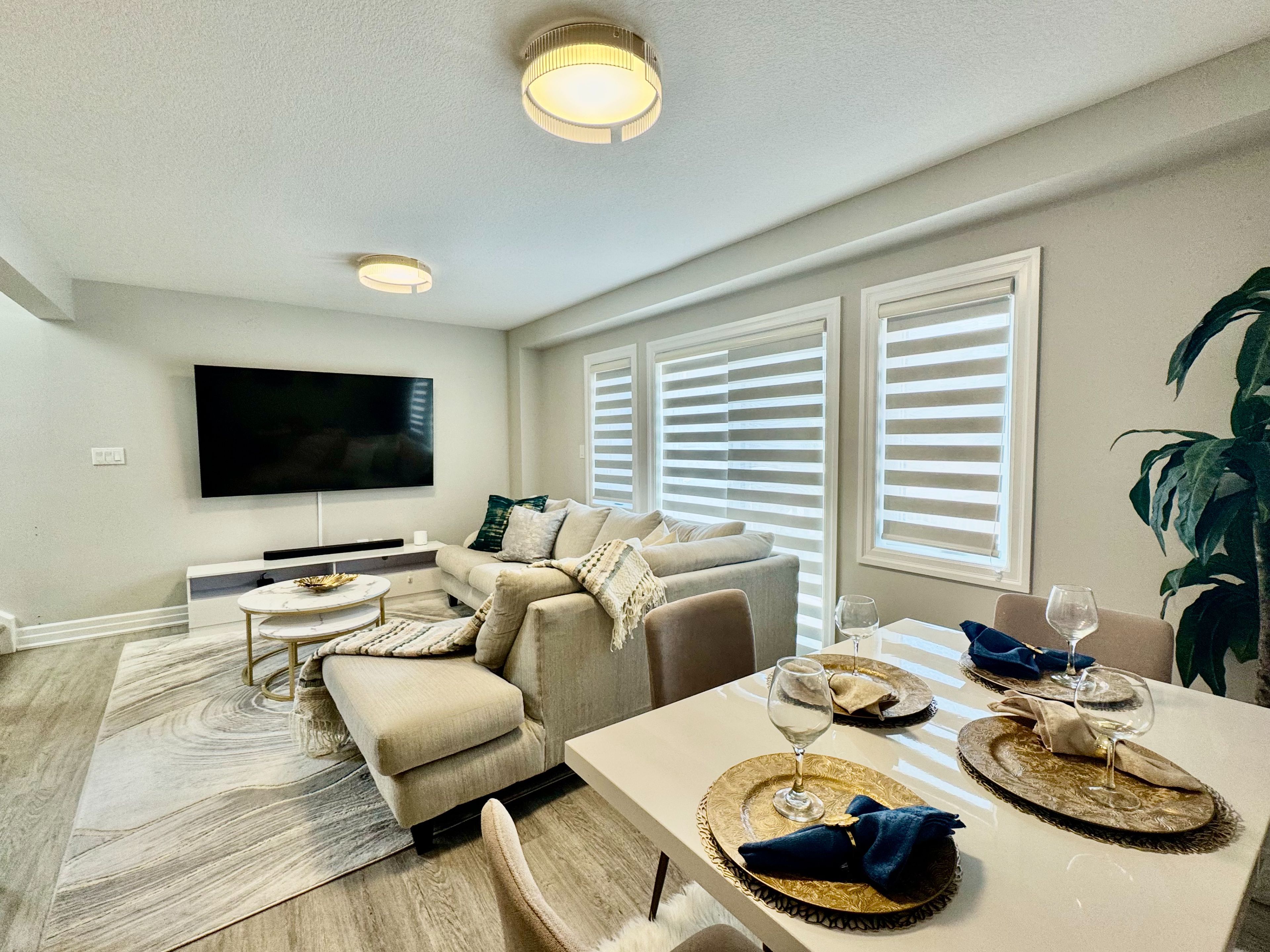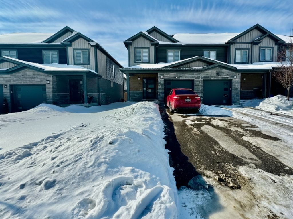 End-unit contemporary freehold two-storey townhome located in a desirable, family-friendly neighbourhood. This carpet-free main floor home offers excellent curb appeal with a stone, brick and vinyl exterior, single-car garage, and covered porch. The bright main floor features an open-concept living and dining area with sliding patio doors leading to a private backyard, along with an upgraded kitchen complete with stainless steel appliances, ro system, granite countertops, modern cabinetry, and ample counter space, plus a convenient powder room and inside entry from the garage. The second level includes three spacious bedrooms and two full bathrooms, highlighted by a large primary suite with a walk-in closet and private ensuite, second-floor laundry, and an additional walk-in closet in one of the secondary bedrooms. The unspoiled basement offers a large window and rough-in for a 3-piece bathroom, providing endless potential for future finishing. Ideally located close to schools, parks, shopping, transit, future lrt routes, and just minutes from highway 401 for easy commuting.