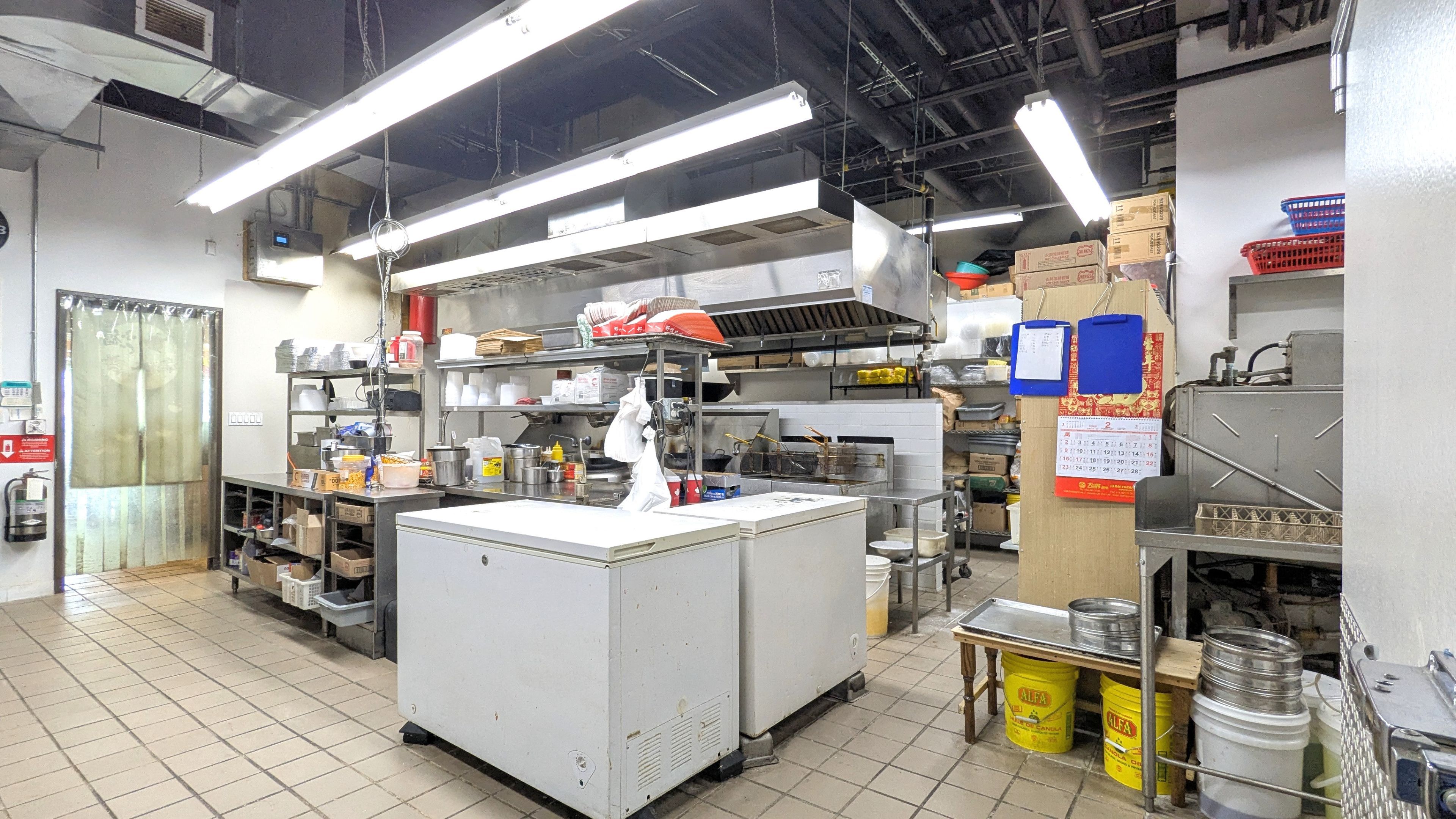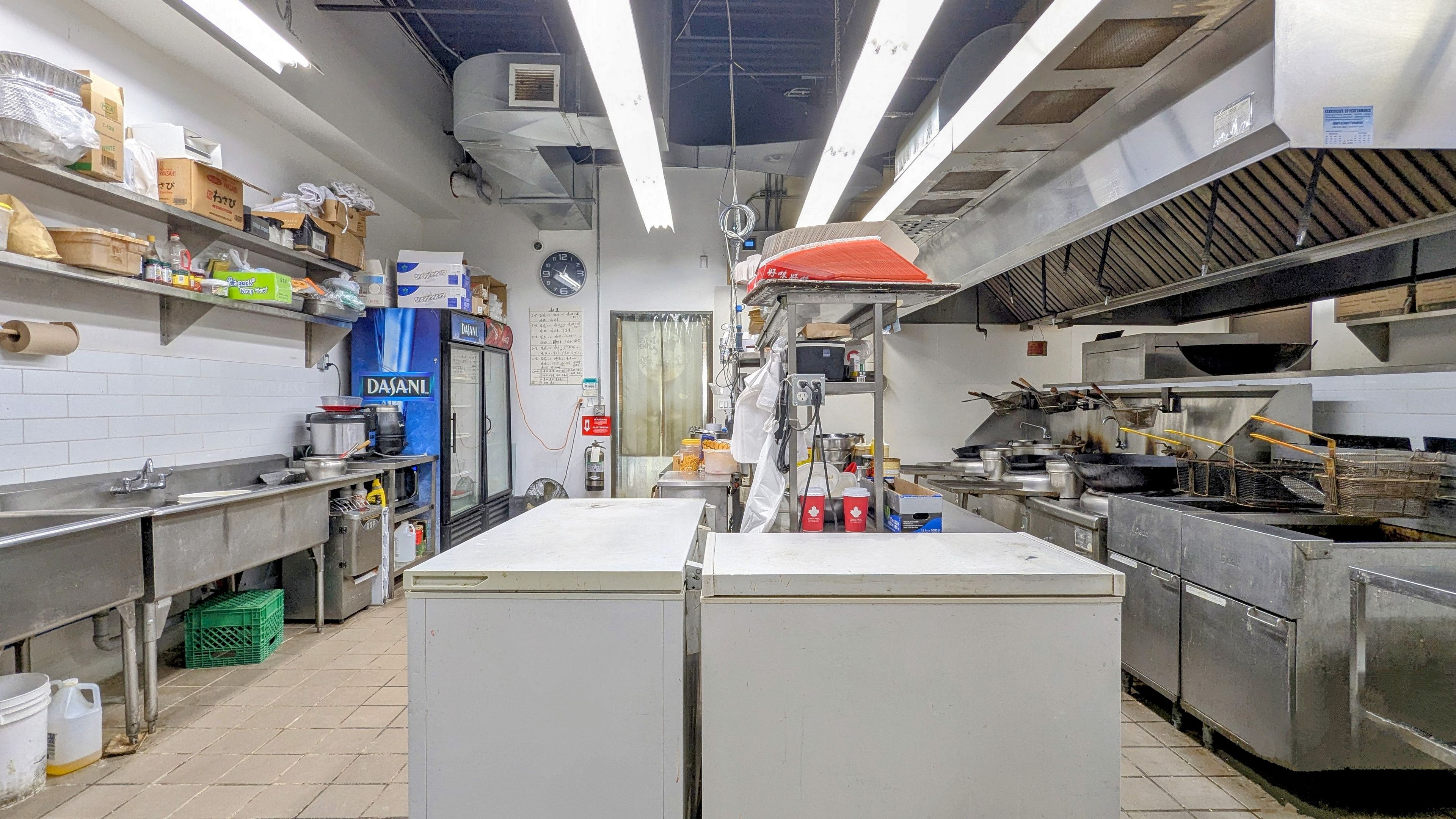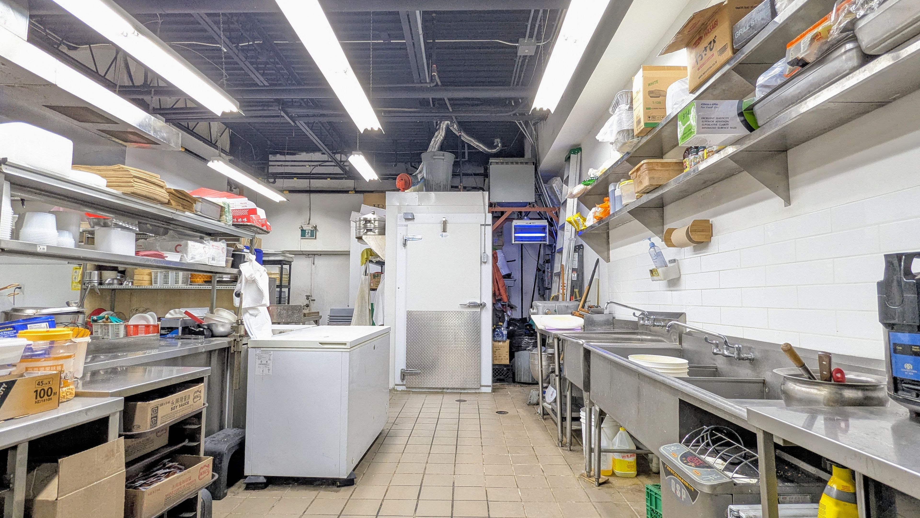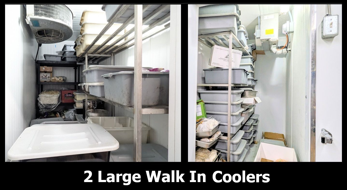 • Spacious kitchen featuring large walk-in coolers and exhaust hood.