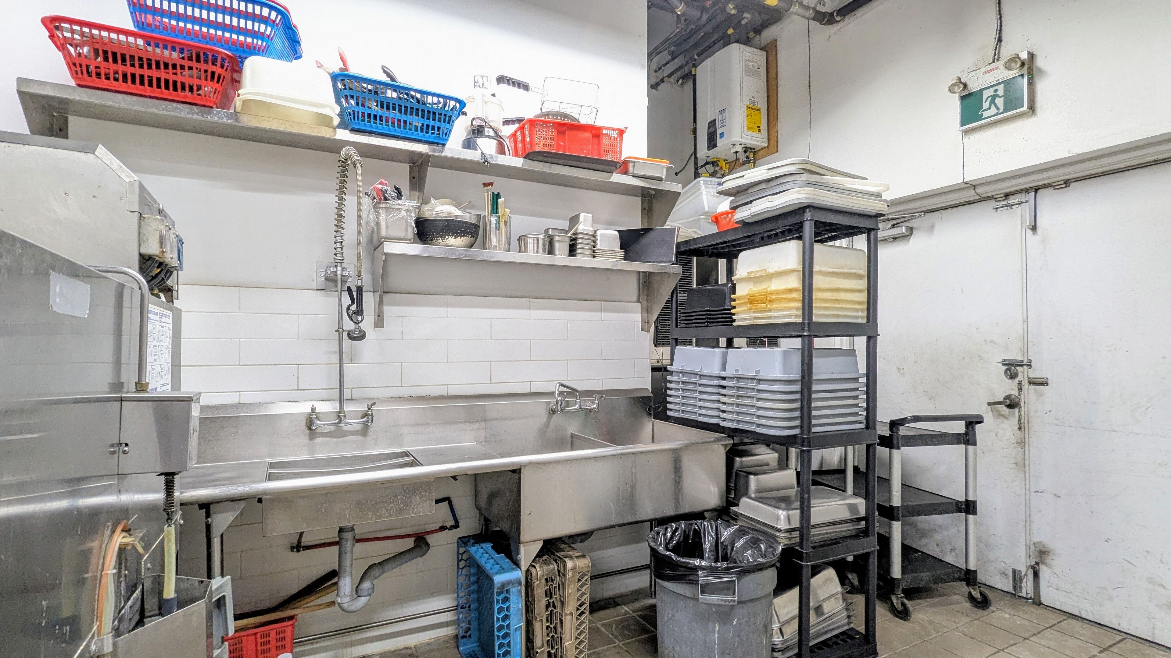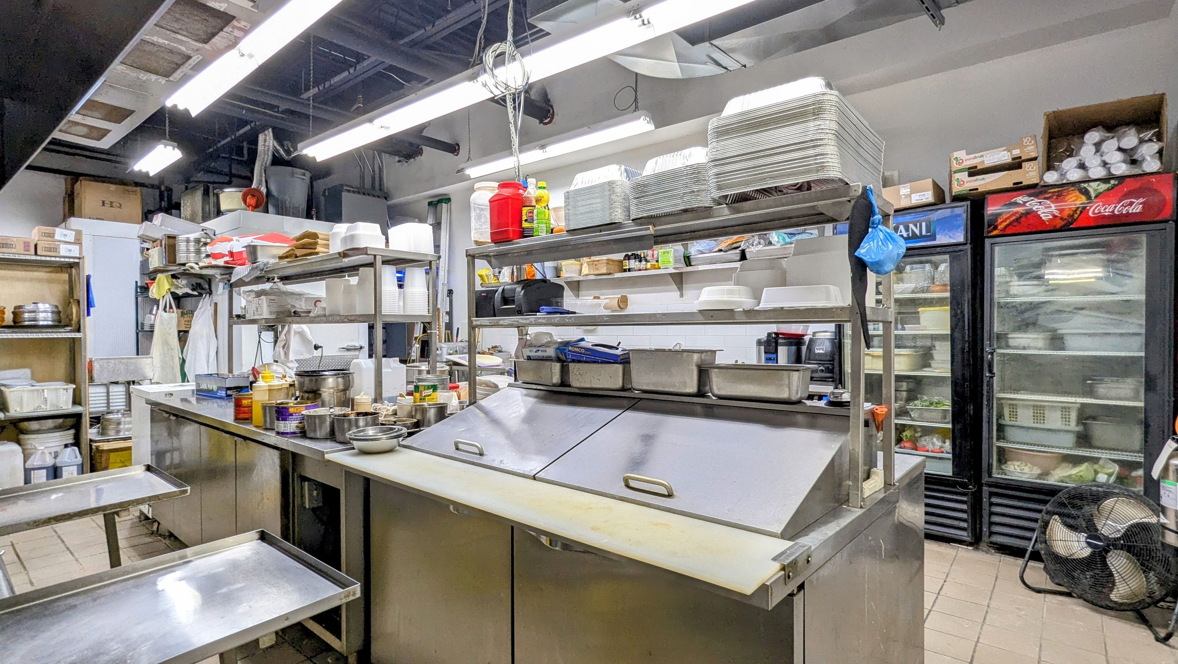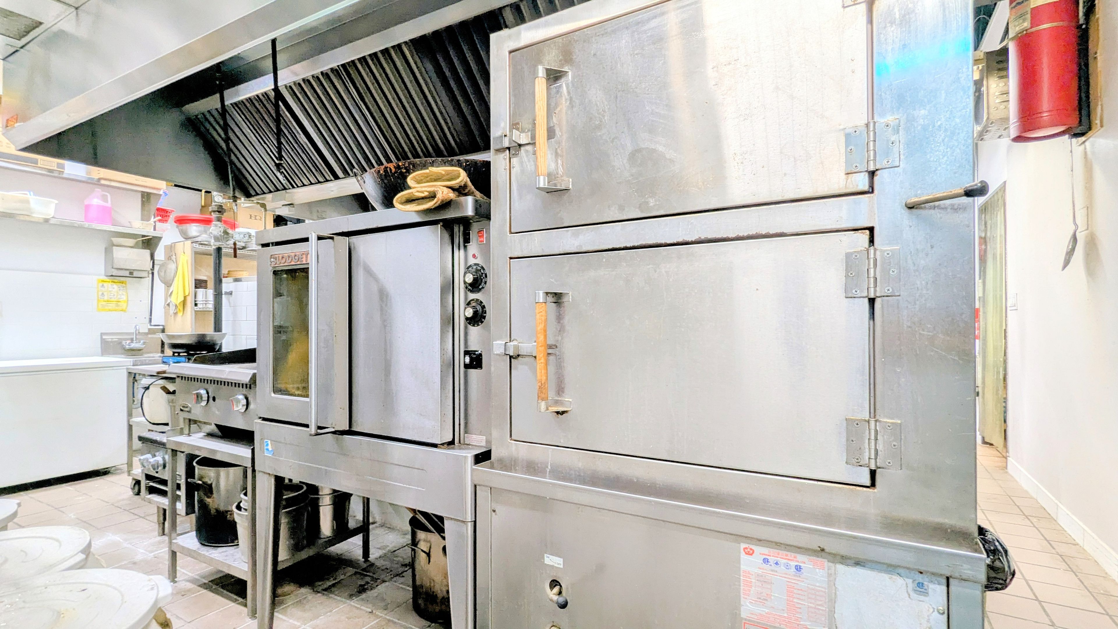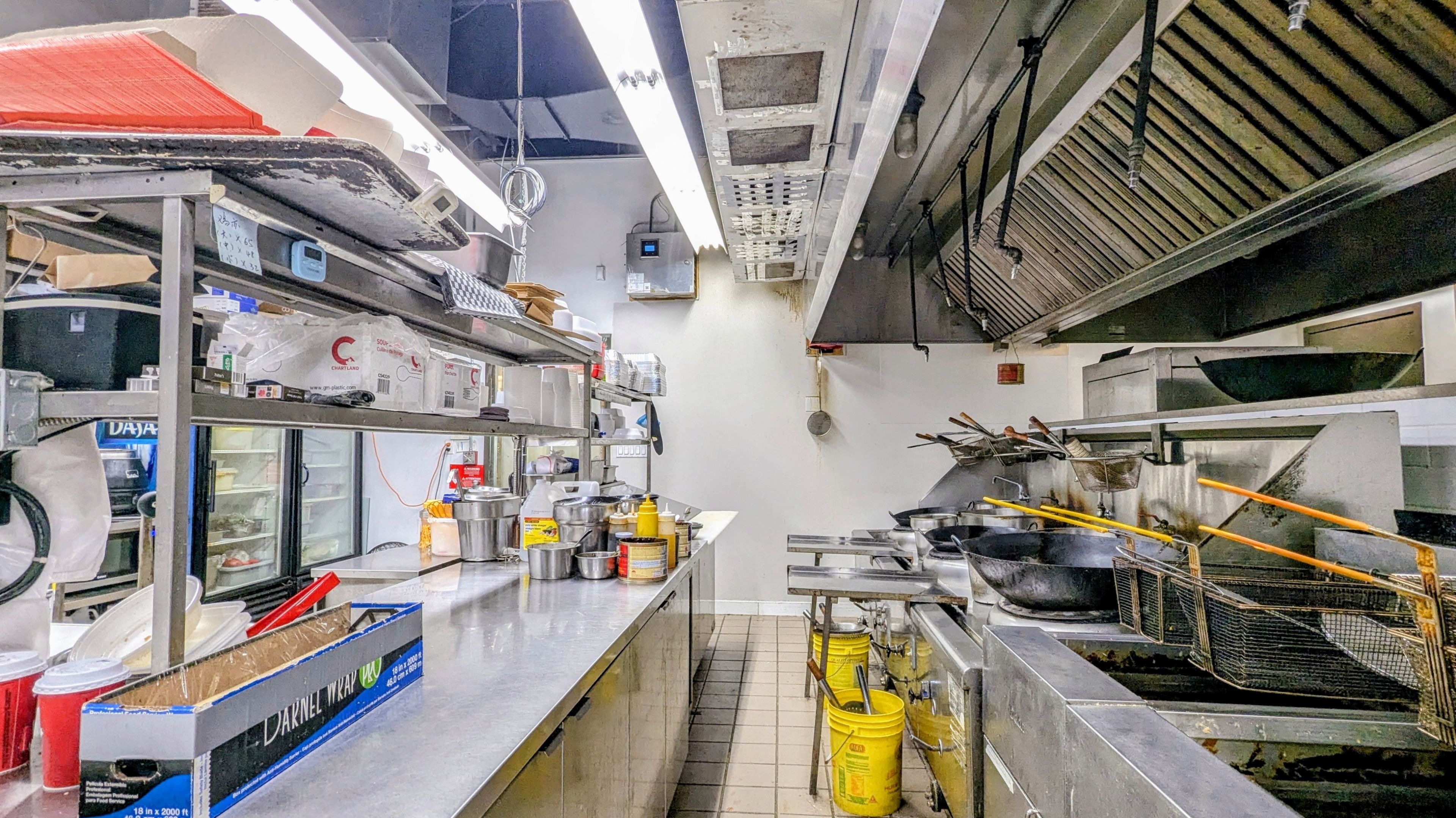 • Spacious kitchen featuring large walk-in coolers and exhaust hood.