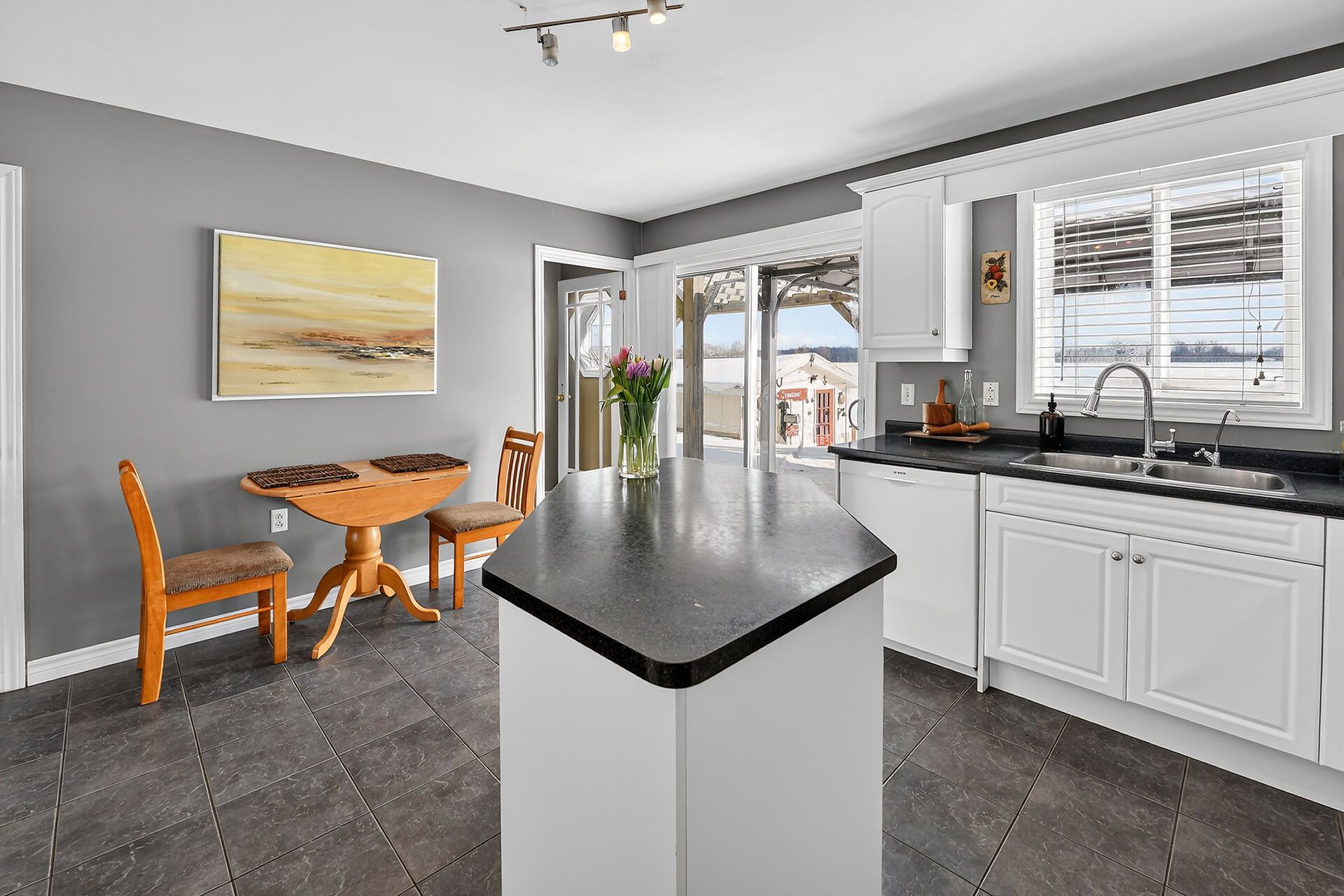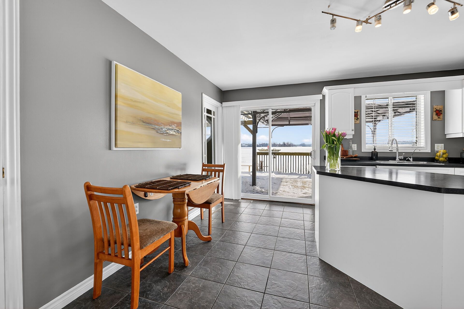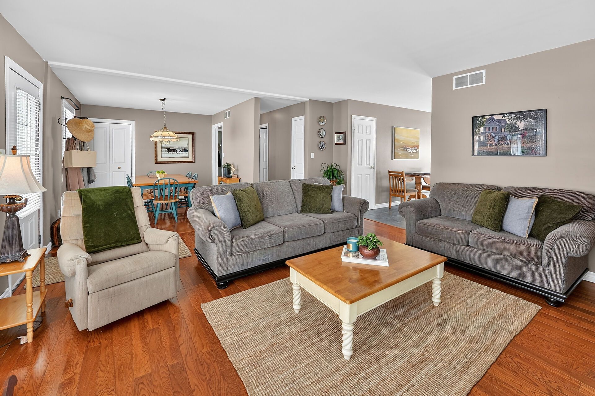 • Spacious main level with designated dining room and wood-burning stove.