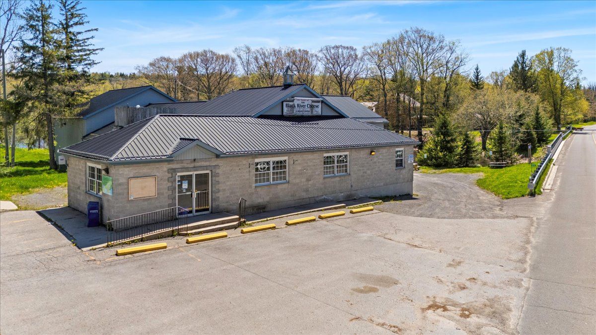 Formerly black river cheese factory with retail area 1276 sq ft and several production and storage areas total building area of over 6,000 sq ft. Large warehouse at rear with dock level loading 38 x 34 ft with 16 ft ceiling height. Truck bay 34 x 17 ft with large drive in door. Production areas have 10 ft ceiling height. Separate 2 storey house is rented to staff member of owner.