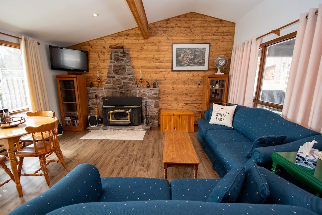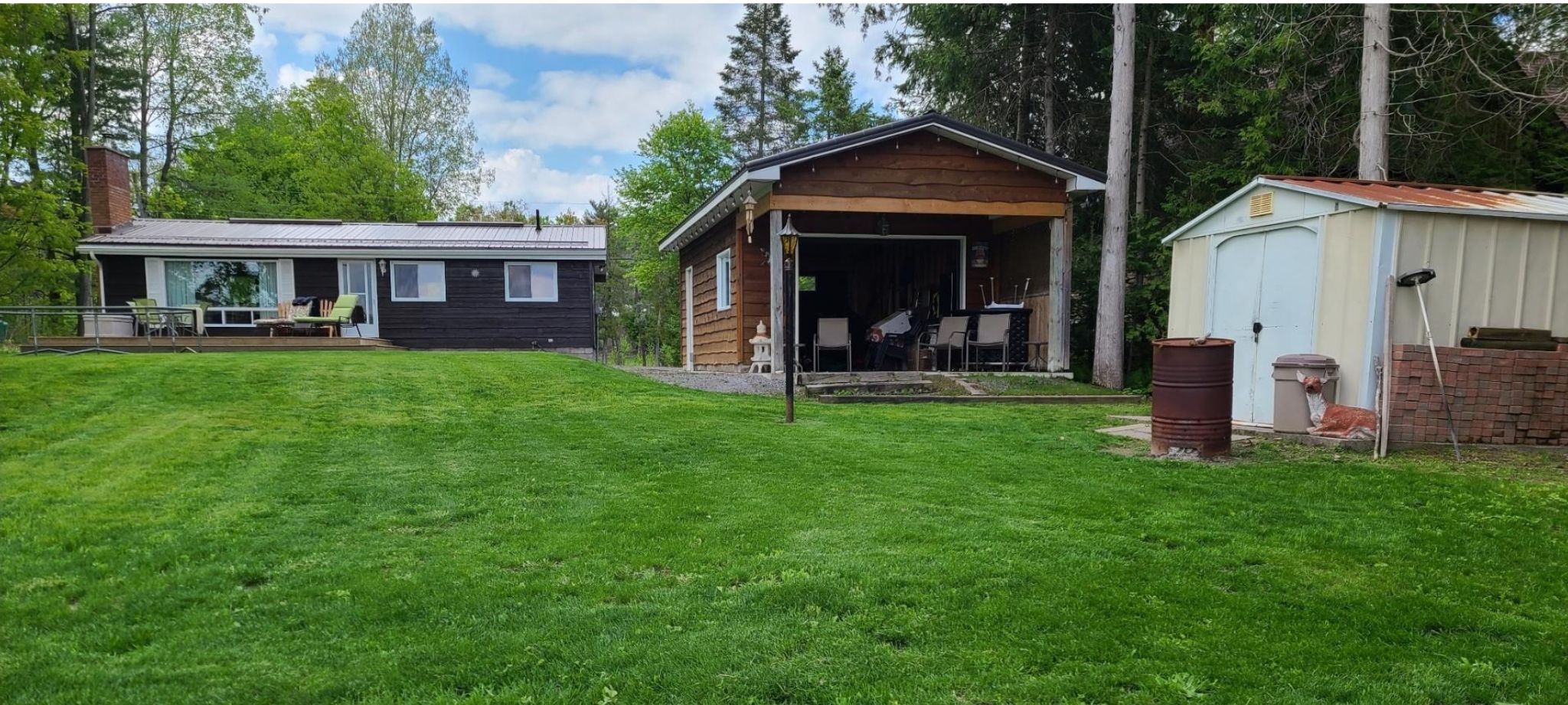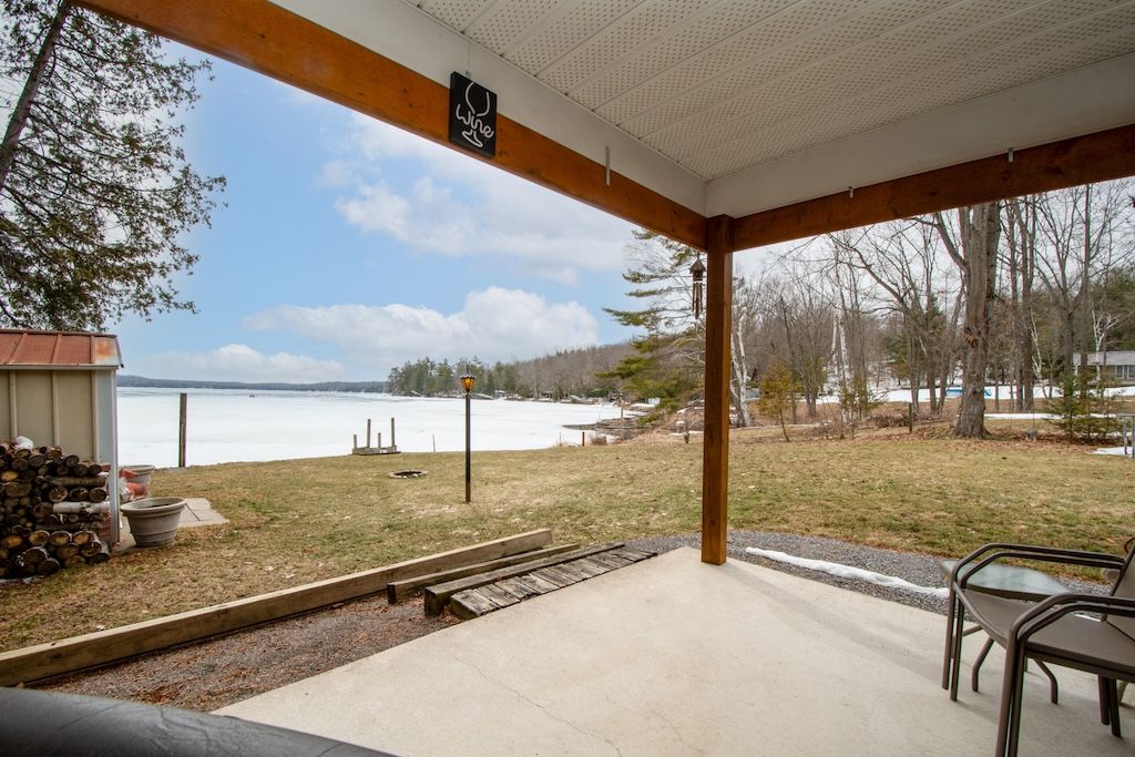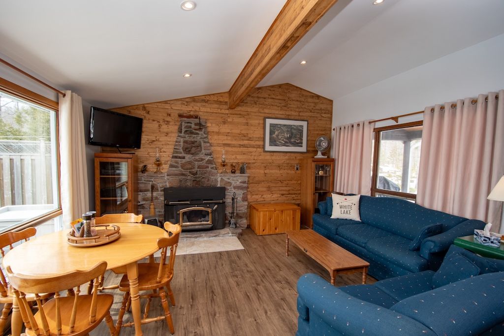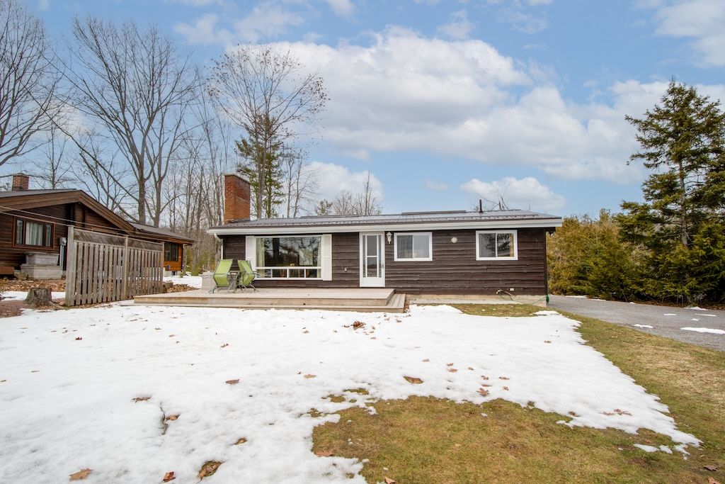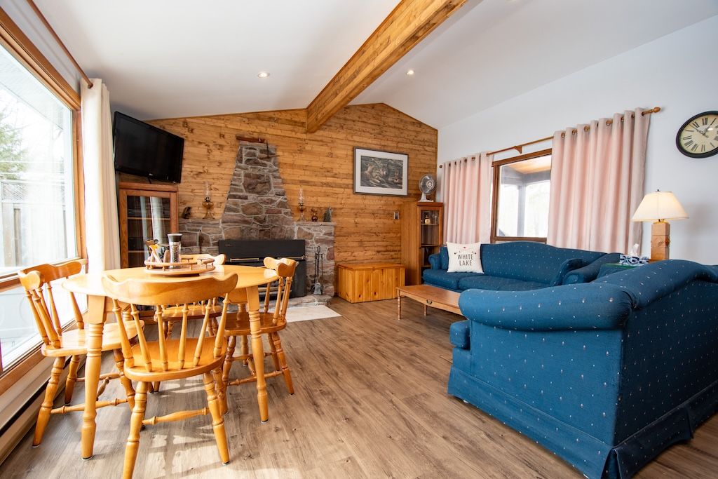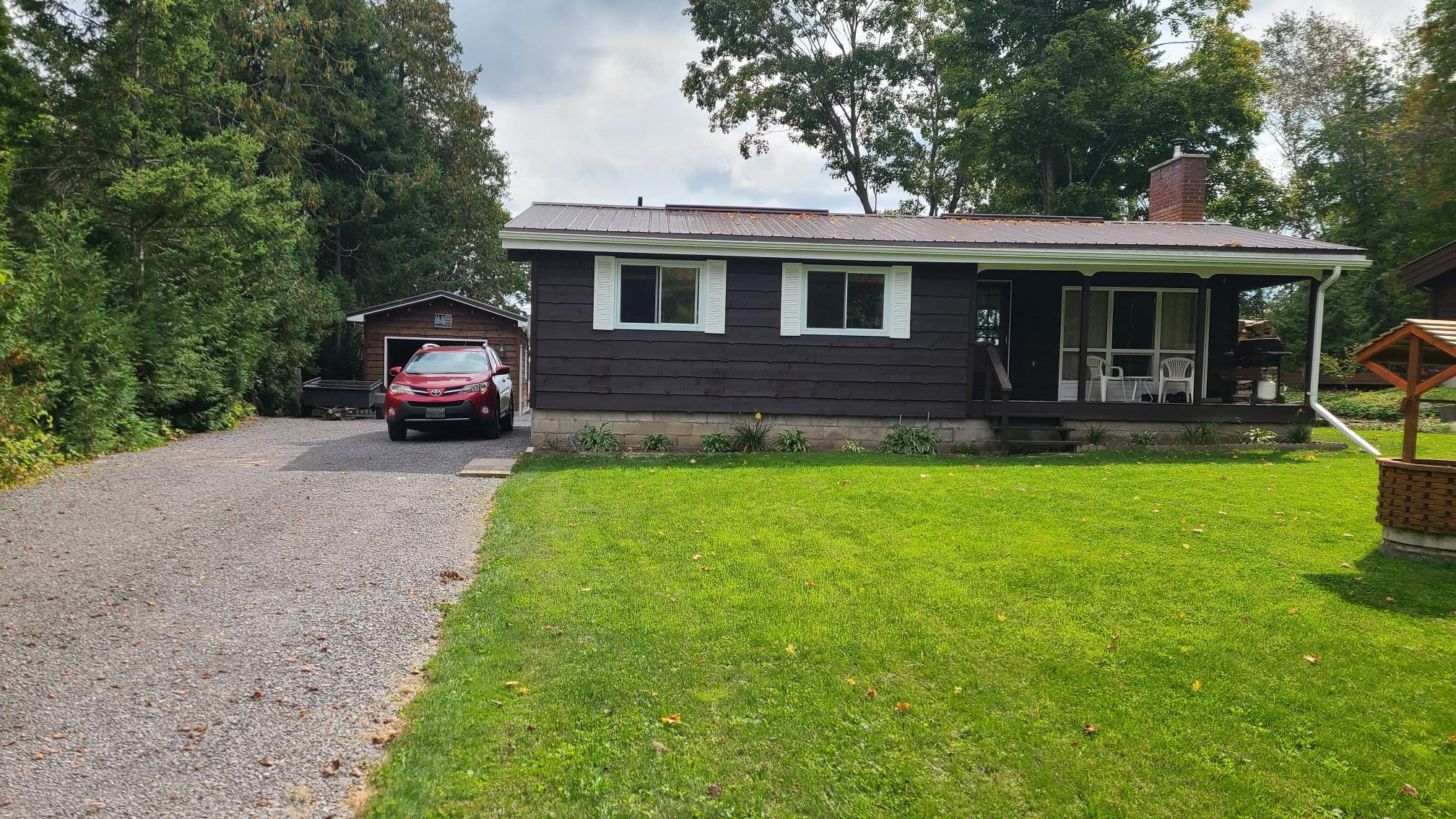 Quaint well-kept year-round home or cottage on beautiful white lake sitting on a private level property with panoramic lake views offering 3 bedrooms. This home is turn-key ready and features recent upgrades such as new flooring throughout and a steel roof. Front covered deck and rear patio to enjoy lakeside living. Open concept kitchen, dining area and living room which features a beautiful stone fireplace. Extra large window in the living room for stunning lake views year-round. Matching appliances with eat-in kitchen island. Includes modernized bathroom with updated walk-in shower. Large detached dual-door garage/boathouse for parking or storage of water toys. The garage offers additional covered patio space to enjoy the serene surroundings.