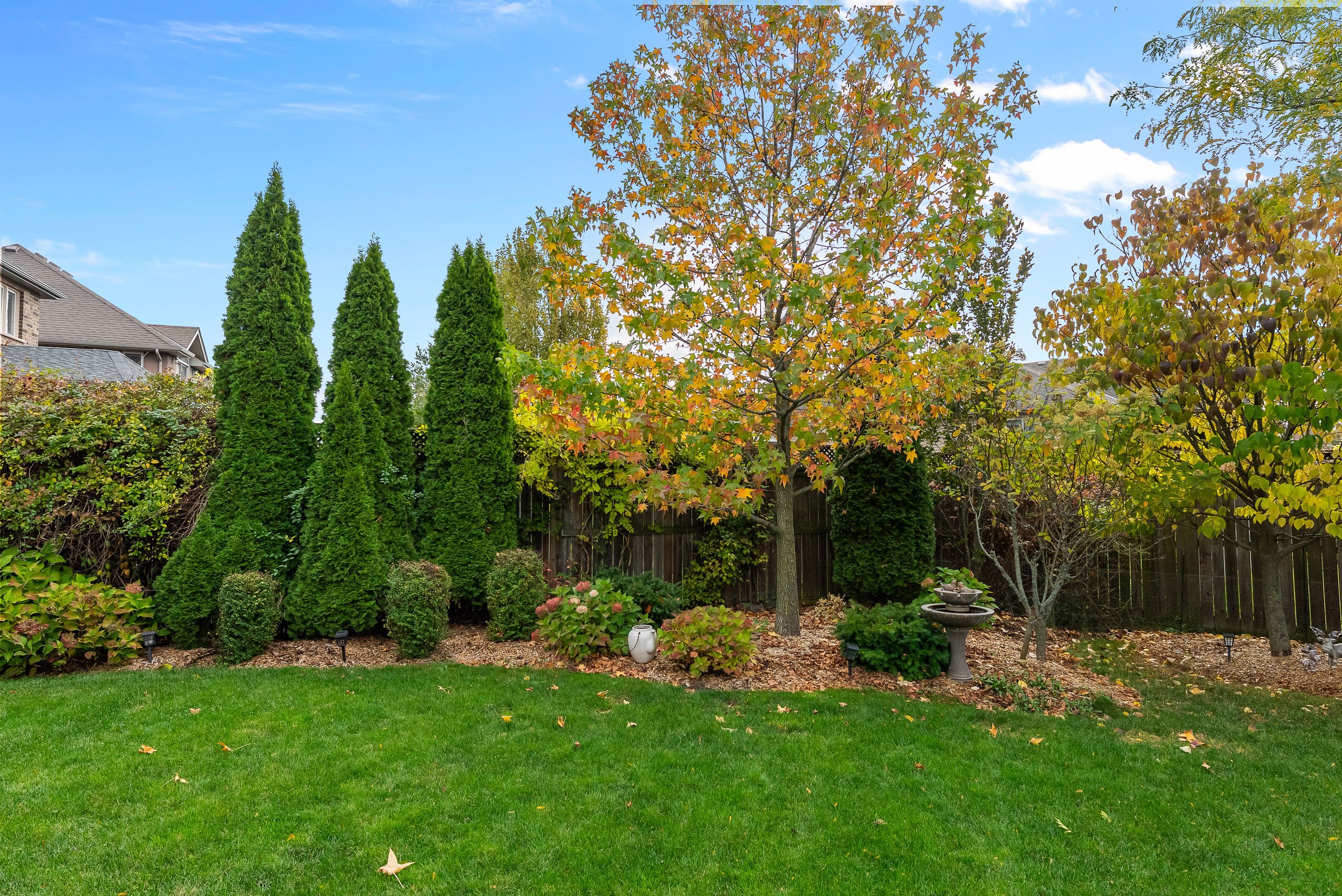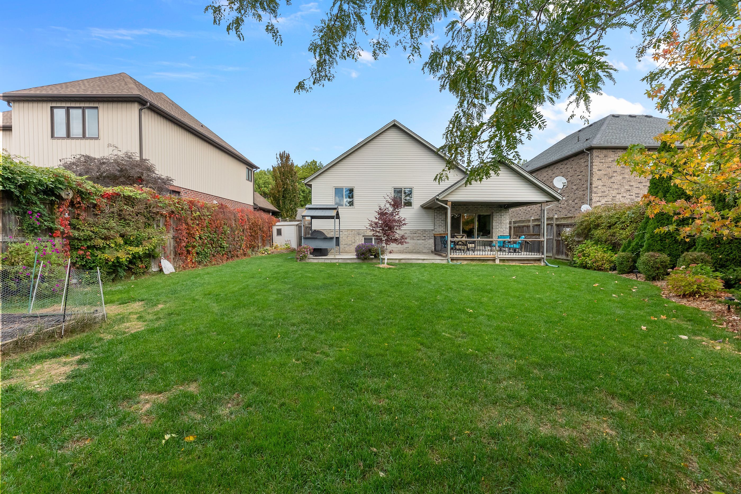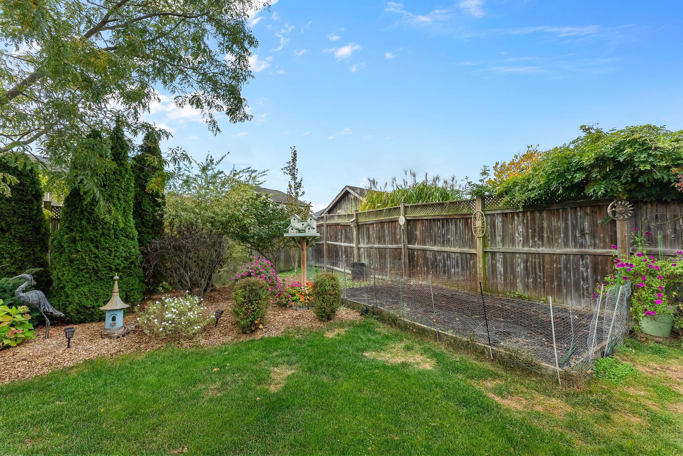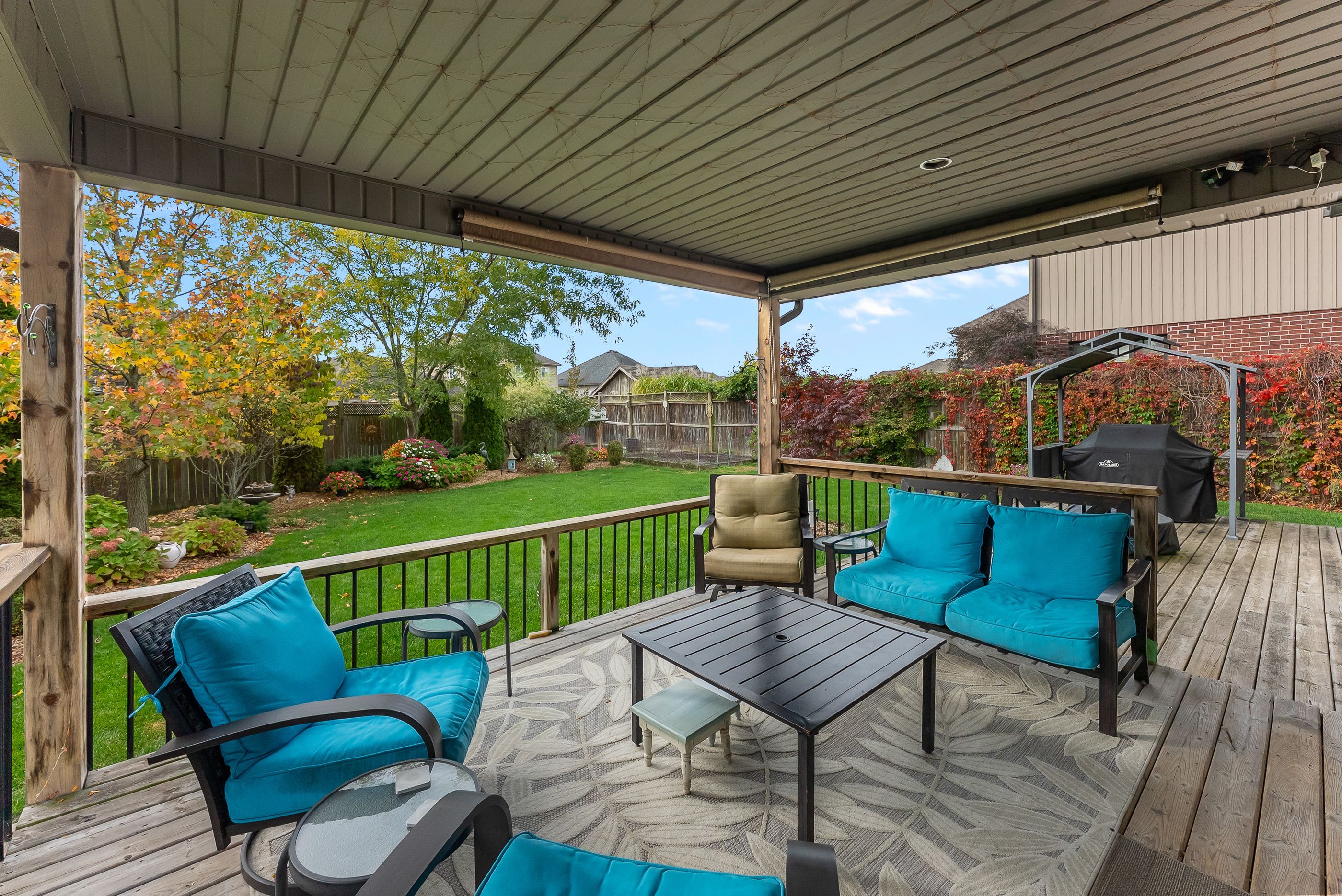 • Private, fully fenced backyard with a covered deck and landscaped gardens.