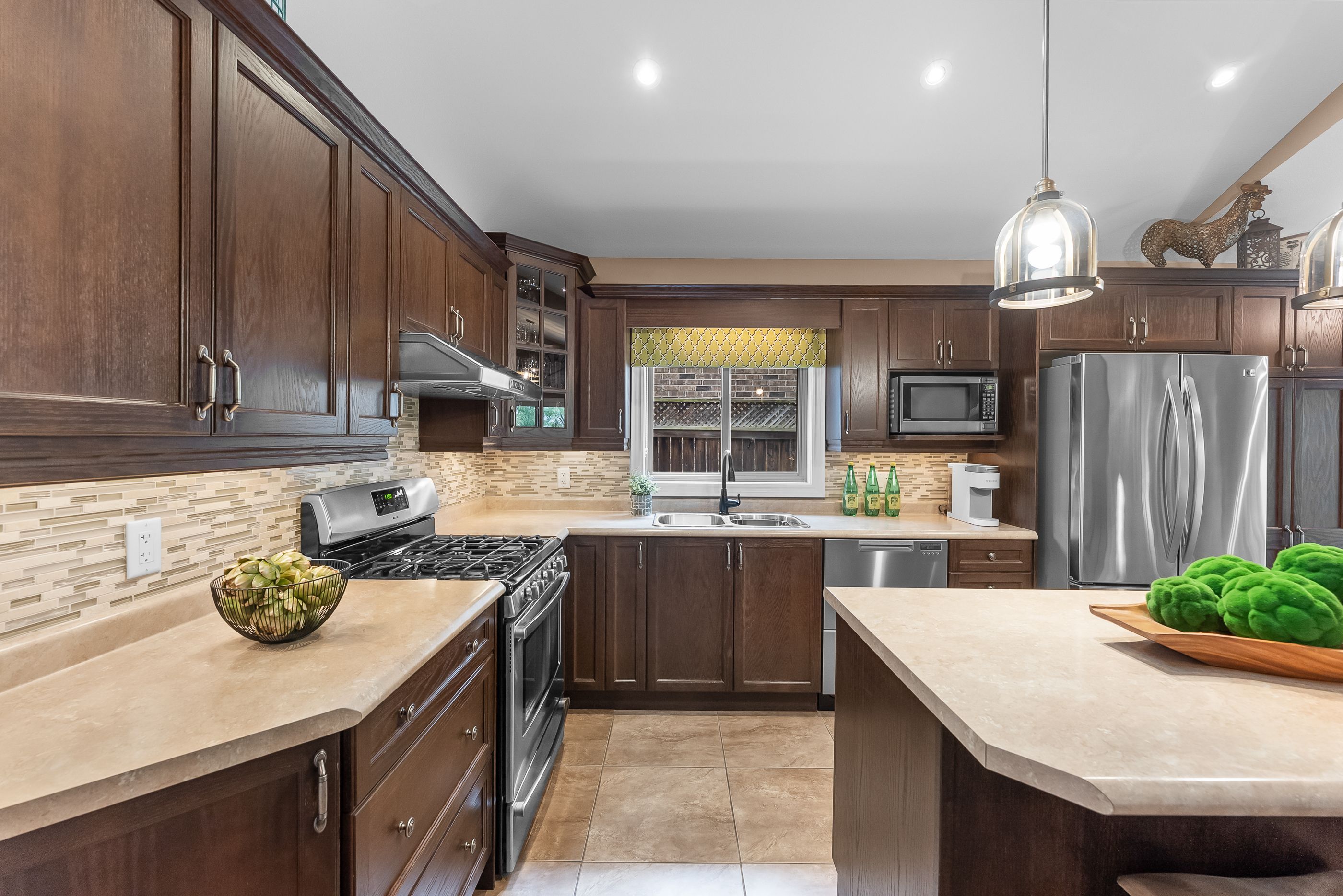 • Spacious kitchen with rich cabinetry, center island, and stainless steel appliances.