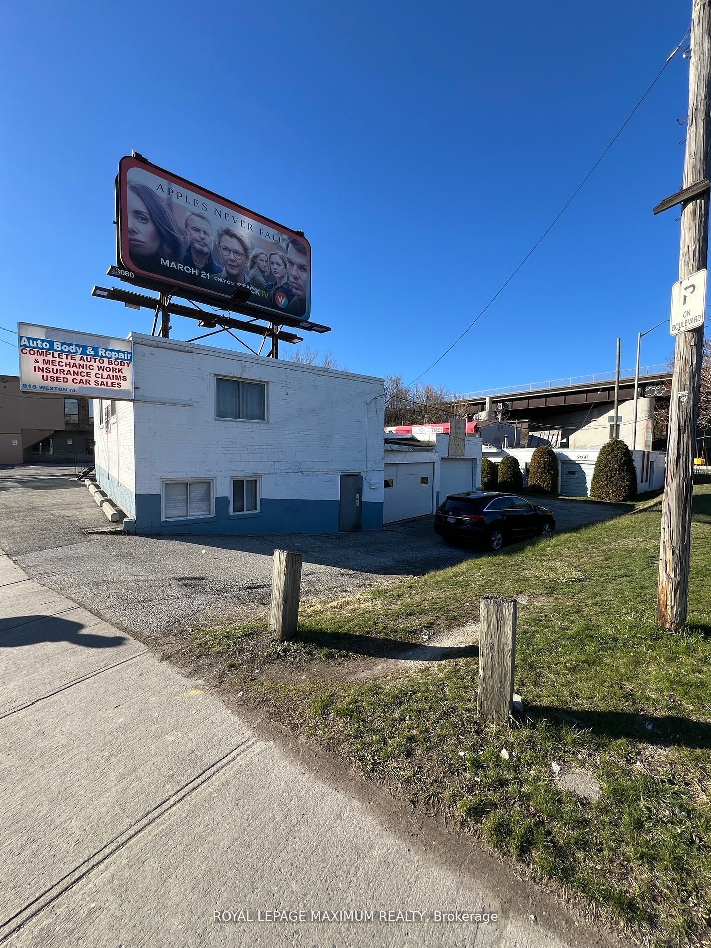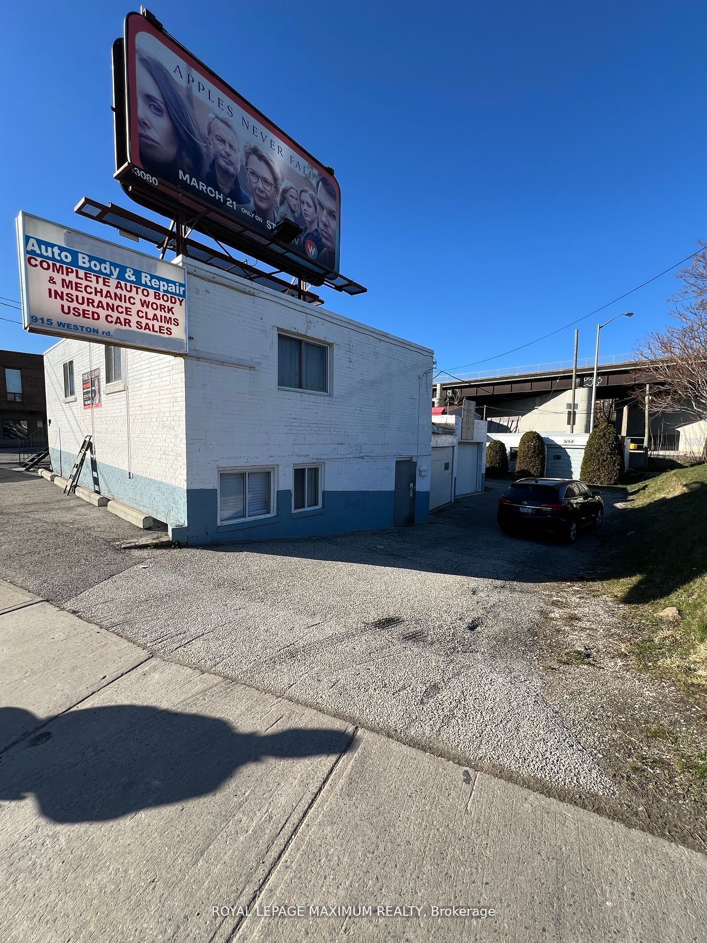 Rare opportunity with a great location... Commercial space allowing many uses. Main floor area approx. 1500 sqft with 2 sections and separate d/i door each. Previously used for auto-motive. Upstairs is vacant 2 bedroom, 1 bath apartment with separate entrance, and separate meters for utilities. Additional income from roof sign at $3,755 + hst year. There is a 2nd different property at the back of this, which is 915 a weston rd, this is not included. **extras** phase 1 and 2 environmental completed year ago.