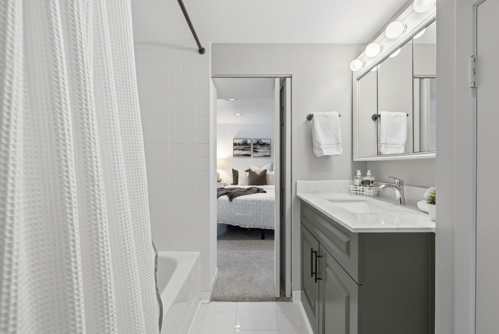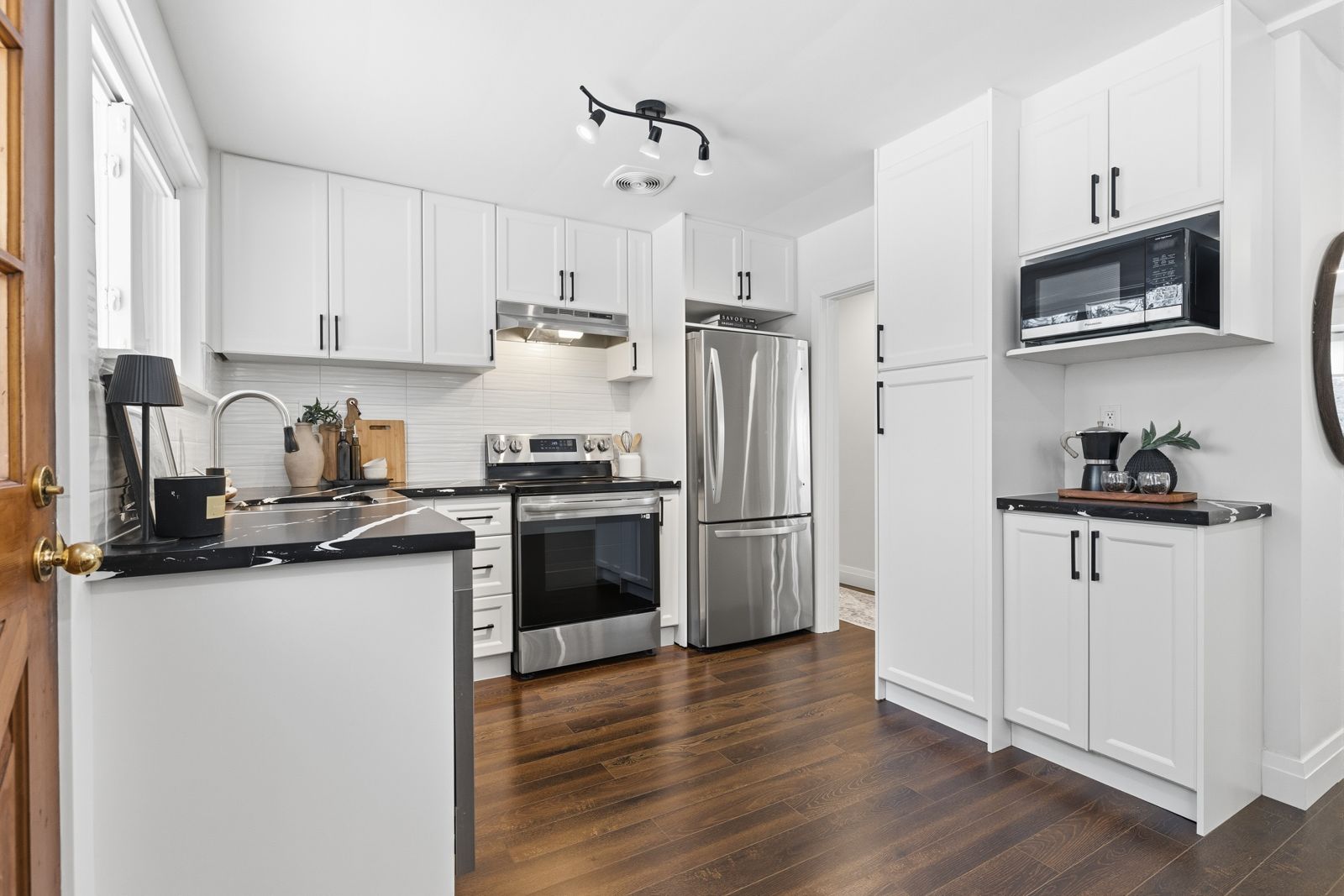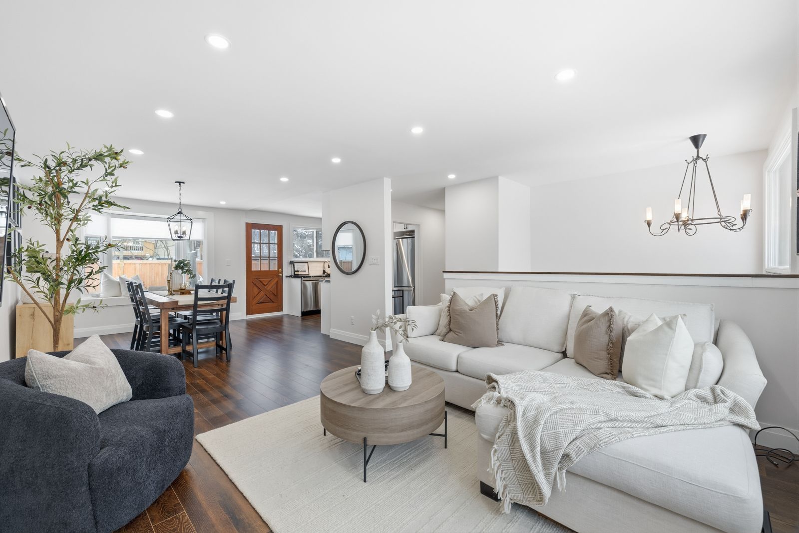 • Bright, open layout with a modern kitchen and stainless steel appliances.