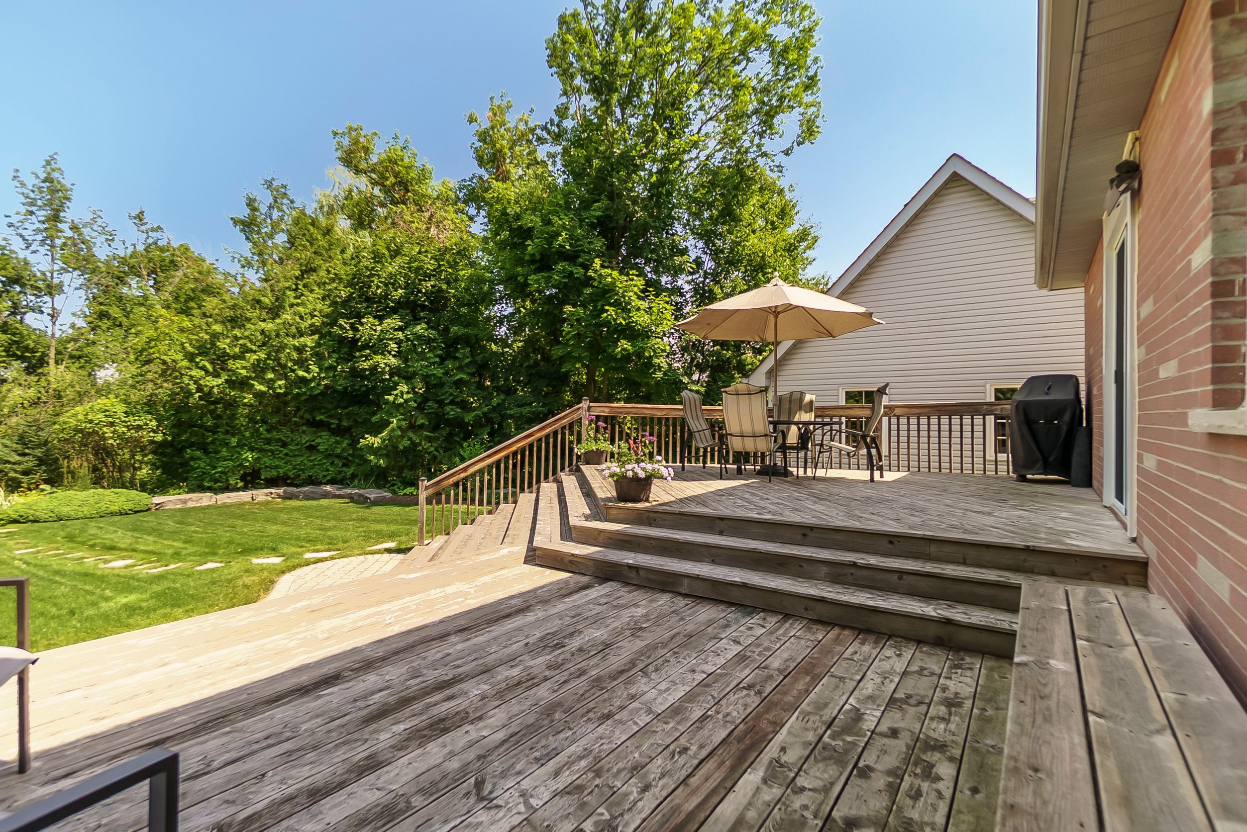 • Impressive landscaped backyard with a two-tiered deck and irrigation system.