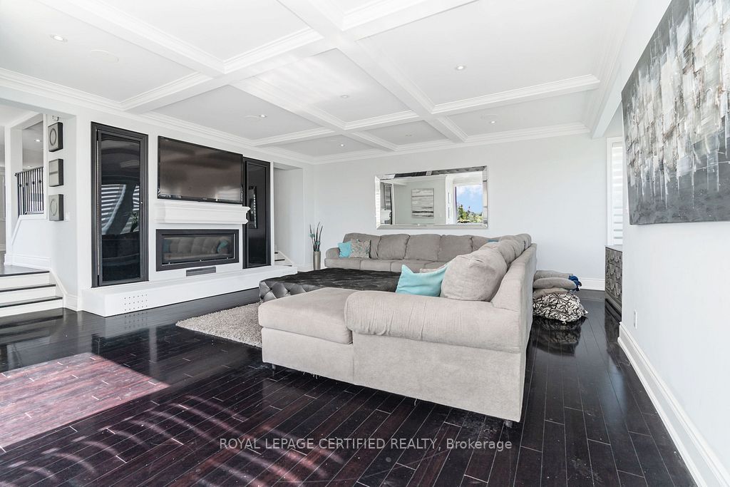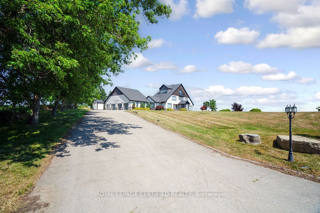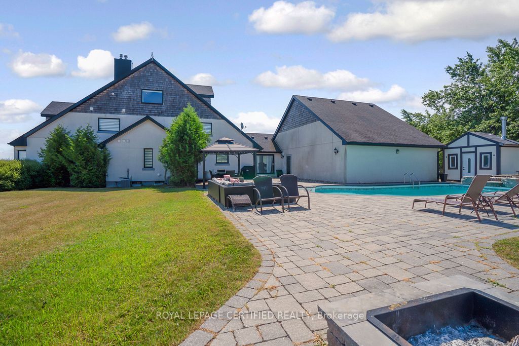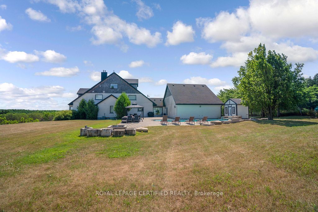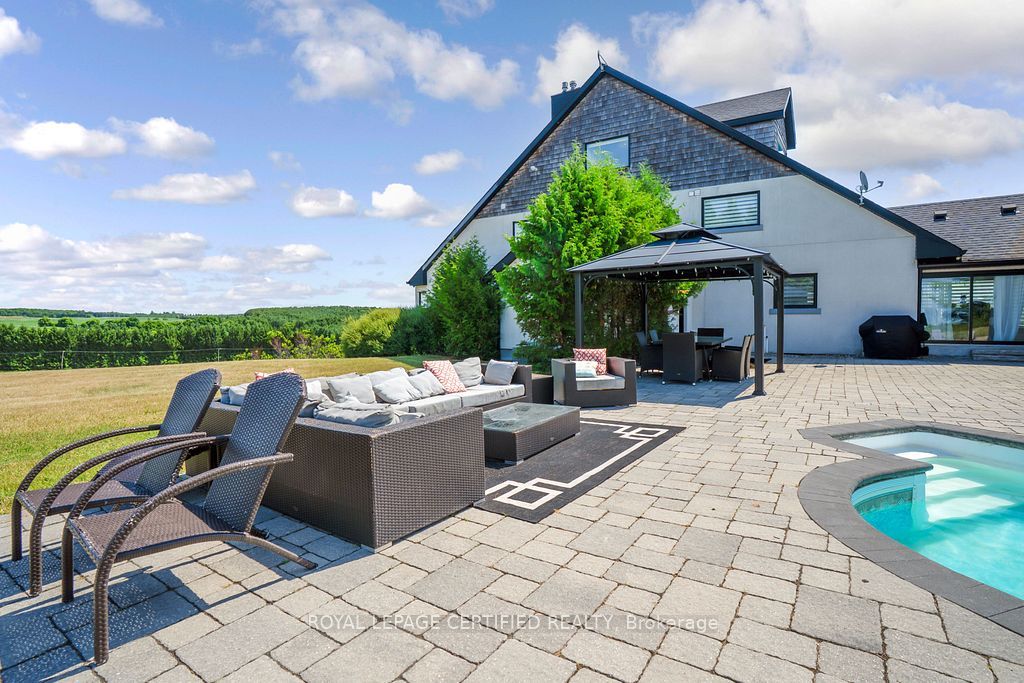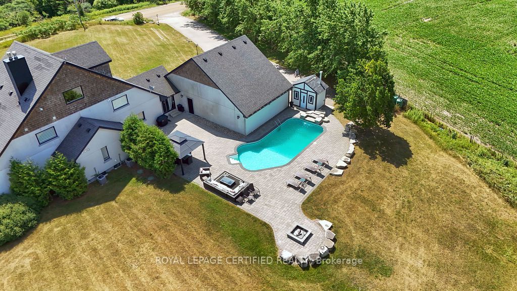 Poised atop a majestic 1. 75-acre hilltop estate, this custom-built 2 1/4 storey masterpiece redefines luxury living with sweeping panoramicviews and uncompromising design! This 4-bedroom, 4-bathroom masterpiece is a perfect blend of modern elegance and country charm. Thegourmet kitchen is a culinary showpiece, appointed with two statement islands, premium sub-zero and wolf appliances, and bespoke cabinetrytailored for both daily living and entertaining. Adjacent, sunken family room accented by coffered ceilings and a separate formal dining roomwith vaulted ceiling sets the stage for memorable gatherings. Retreat to the luxurious primary suite with its own vaulted ceiling, dual-sidedfireplace, and spa-like 5-piece ensuite. The fully finished walkout basement expands the living space and opens to a private outdoor retreat. Outside, resort-style living awaits an inground saltwater pool with a tranquil waterfall is set among professionally landscaped grounds, offeringultimate serenity and seclusion. An oversized 4-car garage adds practicality to this one-of-a-kind property. This is more than a home its a private,architectural statement for the most discerning buyer.