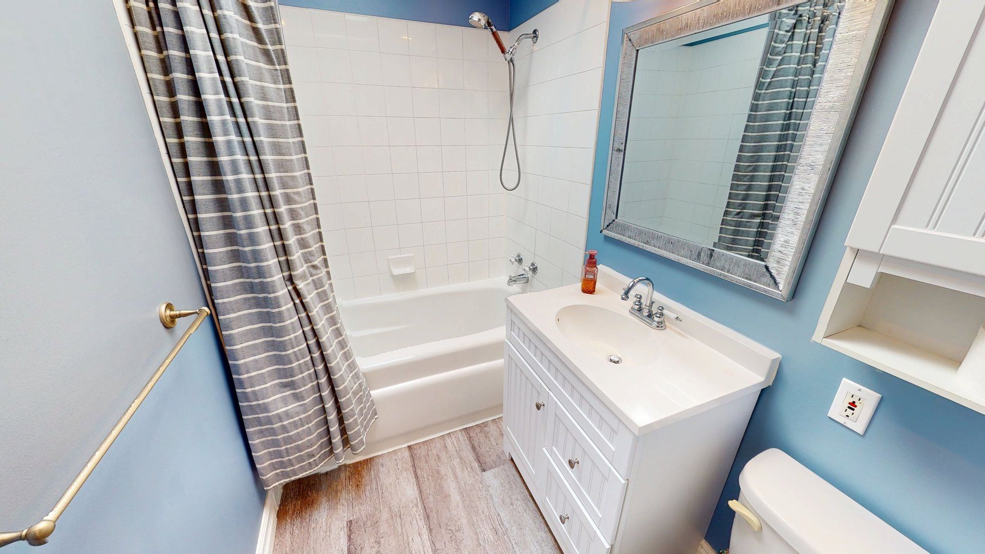 • Inviting bathroom with modern finishes and a tiled tub surround.