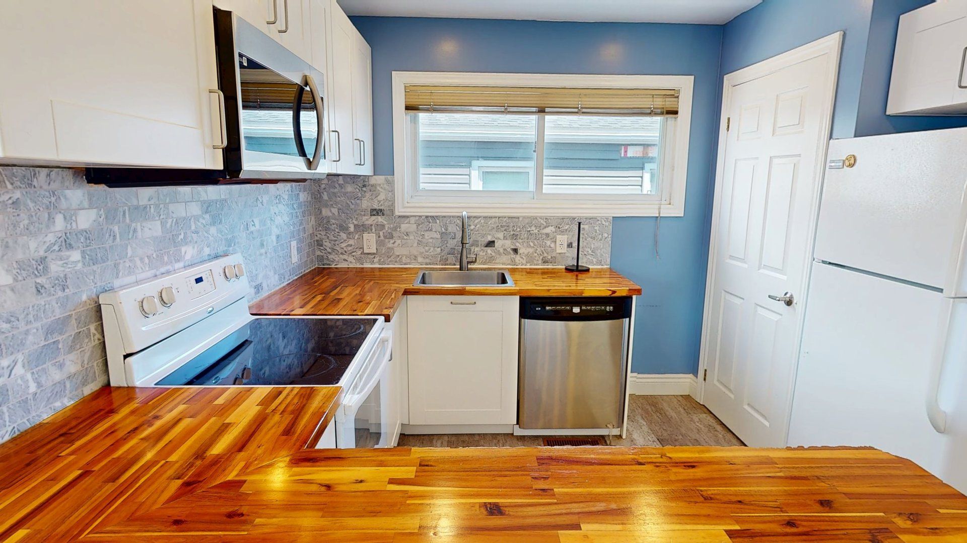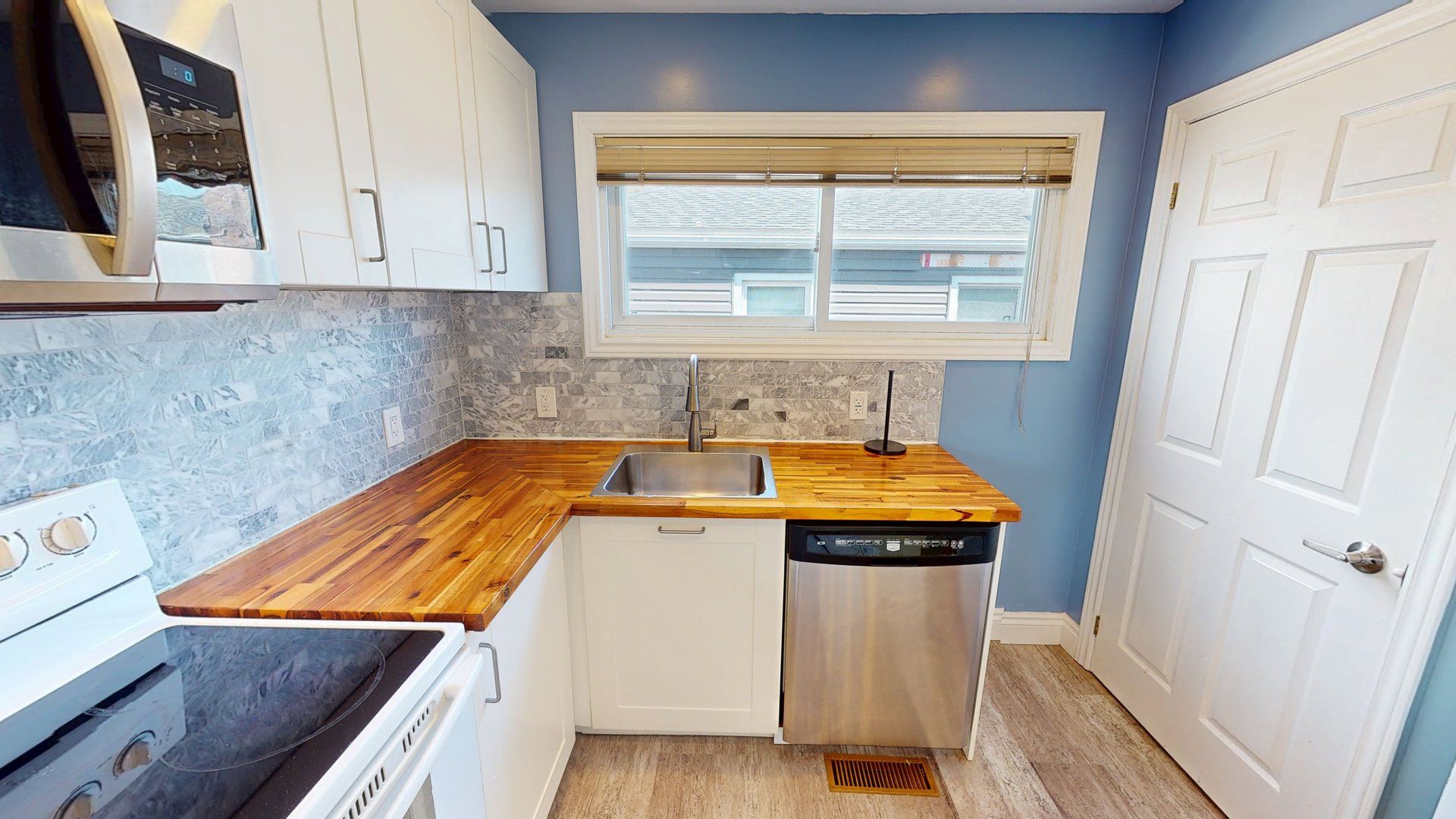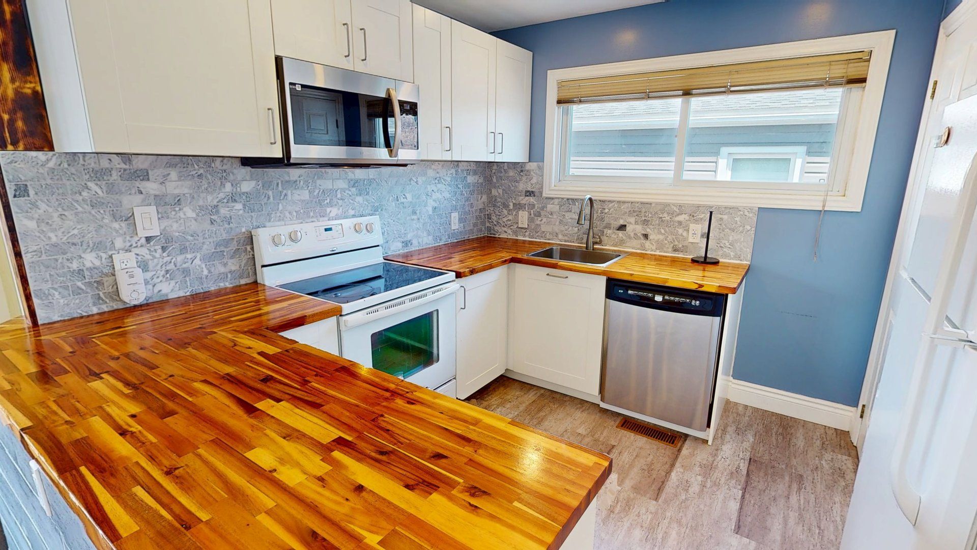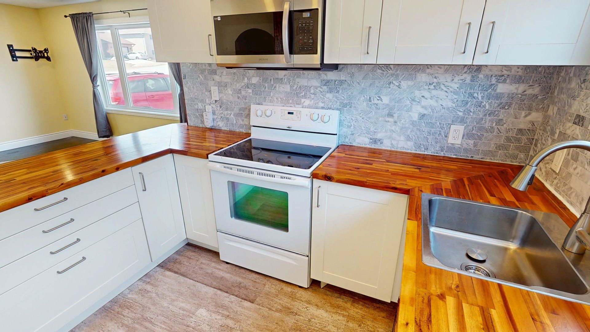 • Stylish kitchen featuring white cabinetry and butcher block countertops.