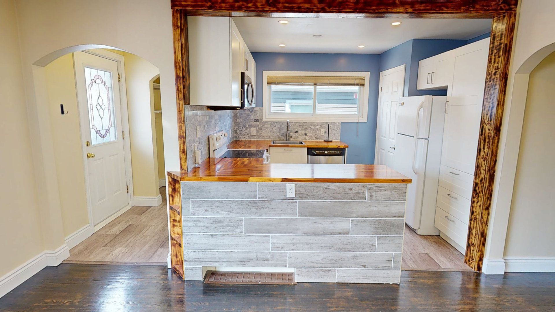 Welcome to 919 eva st, where thoughtful design, warm character and a self contained 1 bedroom apartment combine to create an irresistible opportunity in north bay. Rich, dark hardwood floors flow throughout the home, anchoring each room with timeless elegance. The open-concept living and kitchen area is bathed in natural light from a large front-facing window, creating an inviting atmosphere perfect for both relaxing evenings and lively gatherings. The kitchen is a true standout, featuring crisp white shaker cabinetry, striking butcher block countertops, a stone tile backsplash, and stainless steel appliances - a space that inspires culinary creativity. Recessed pot lights and a decorative arched doorway add architectural charm throughout. The bedrooms offer peaceful retreats, with gleaming hardwood floors, ceiling fans, and generous natural light. The bathroom is a serene escape, finished in cool blue tones with clean white fixtures, a tiled tub surround, and a modern vanity. This move-in-ready bungalow is the ideal launchpad for the life you've always envisioned.