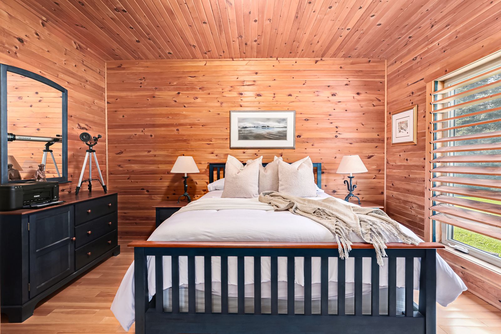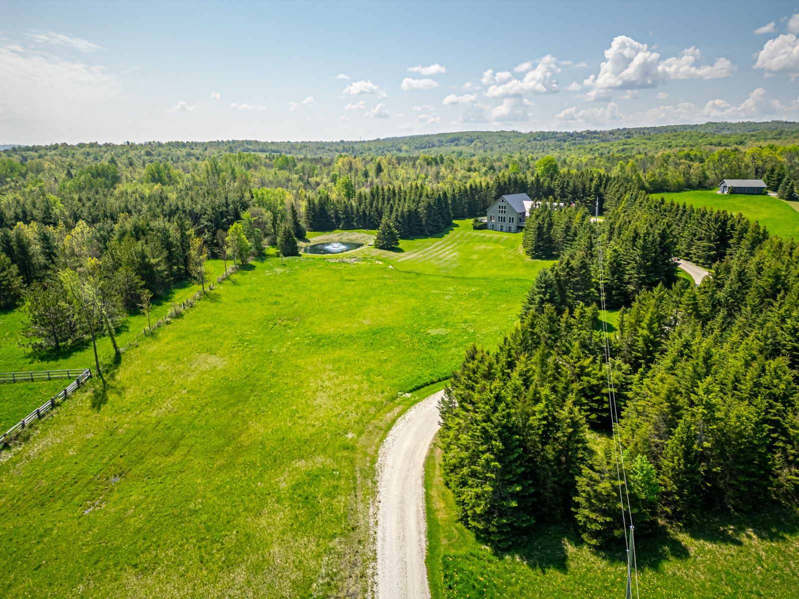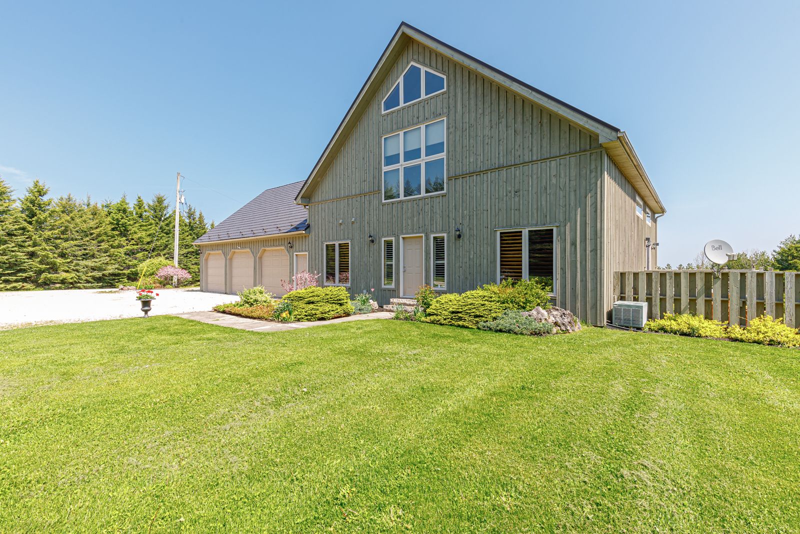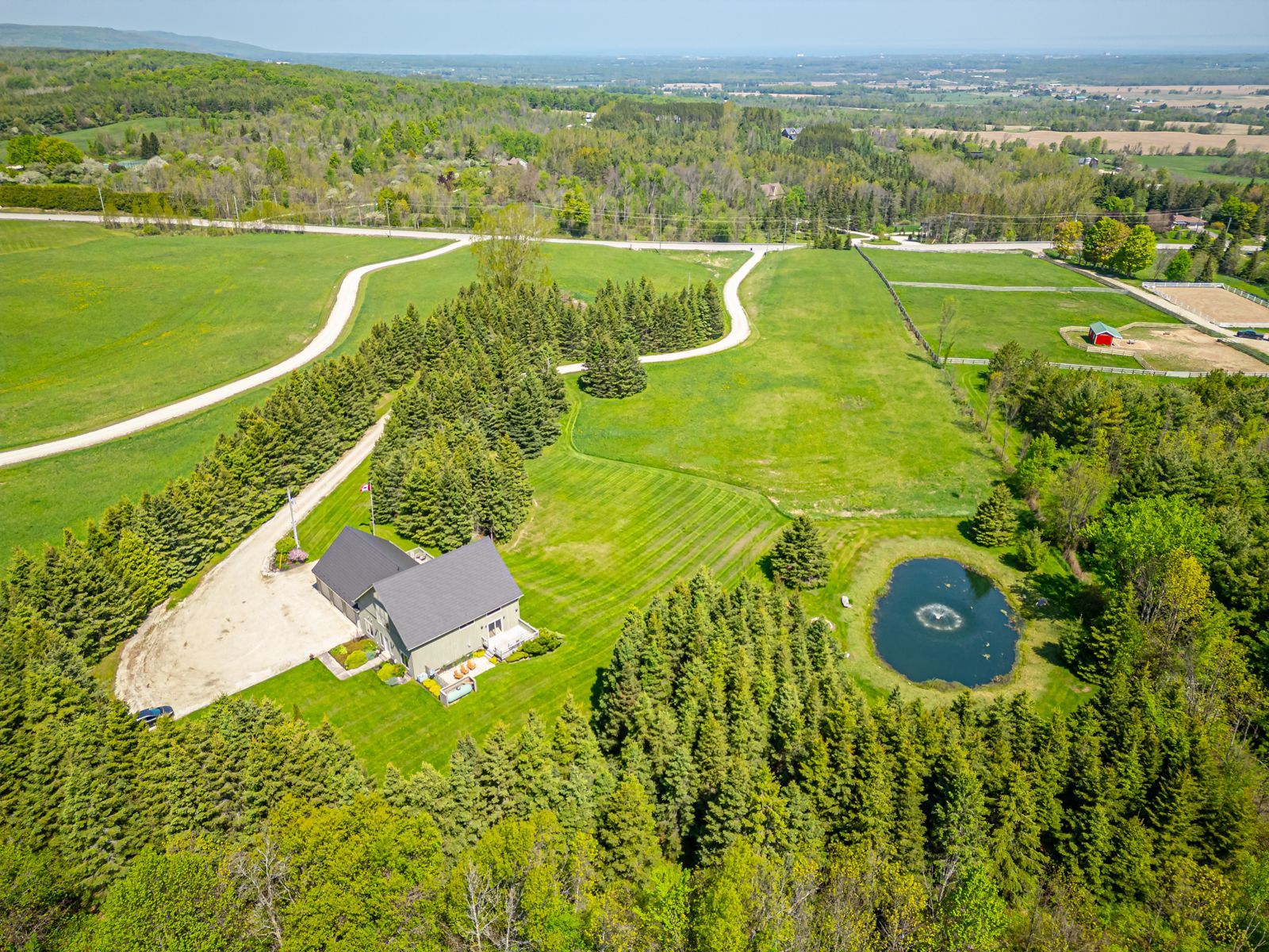 Welcome to your private country estate, set on 9. 02 acres of breathtaking natural landscape with panoramic views stretching across georgian bay and the surrounding countryside. This exceptional timber frame residence, finished in classic board and batten, offers over 3,600 square feet of thoughtfully designed living space, surrounded by mature trees, a tranquil pond with fountain, and sweeping vistas that capture the essence of south georgian bay living. At the heart of the home, the dramatic great room showcases soaring vaulted ceilings, exposed timber beams, and expansive windows that frame the spectacular views beyond. The open-concept design seamlessly connects the kitchen, dining, and living spaces-creating an inviting environment ideal for both refined entertaining and relaxed everyday living. A spacious main-floor bedroom provides flexibility as a guest suite, home office, or private retreat. Upstairs, the loft-style primary suite offers a true sense of escape, complete with a luxurious 5-piece ensuite and walk-in closet-your own private sanctuary overlooking the surrounding landscape. The fully finished lower level is designed for both comfort and recreation, featuring three additional bedrooms, a 4-piece bath, and a generous rec/games room with walk-out access-effortlessly extending your living space into the outdoors. Step outside to the expansive deck and immerse yourself in the natural beauty that surrounds you-perfect for morning coffee, evening sunsets, or hosting family and friends. A triple car garage provides ample space for vehicles, recreational equipment, and storage, complementing the property's active four-season lifestyle. Ideally located just minutes from duntroon highlands golf club, highlands nordic, devils glen ski club, scenic hiking trails, private ski clubs, blue mountain village, downtown collingwood, and the shores of georgian bay. An extraordinary offering that blends refined country living with privacy, space, and year-round recreation.