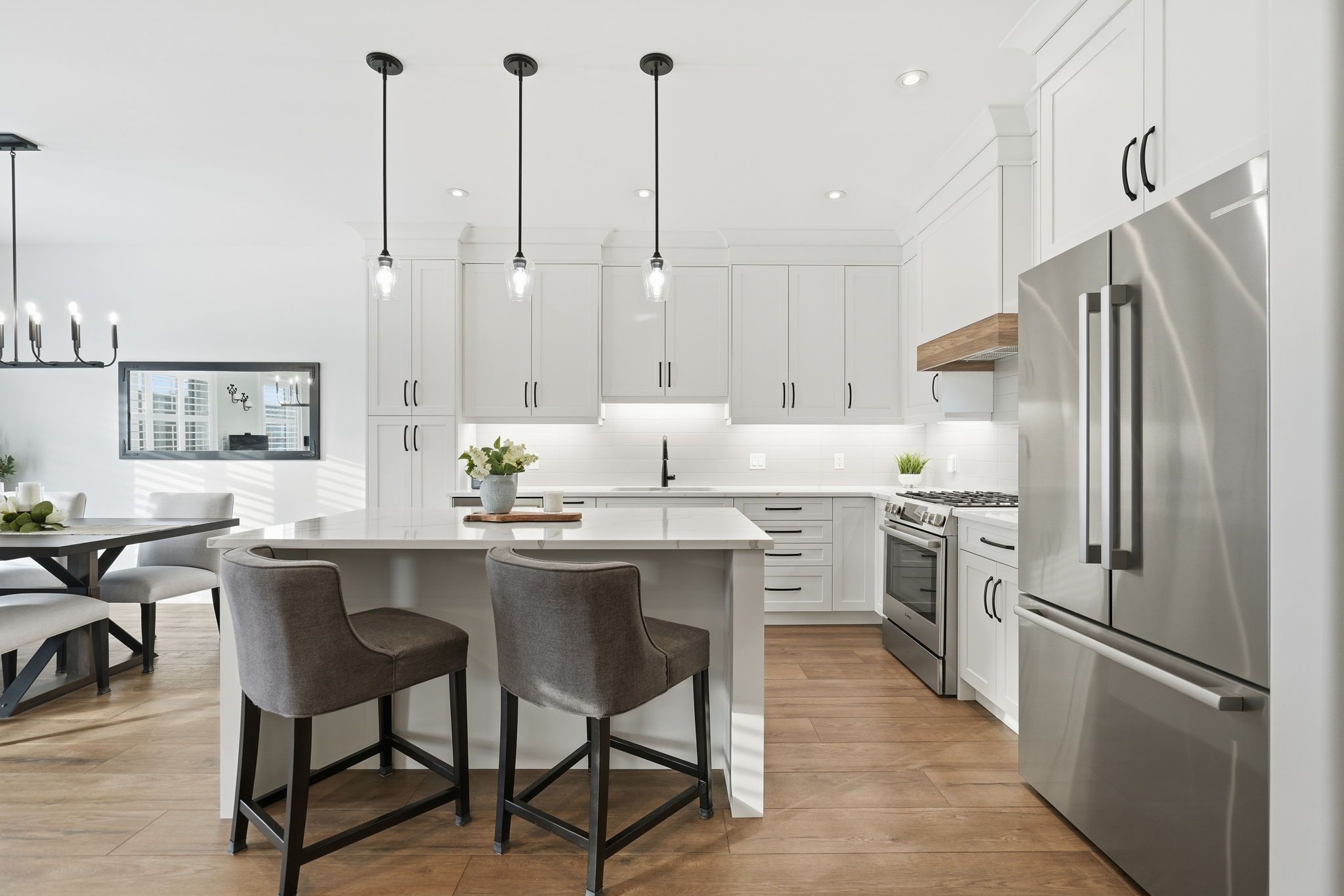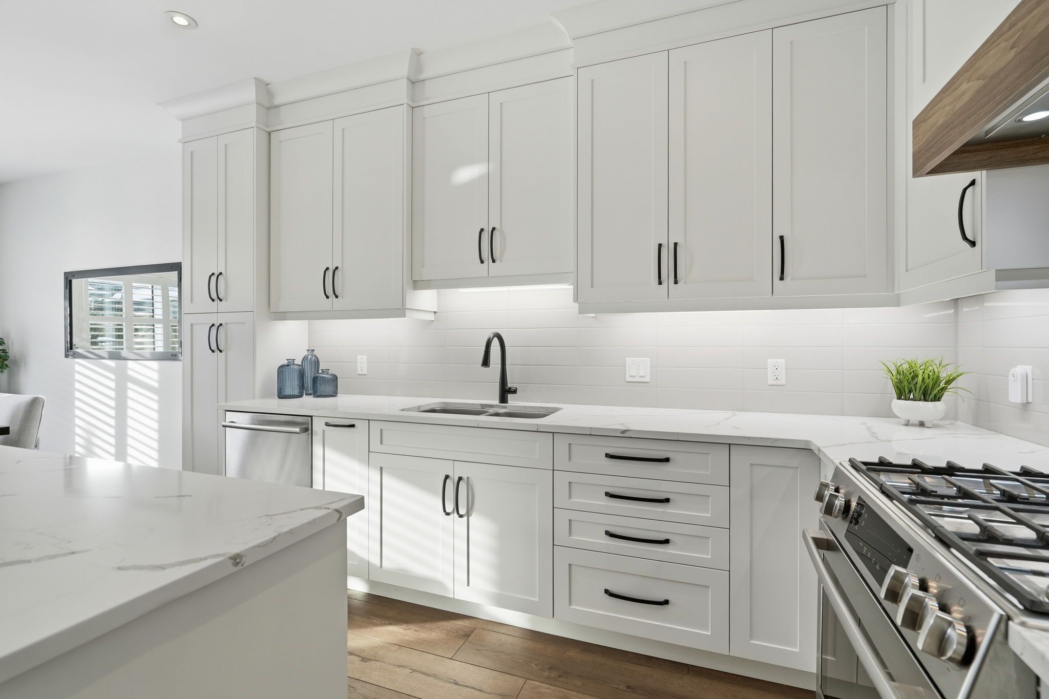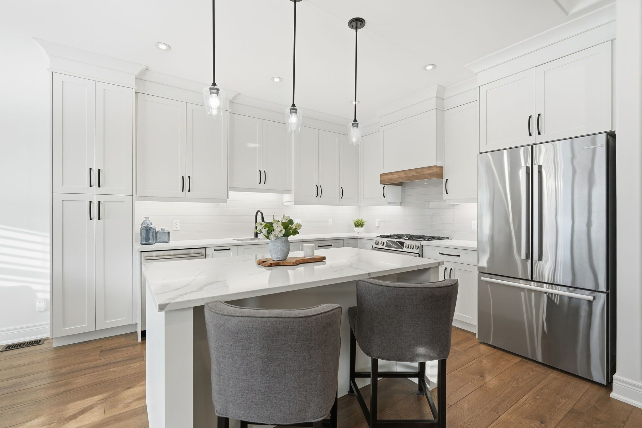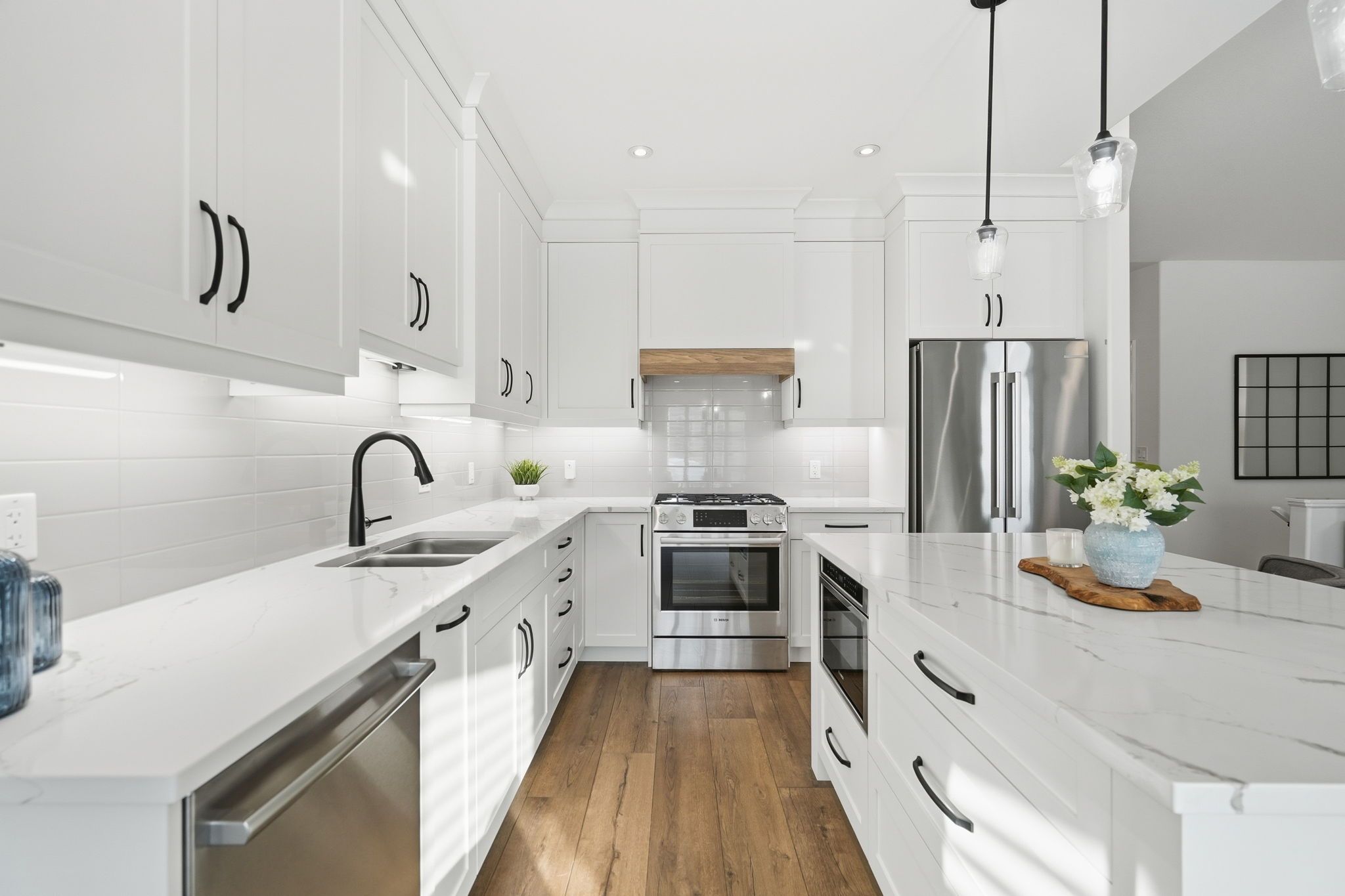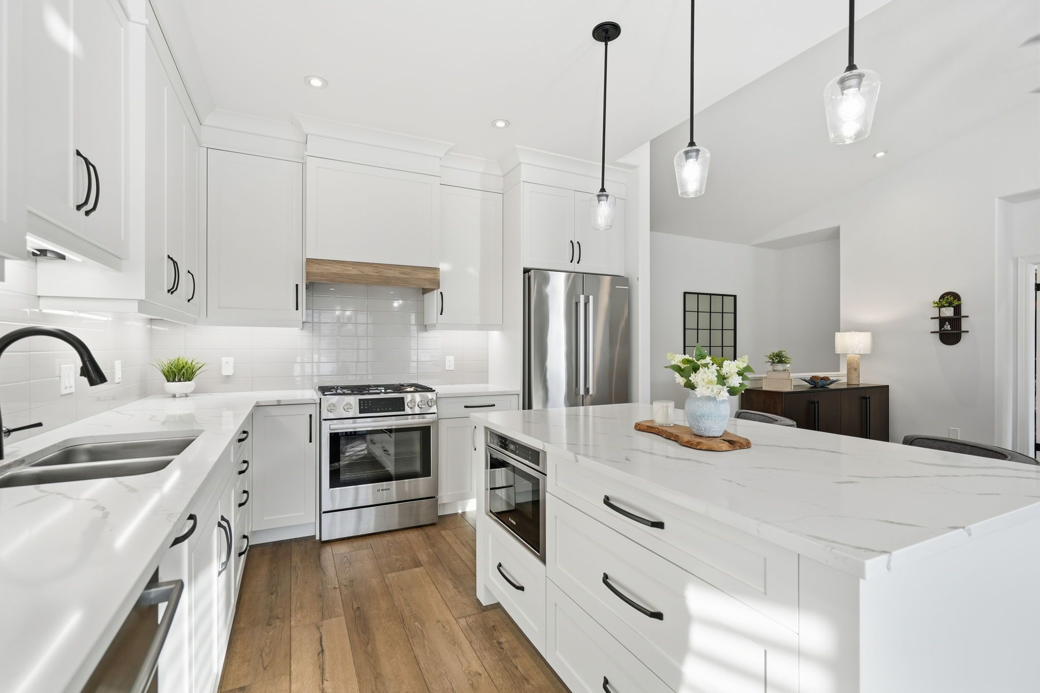 • Modern kitchen with Bosch appliances and quartz countertops.