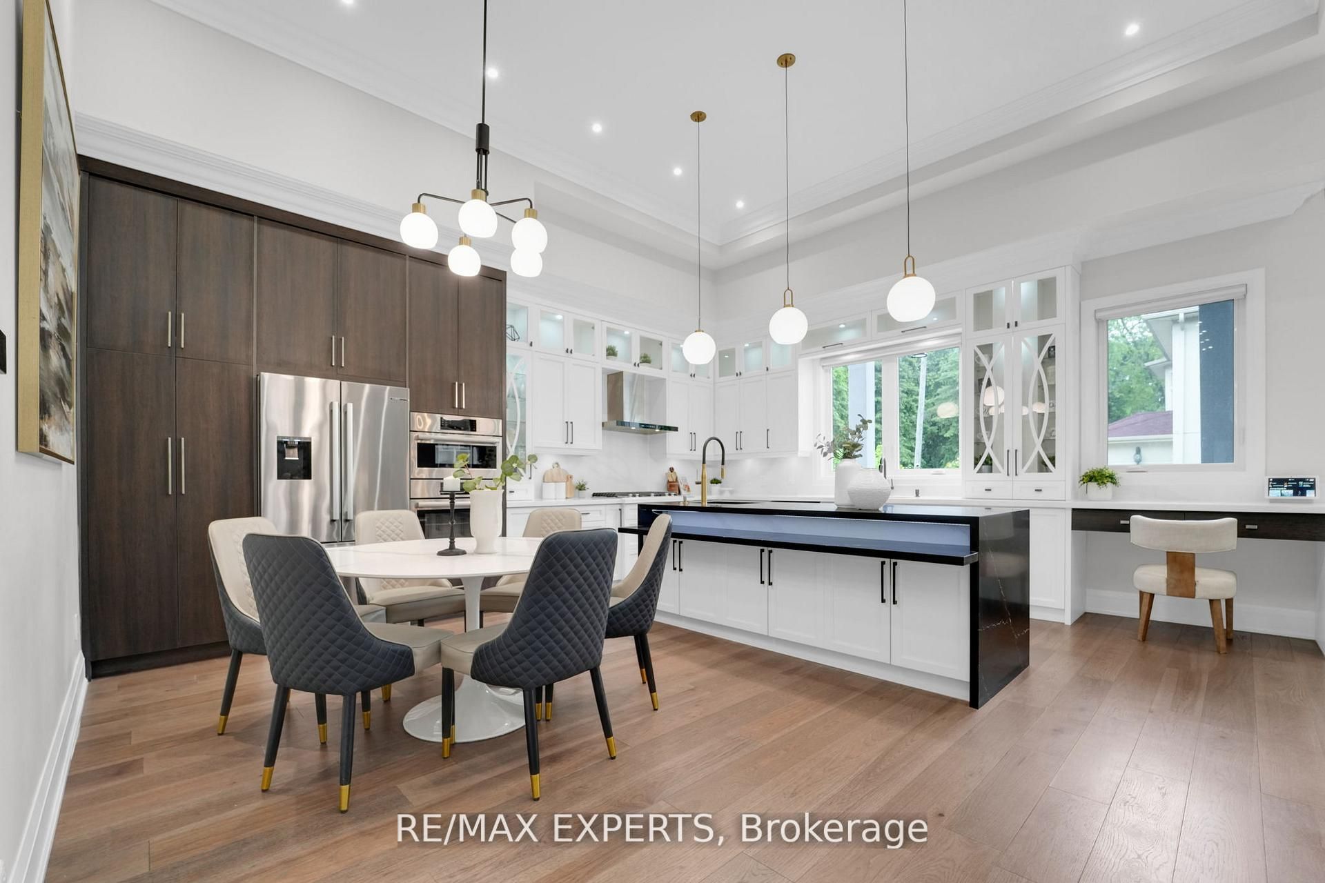 • Custom-built home with an open-concept layout and high ceilings.
