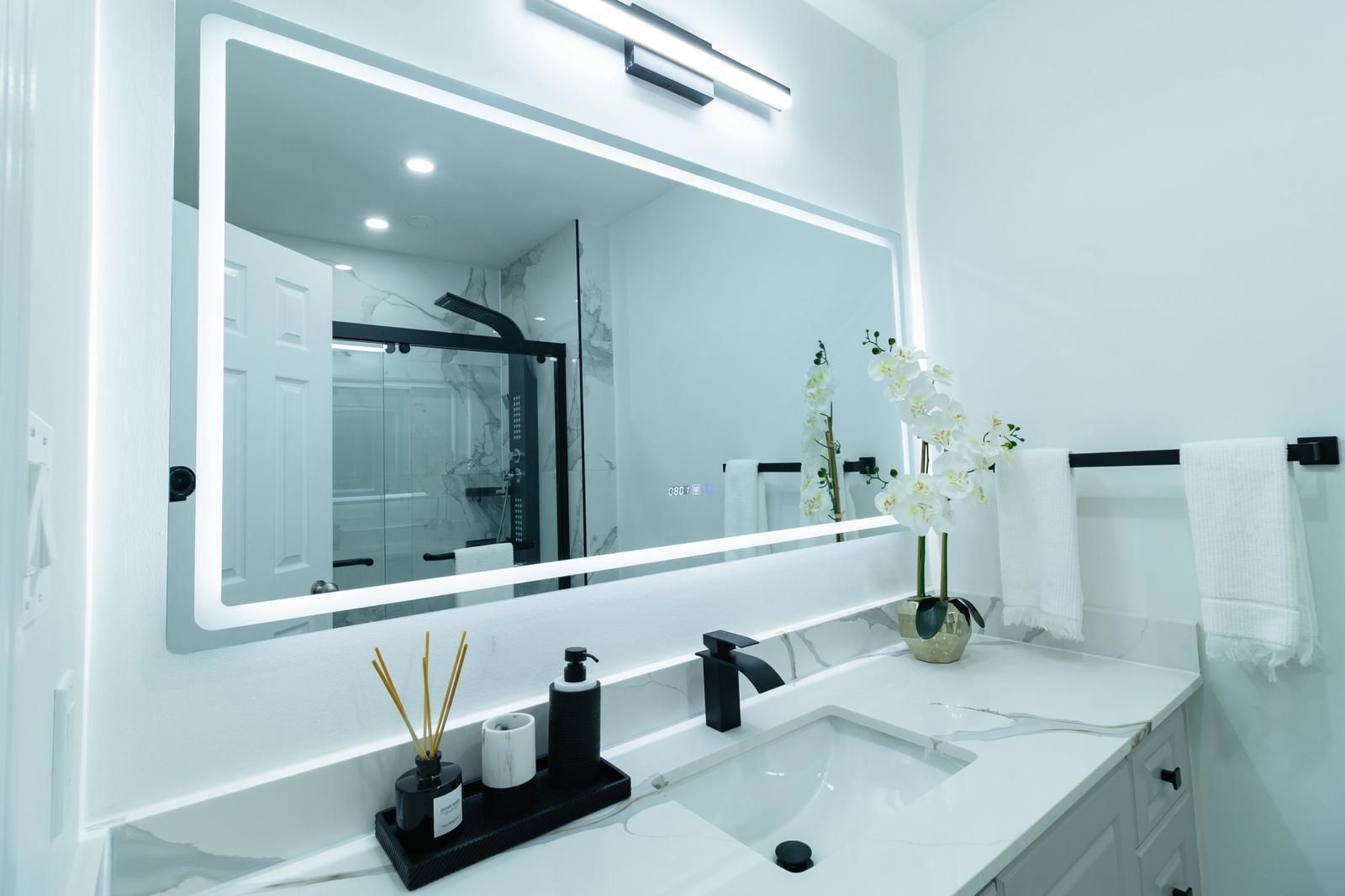 • Custom kitchen features quartz counters and stainless steel appliances.