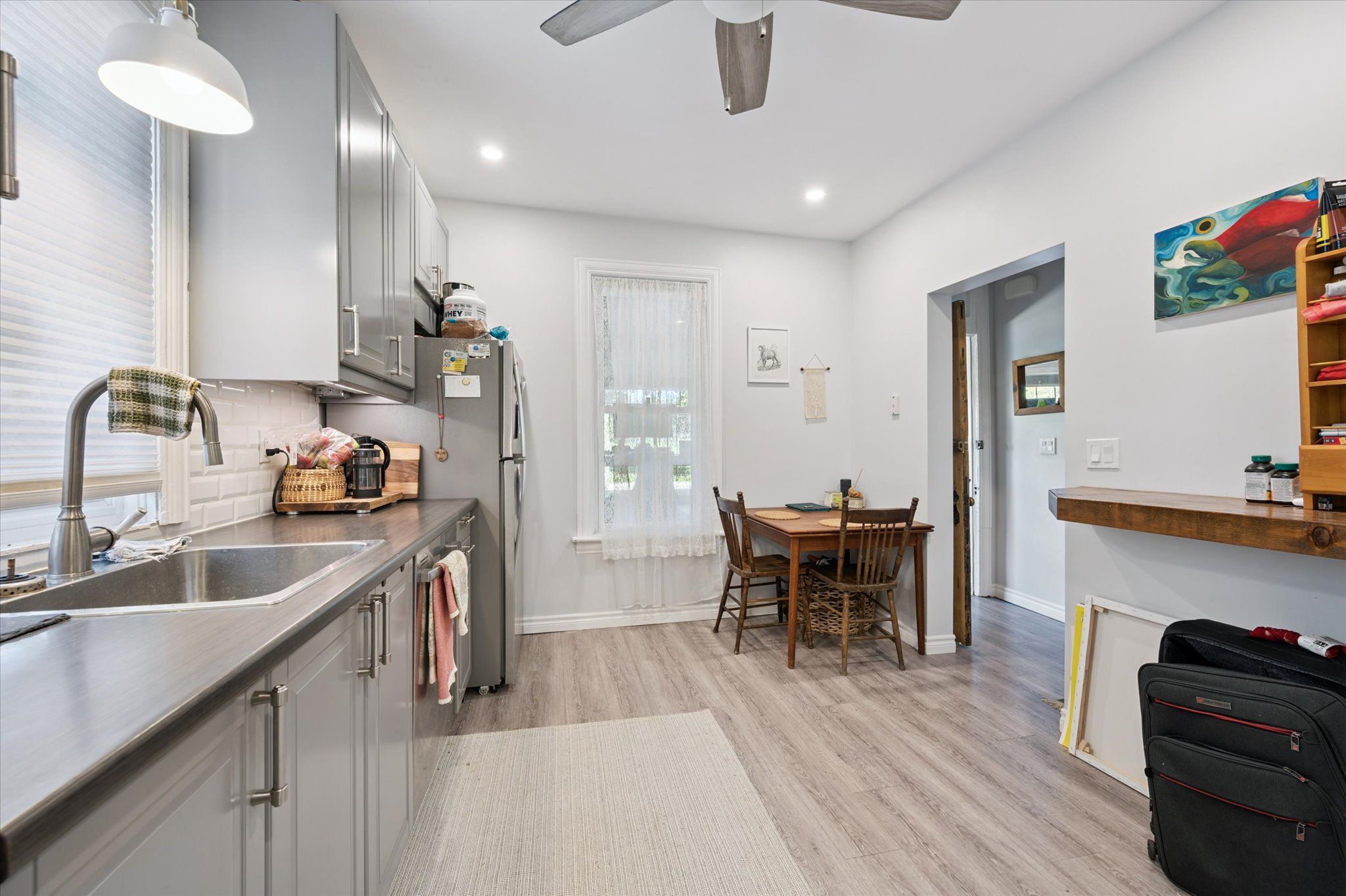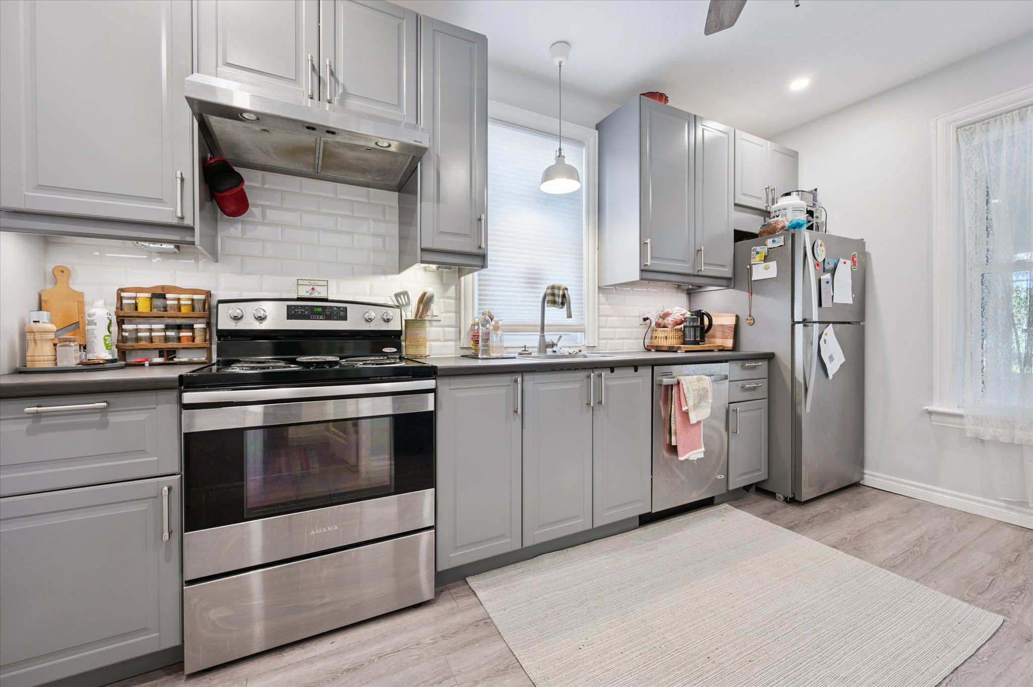 • Bright and inviting open-concept eat-in kitchen with new appliances.
