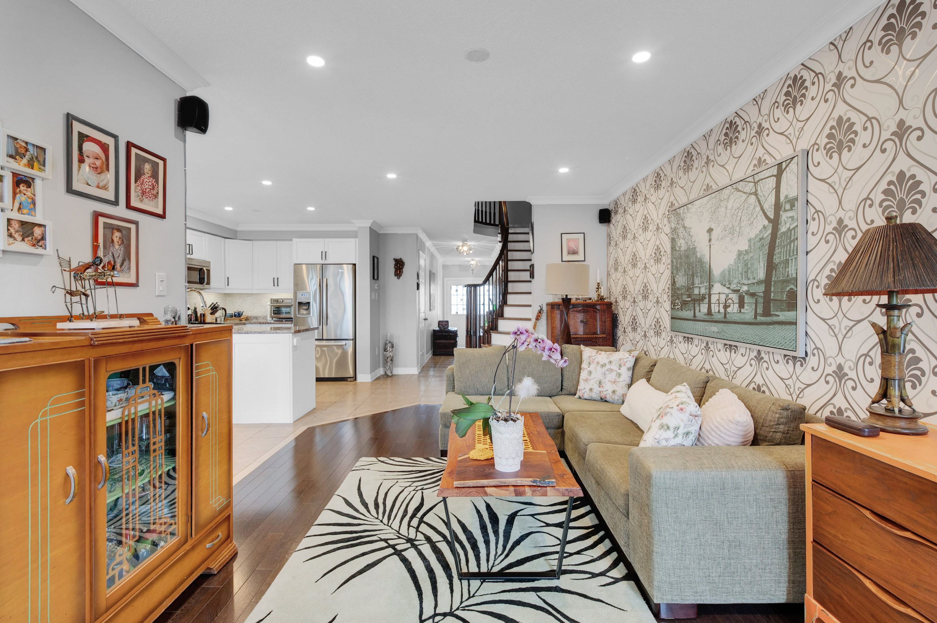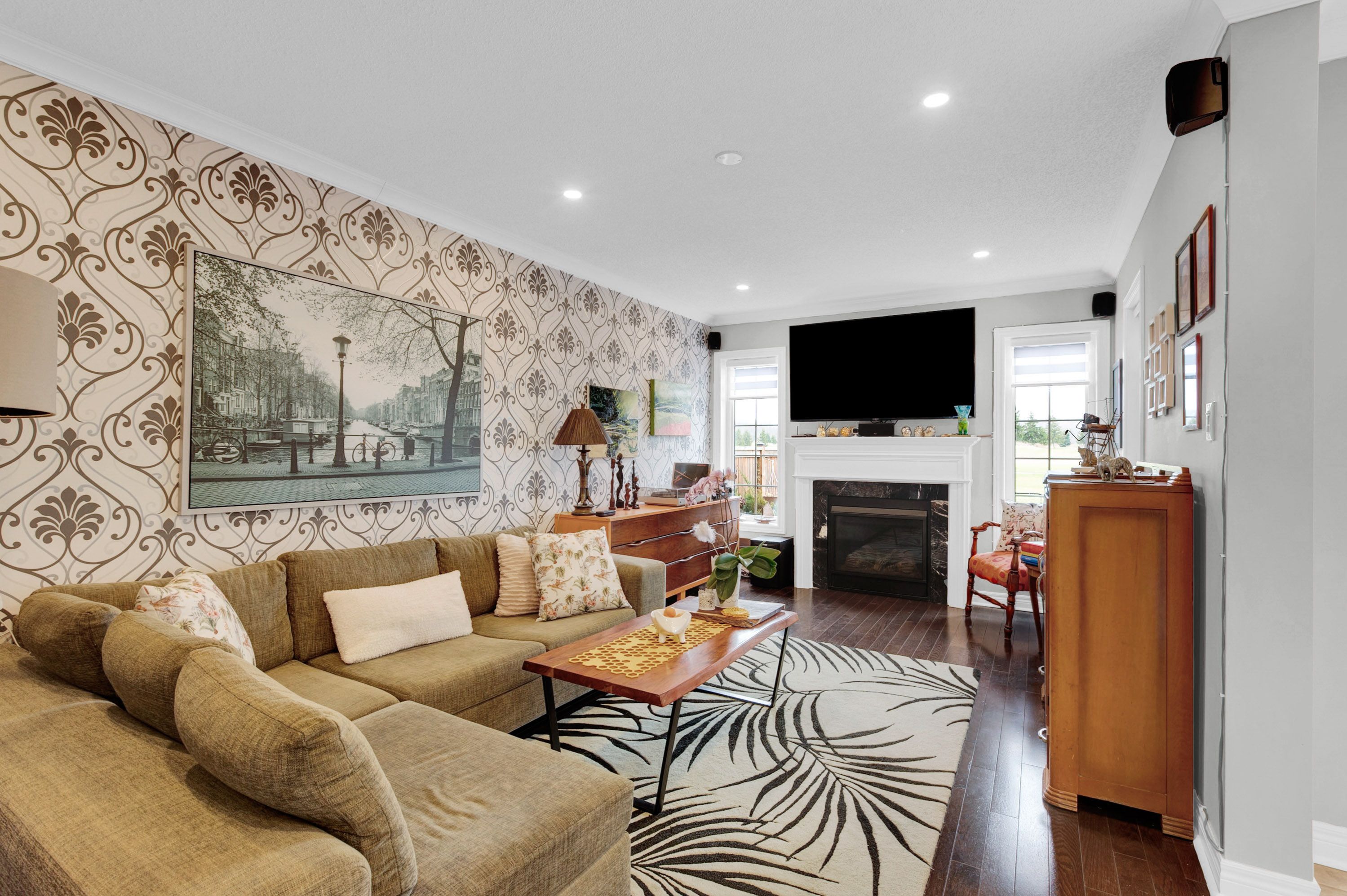• Modern interior with hardwood floors, crown molding, and a cozy fireplace.