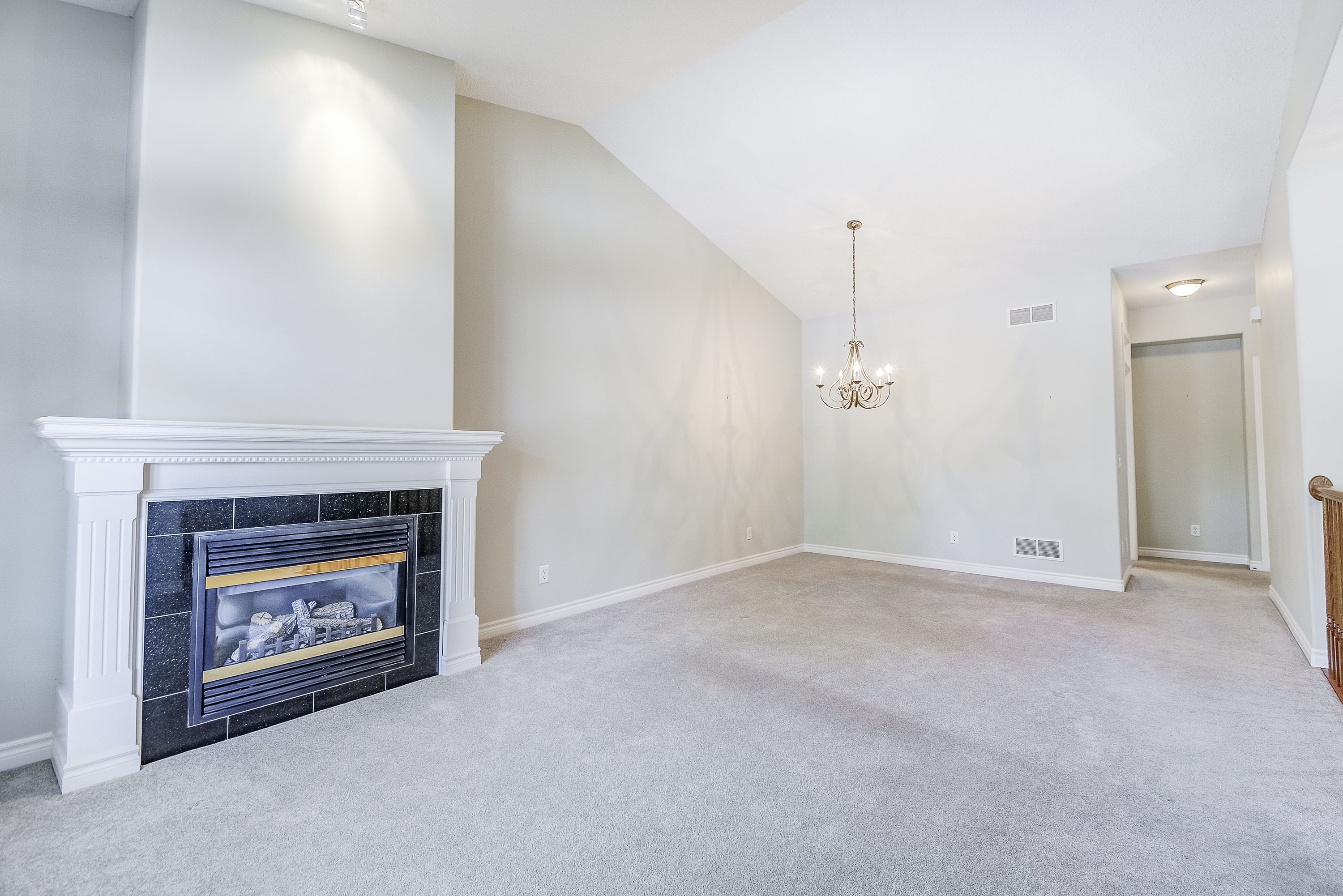 • Spacious foyer and grand living area with vaulted ceilings and a gas fireplace.