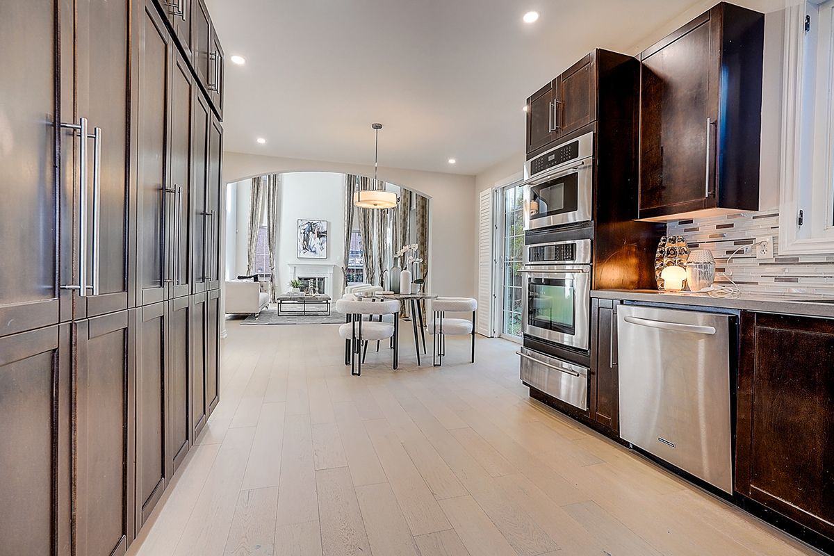• Gourmet kitchen features quartz counters and built-in Jenn-Air appliances.