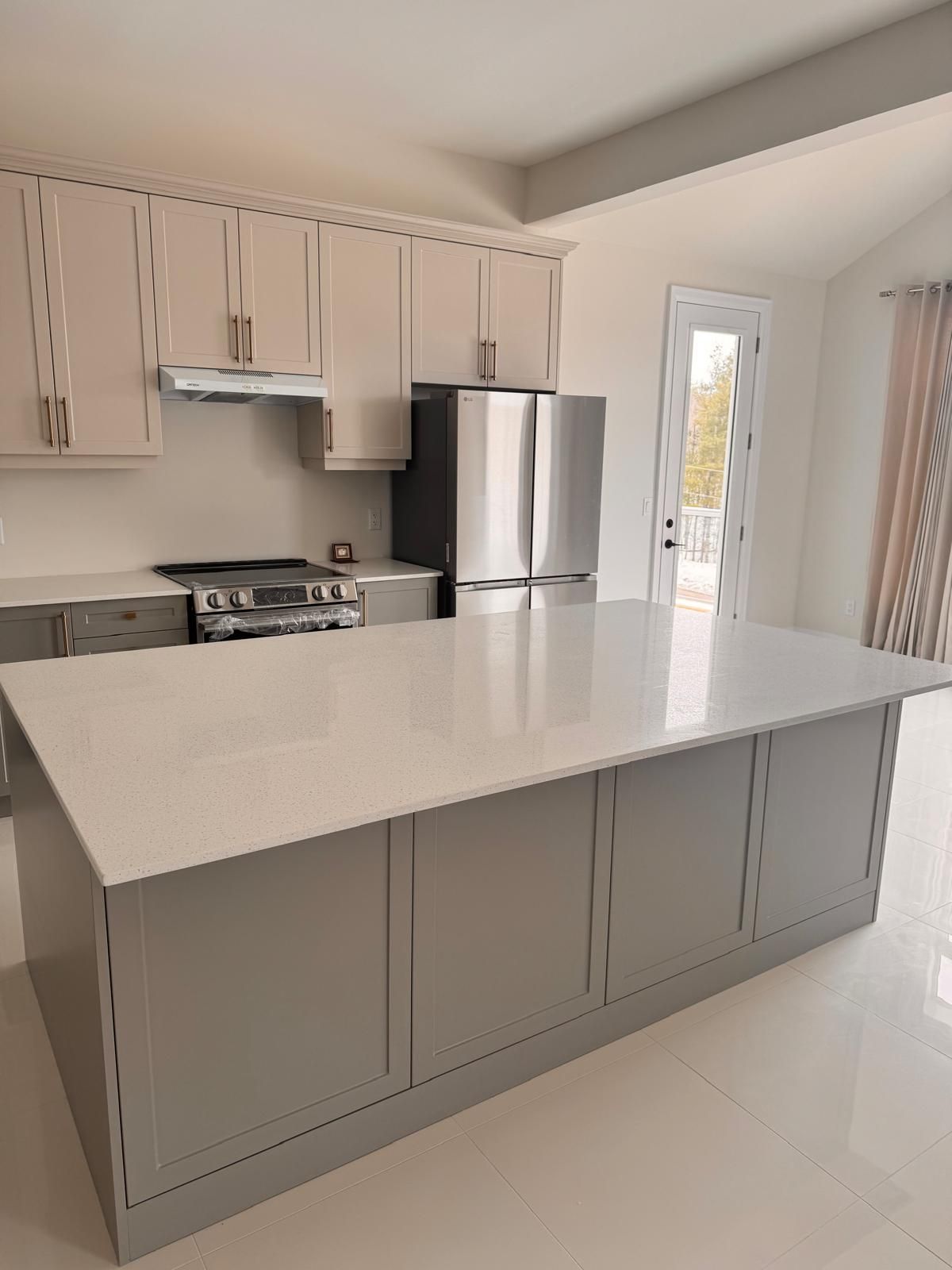 • High-end kitchen with quartz countertops and large island for cooking.
