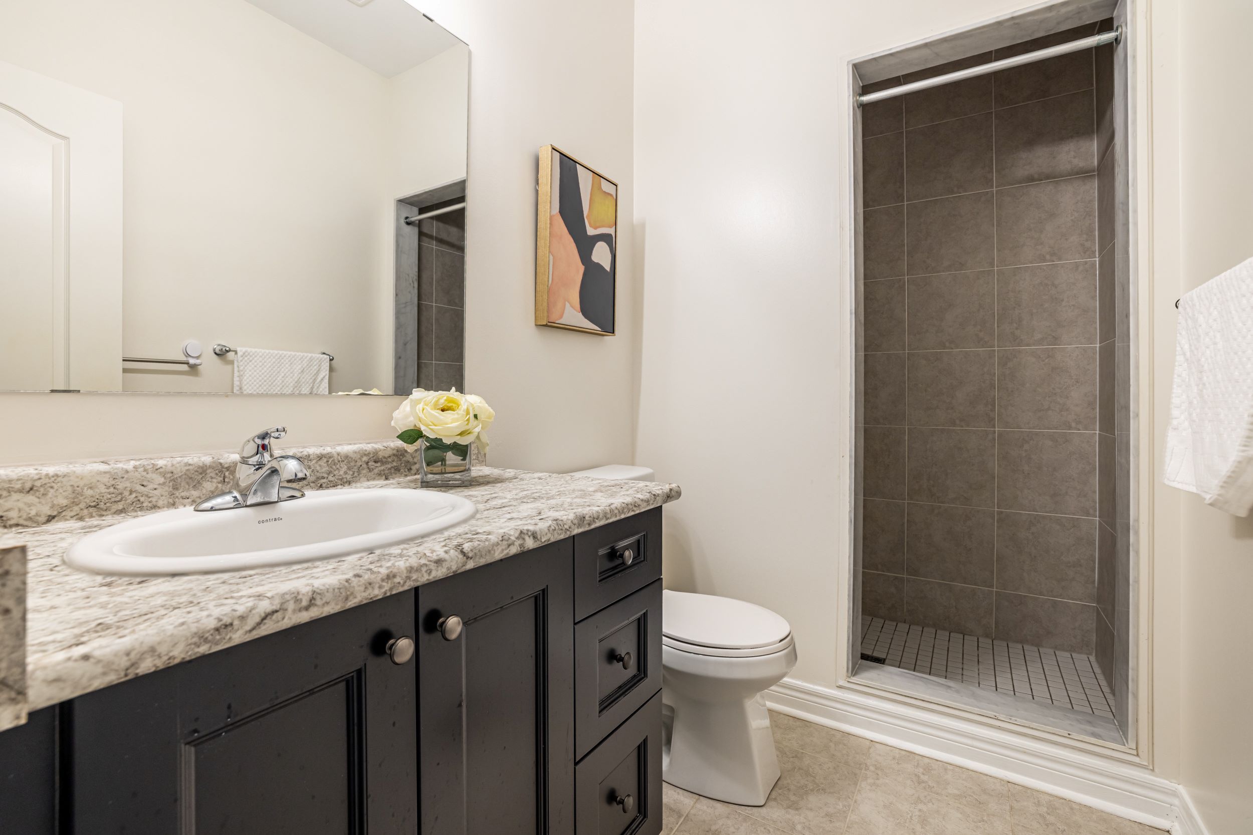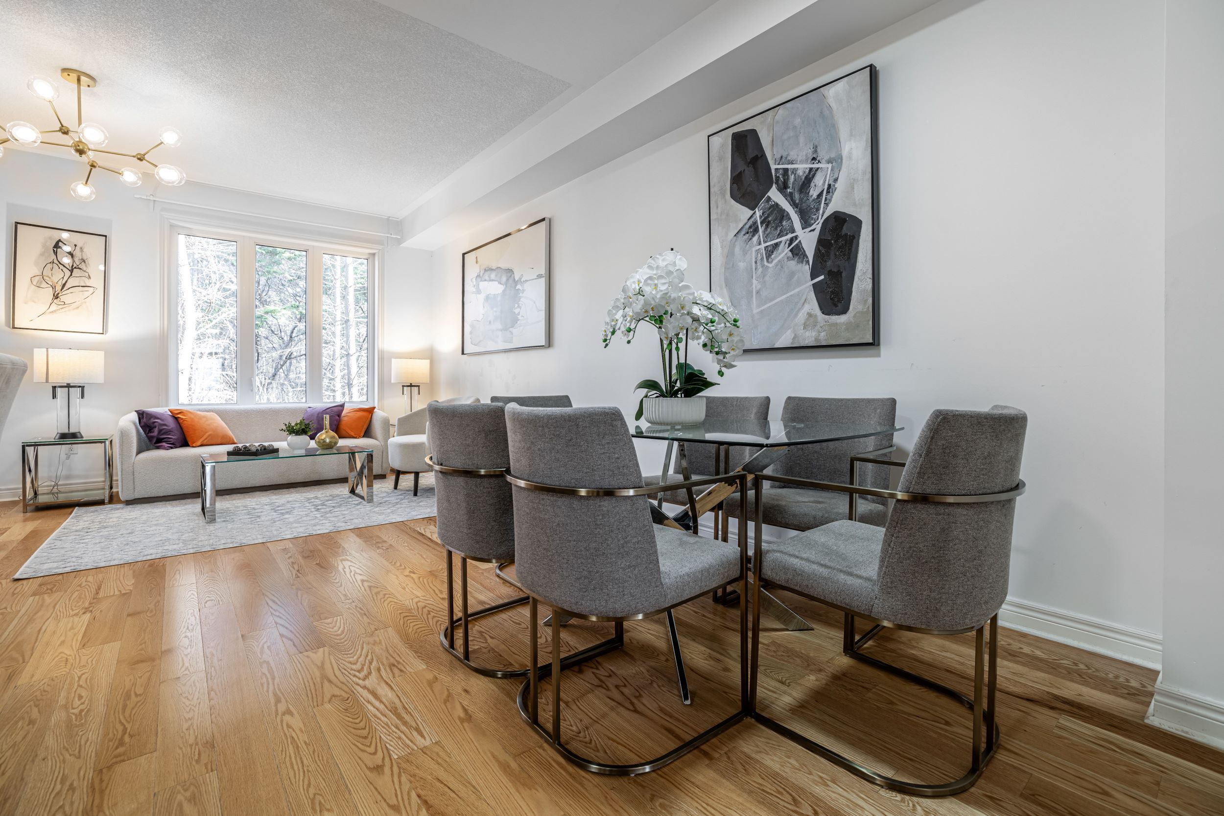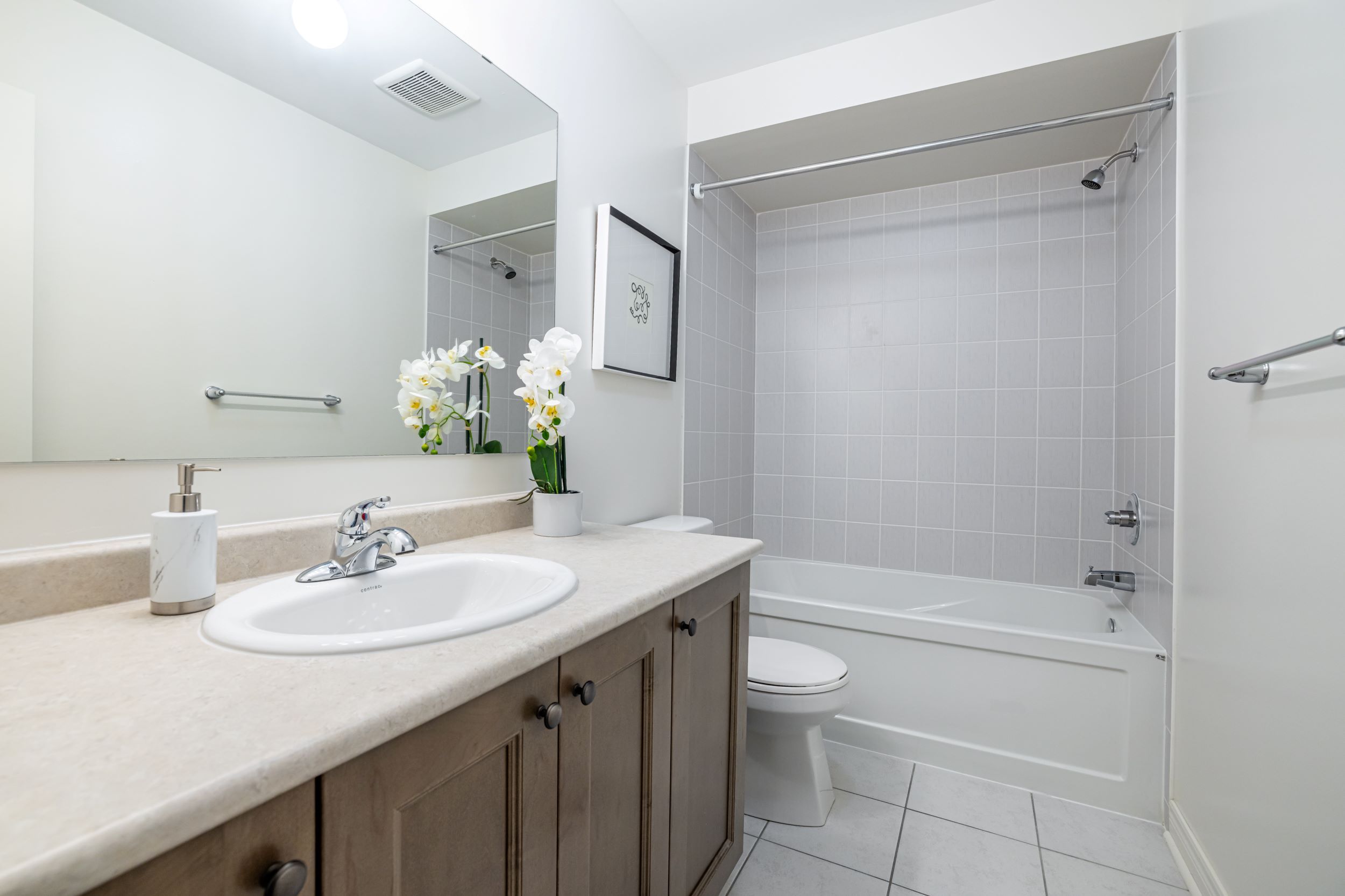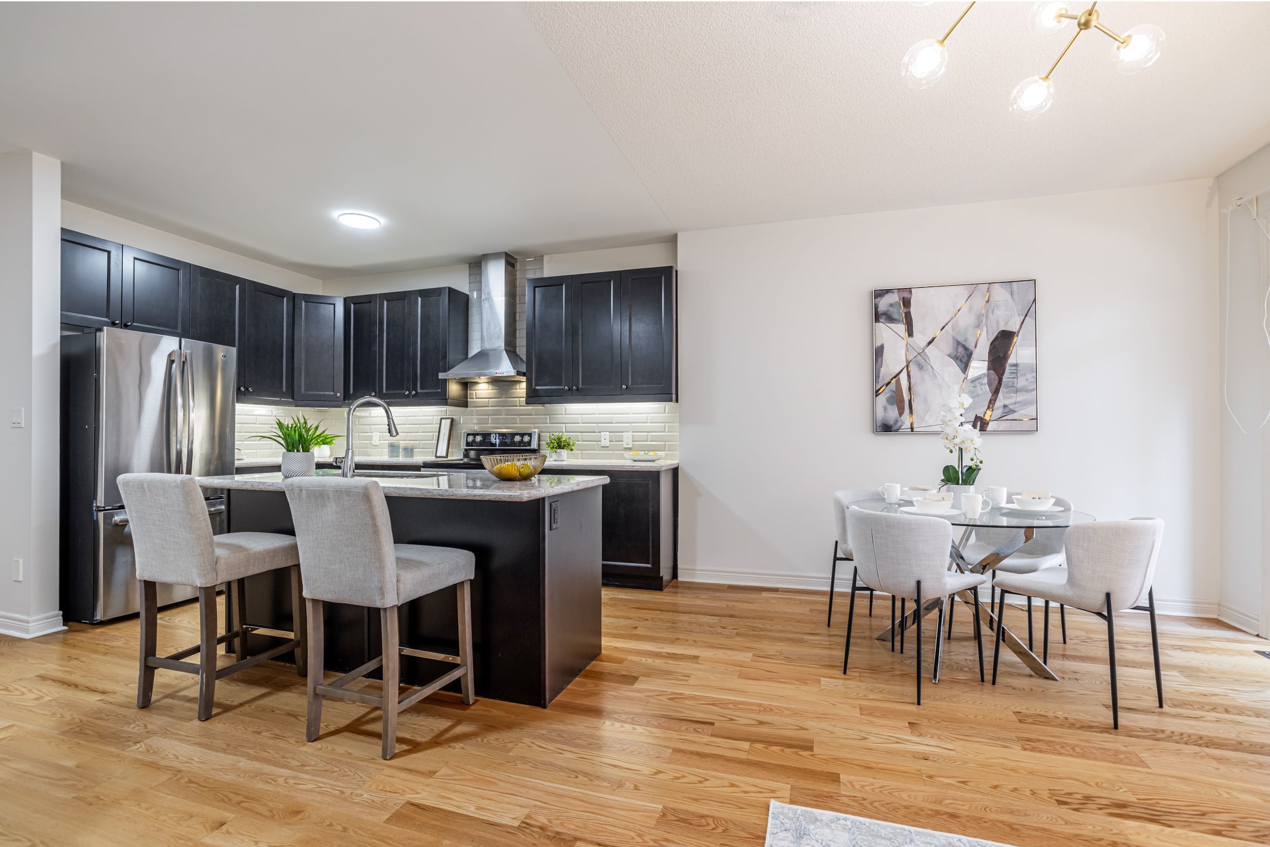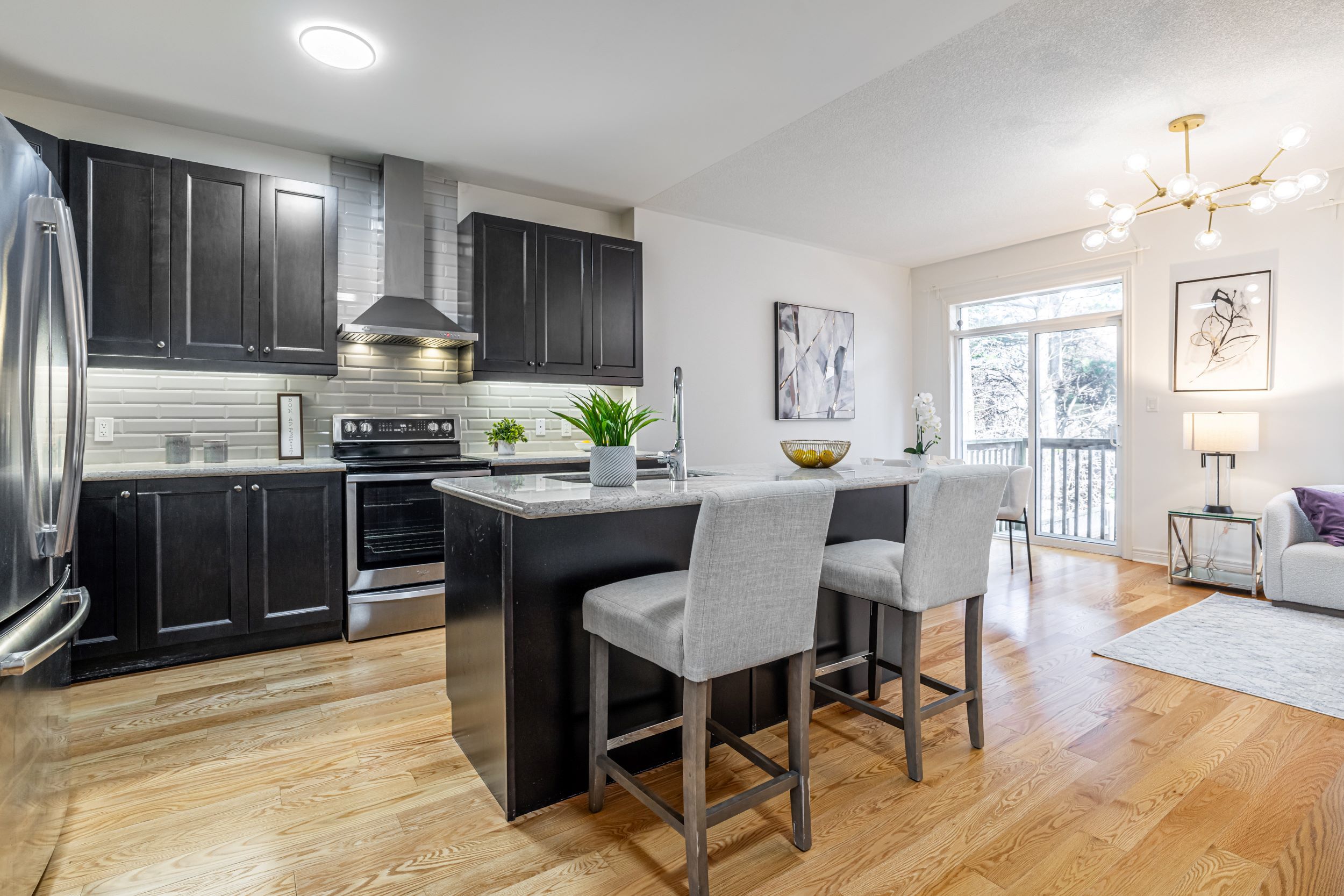 • Open-concept layout with modern kitchen featuring quartz countertops.