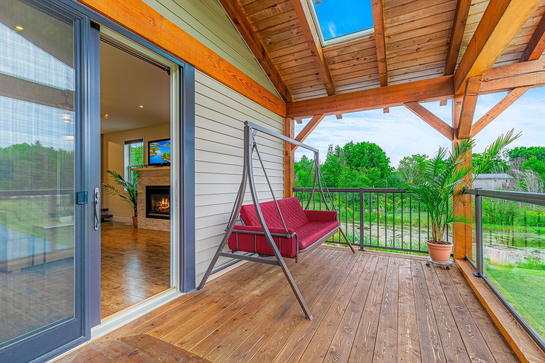 • Expansive outdoor decks overlooking a serene pond and wildlife.