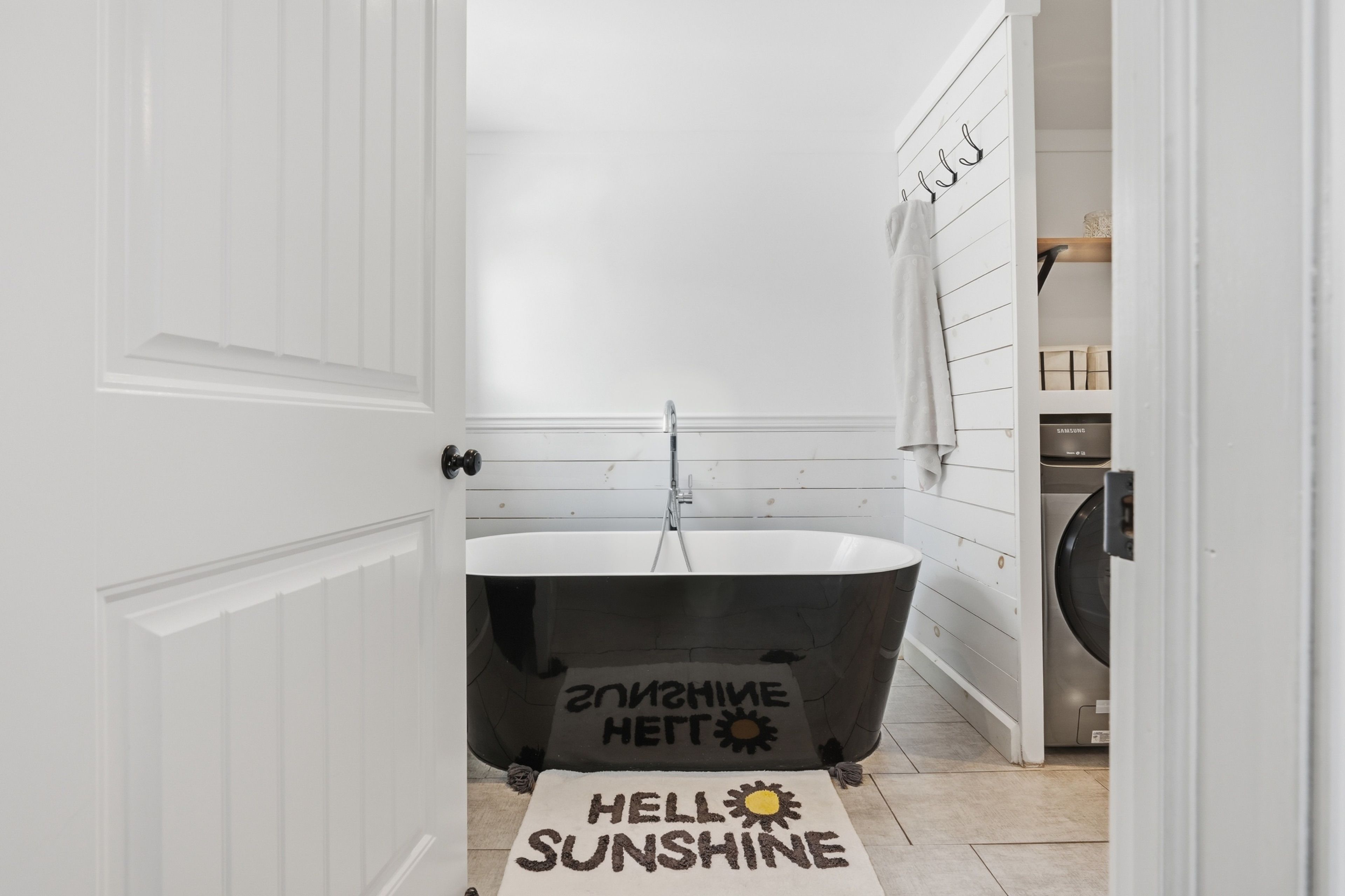 • Spa-inspired bathroom with a unique freestanding black tub.