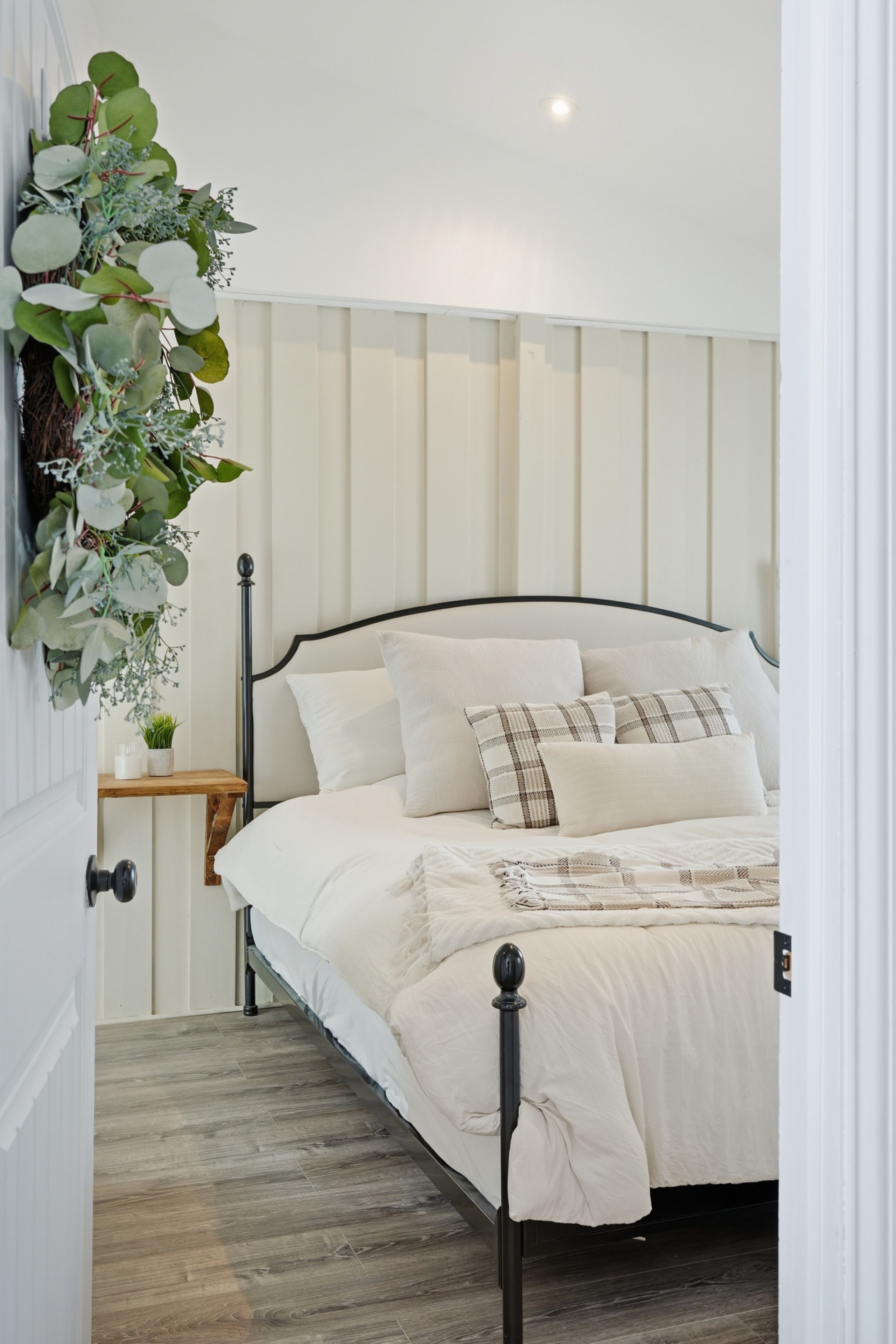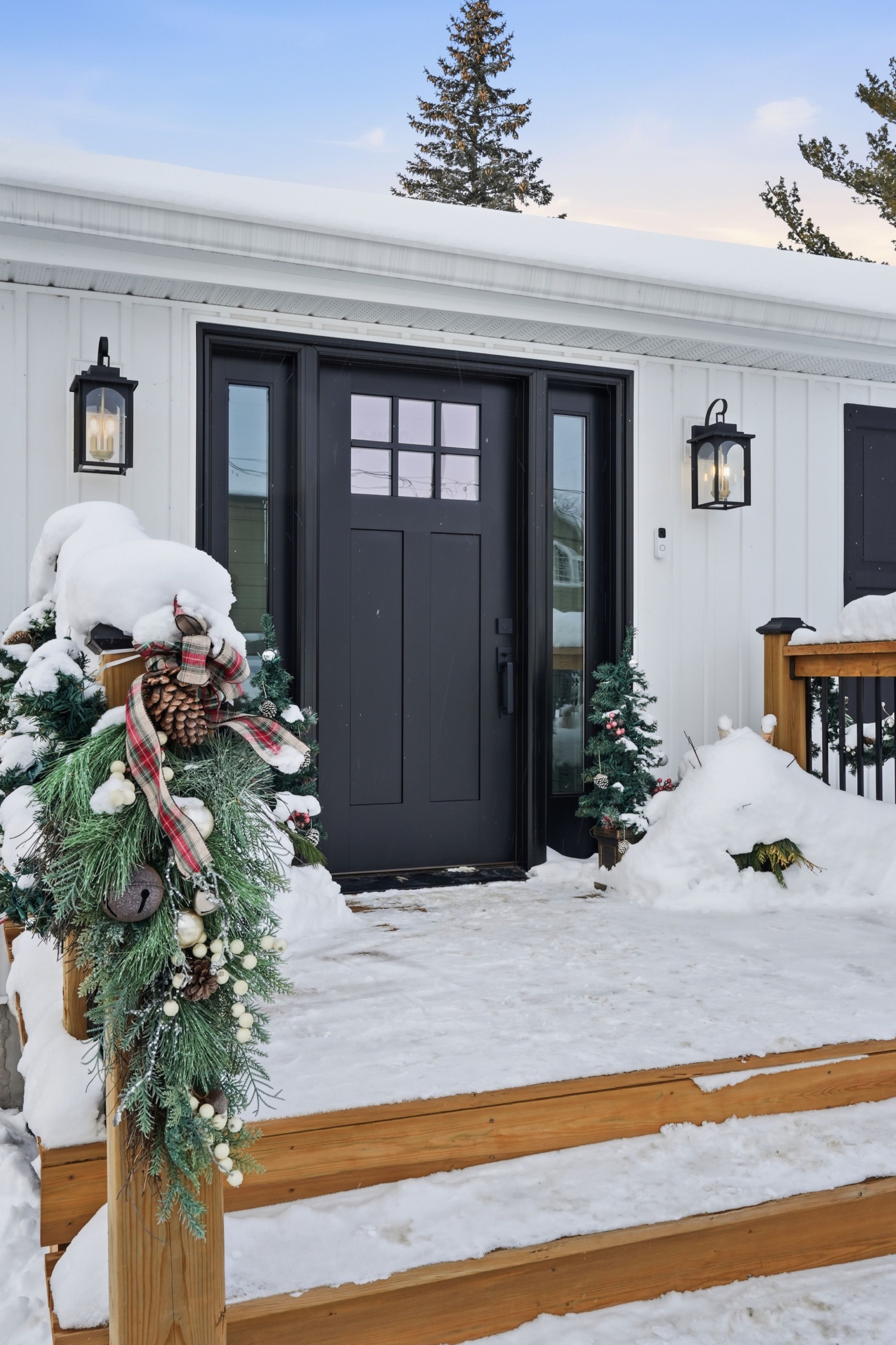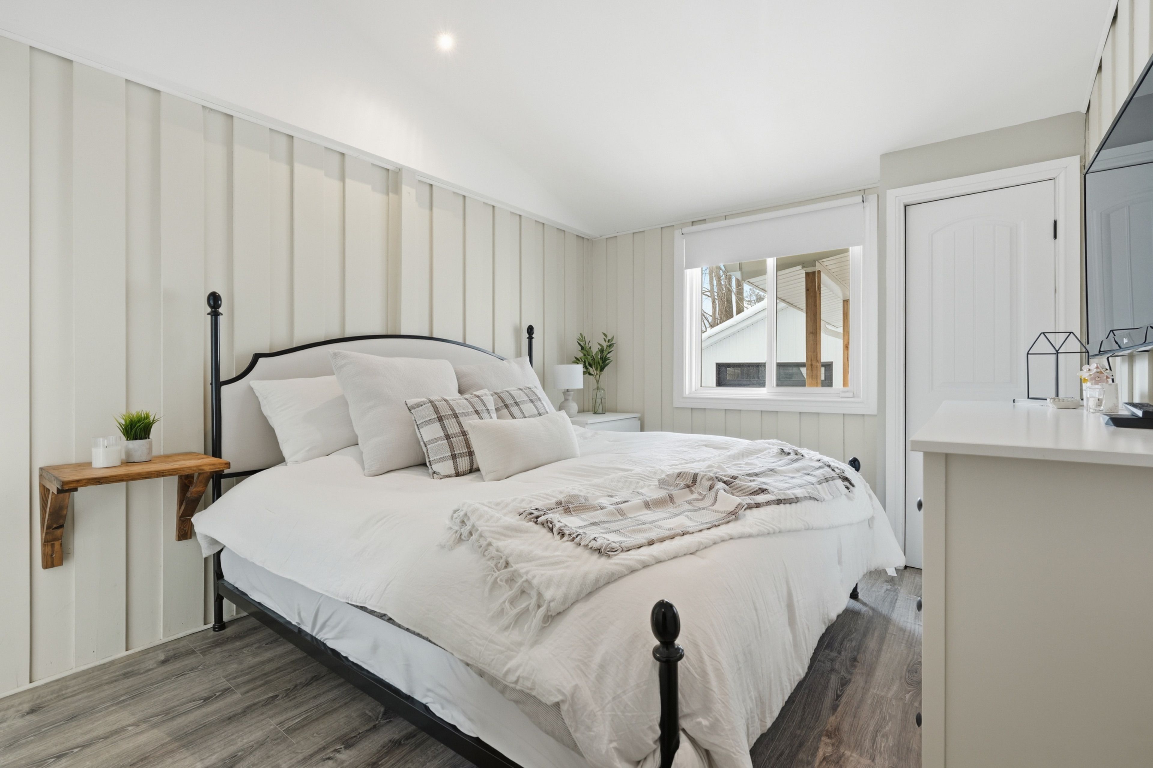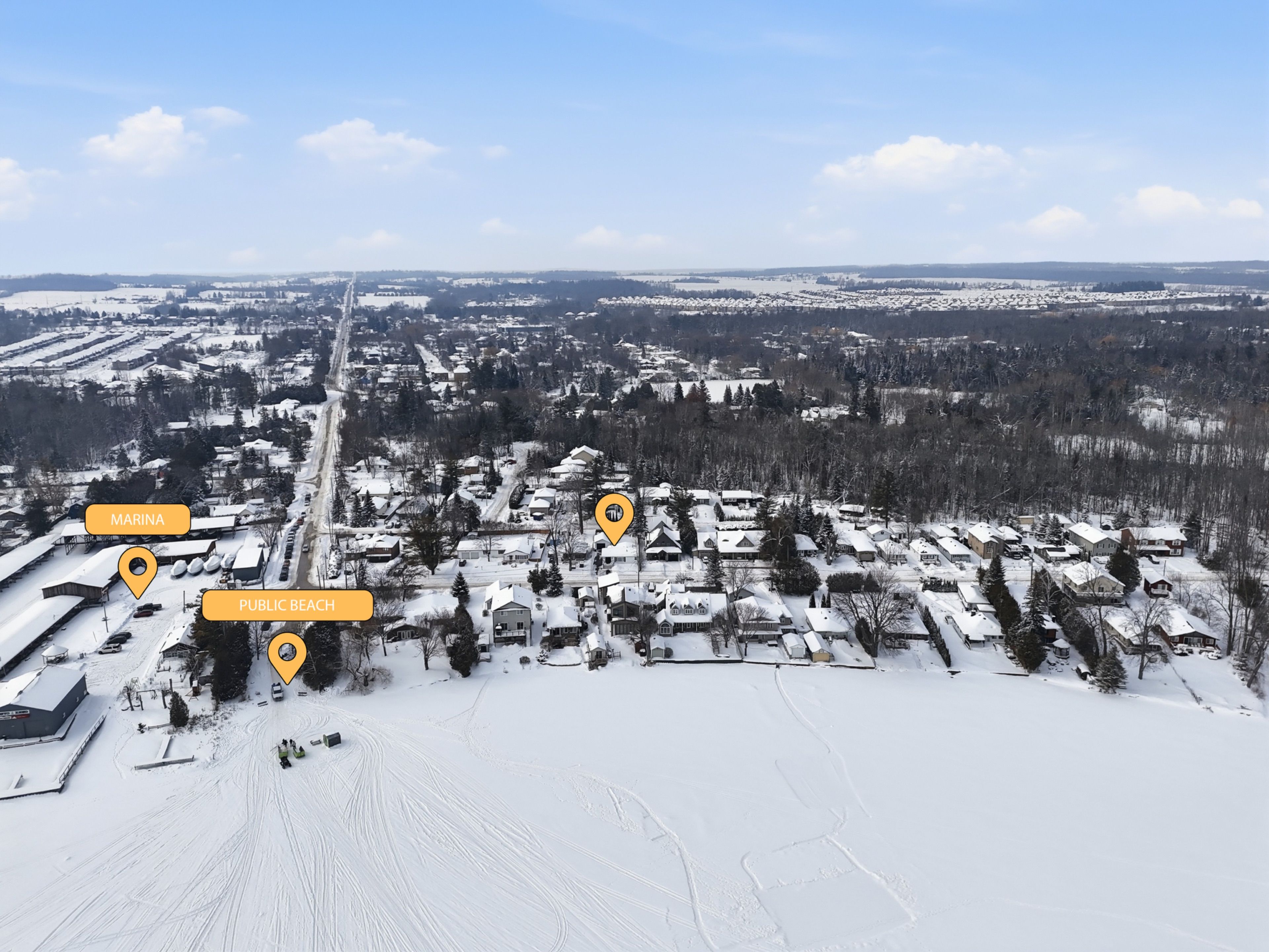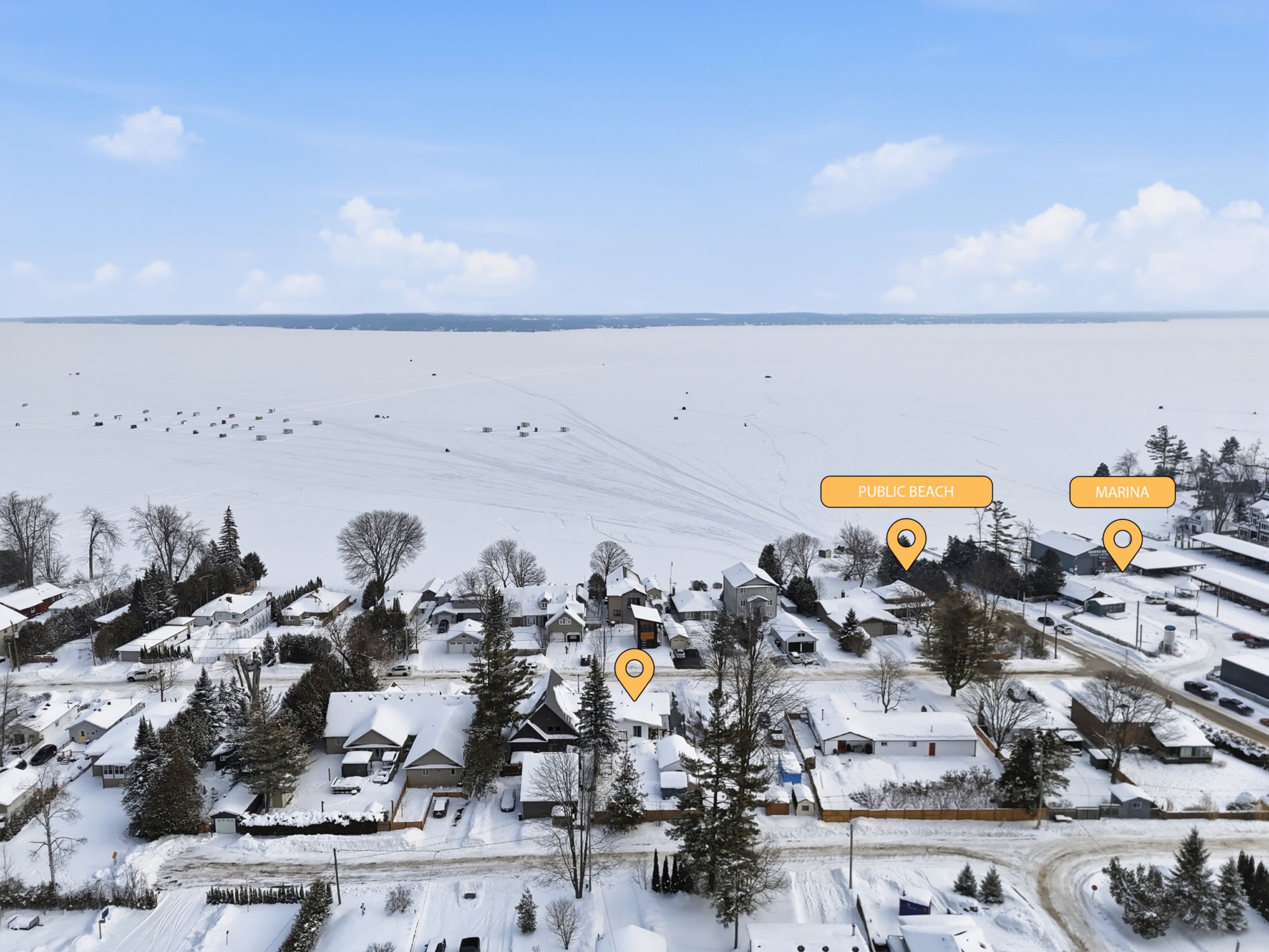 Beautiful bungalow in a prime lakeside setting, located directly across from lake simcoe on a quiet, charming street in the sought-after community of lefroy. This refined home offers 2 bedrooms and 2 bathrooms, thoughtfully designed with soaring vaulted ceilings and elegant laminate flooring throughout. The open-concept living space is anchored by a striking brick fireplace, creating a warm yet sophisticated focal point. A spa-inspired bathroom features a statement freestanding custom black tub, adding a touch of modern luxury. Beyond the beautiful finishes, enjoy peace of mind with mechanical updates for years to come! Set on a generous 50 x 133 ft lot, the property offers rare rear yard access - ideal for storing boats, recreational vehicles, or trailers. The detached, heated oversized single-car garage provides exceptional versatility for hobbies, storage, or workshop use. Enjoy an upscale lakeside lifestyle with multiple lake access points and a marina just down the road, all within a peaceful, established neighbourhood. An exceptional opportunity to own a beautifully updated home in a coveted waterfront-adjacent location.