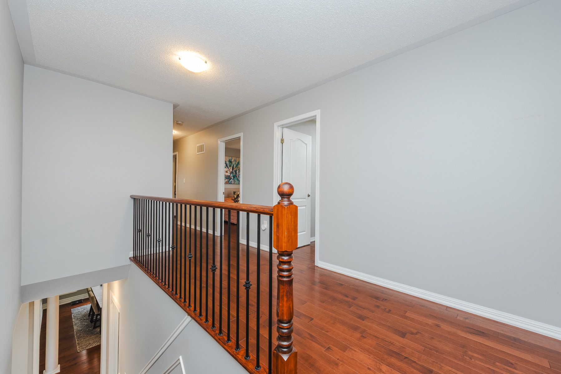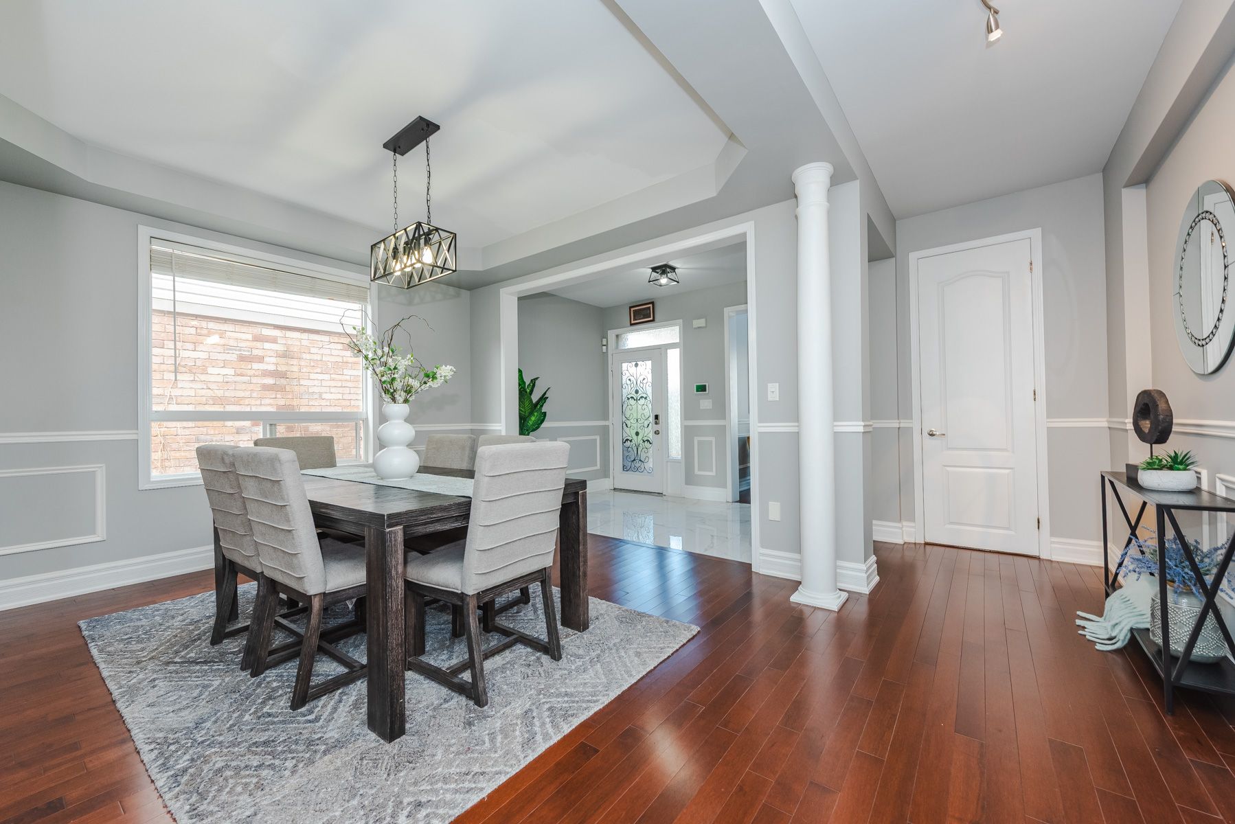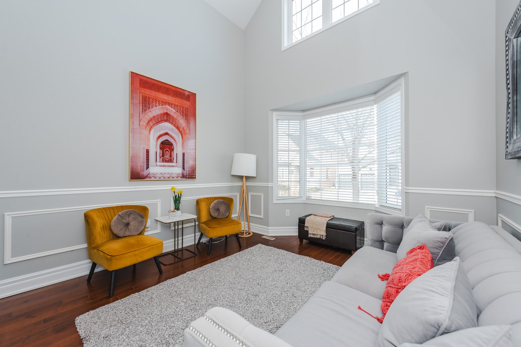 • Bright living room with soaring ceilings and hardwood flooring.