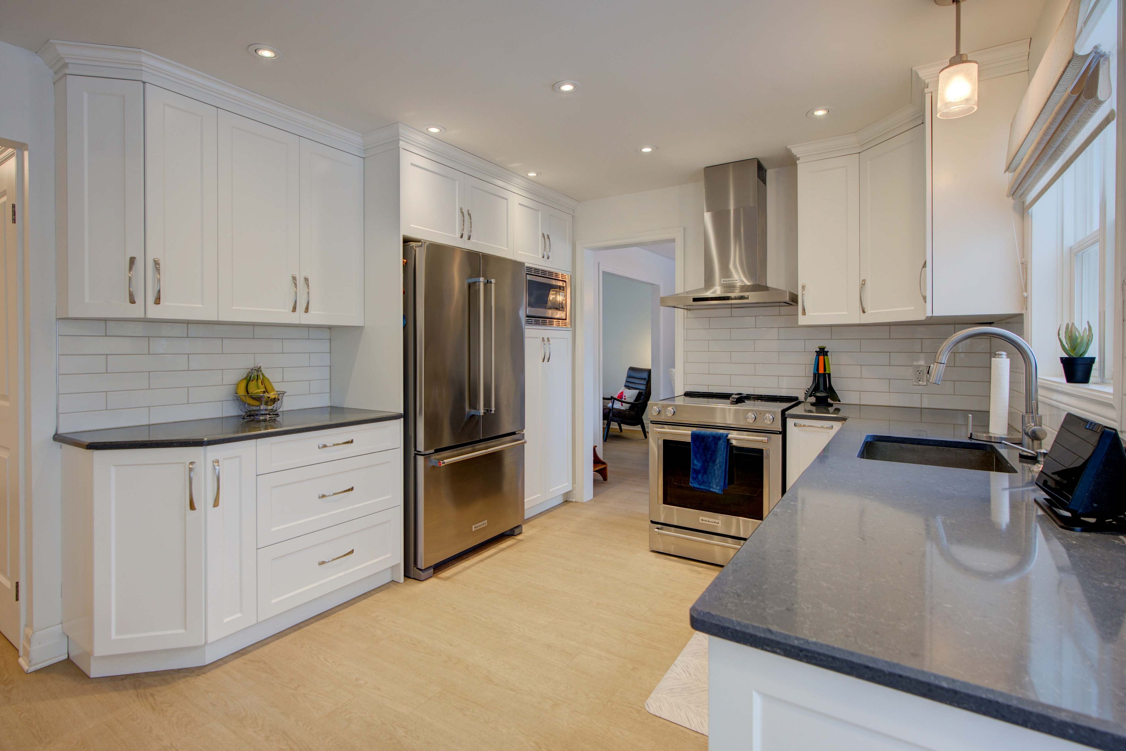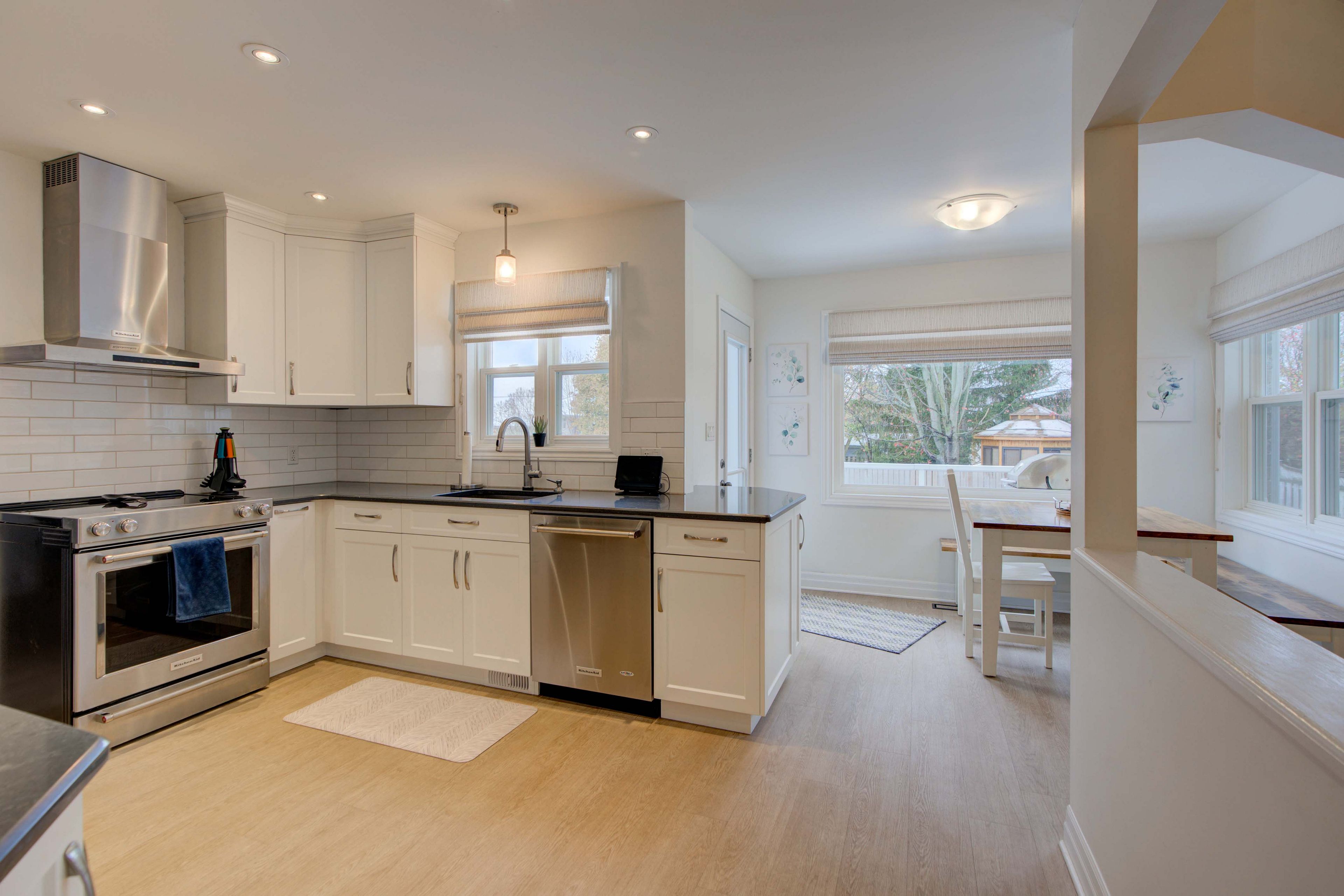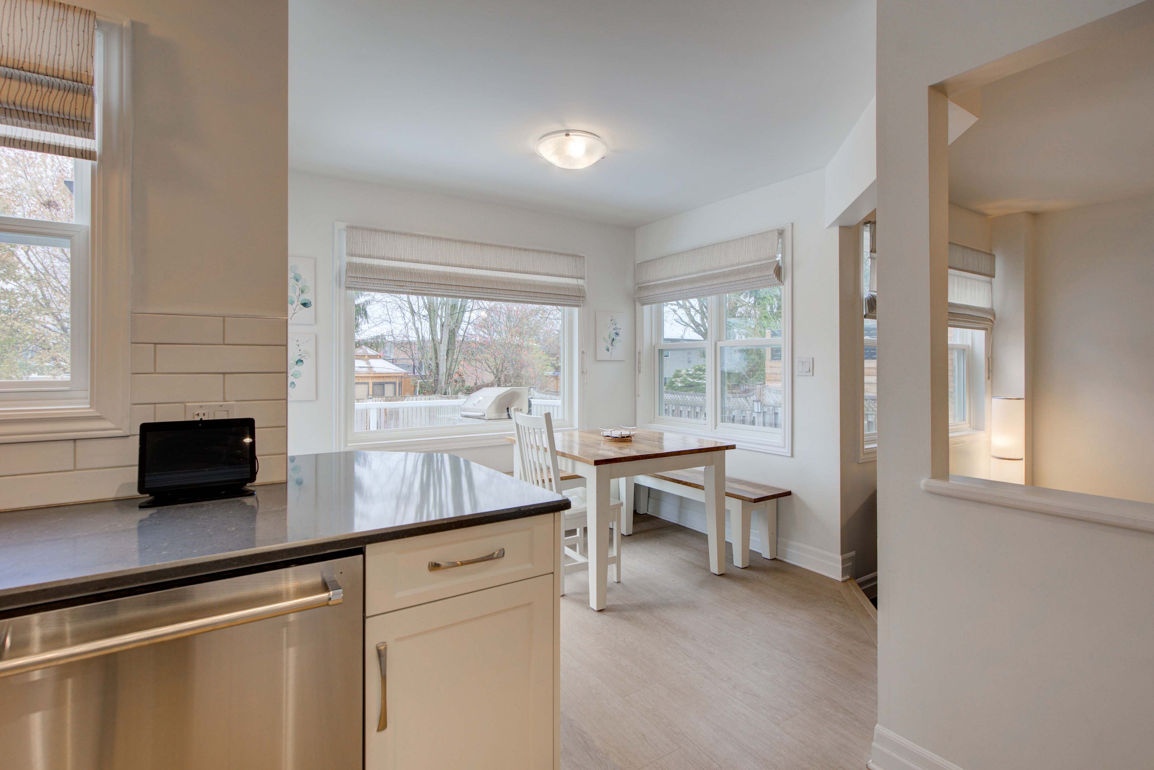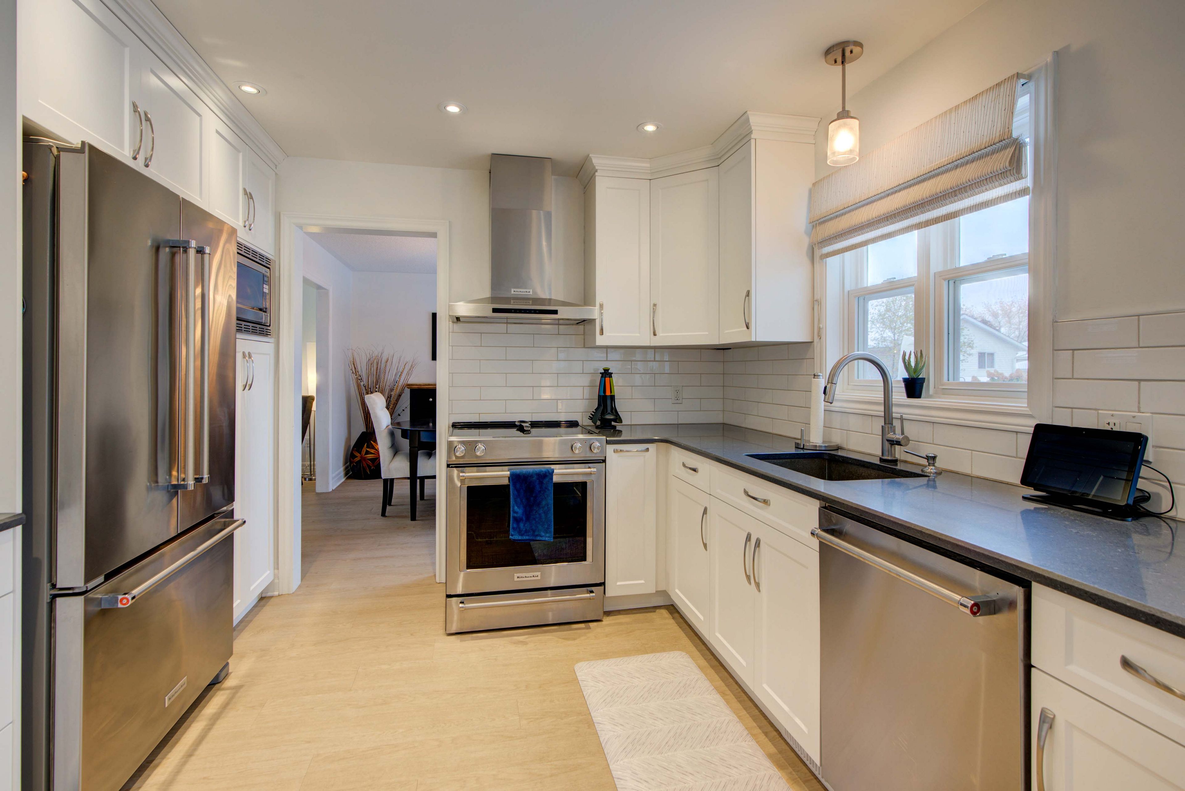 • Modern kitchen opens to a private backyard with a pool.