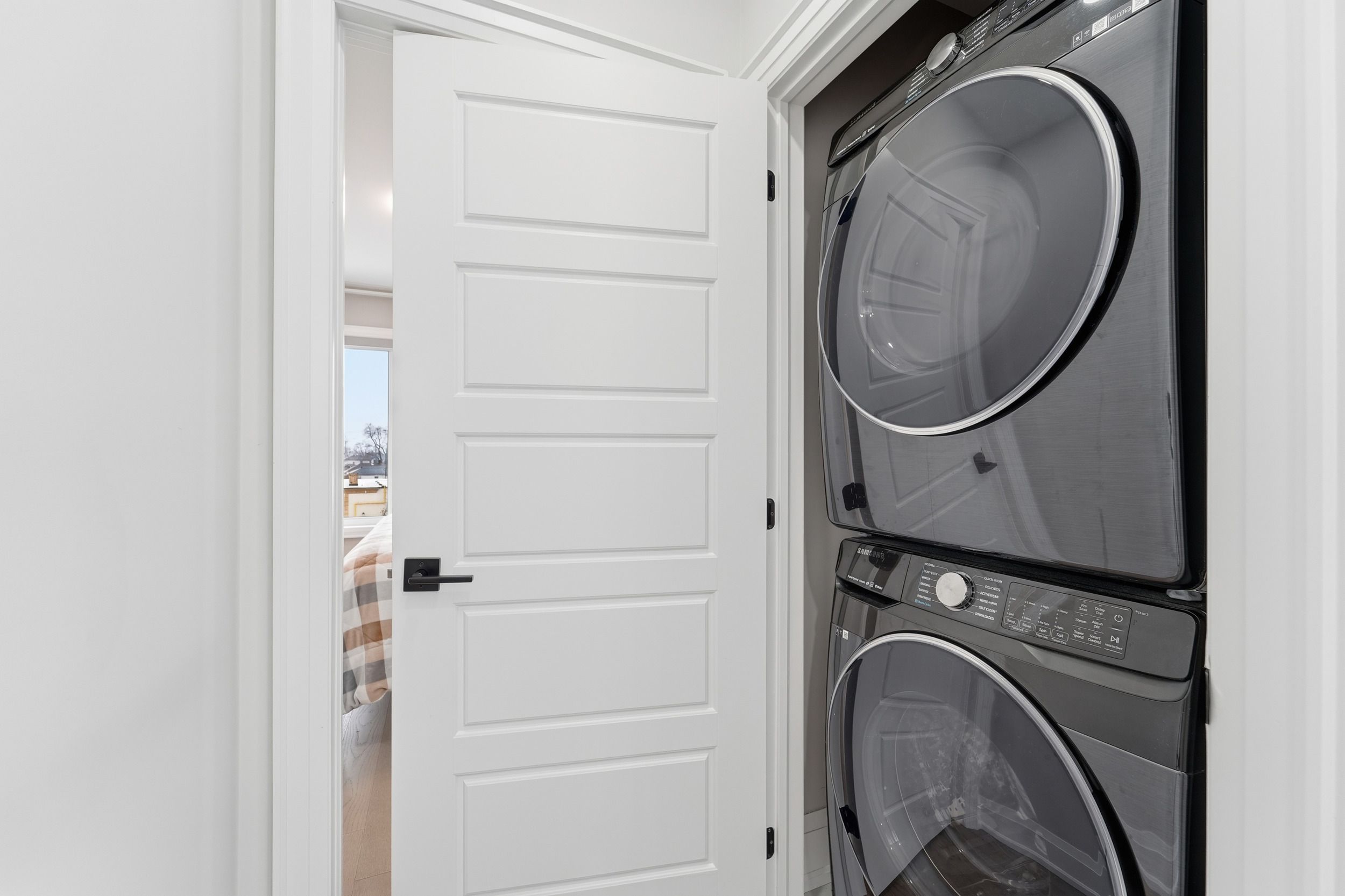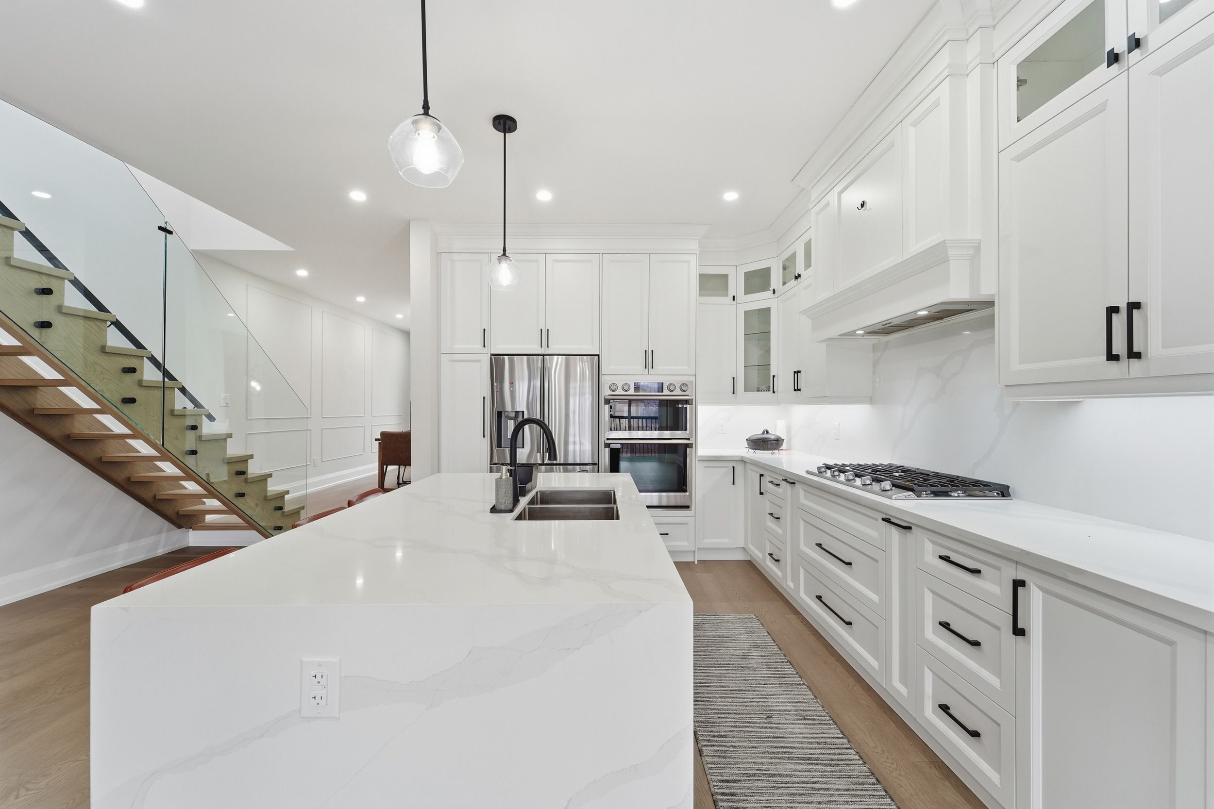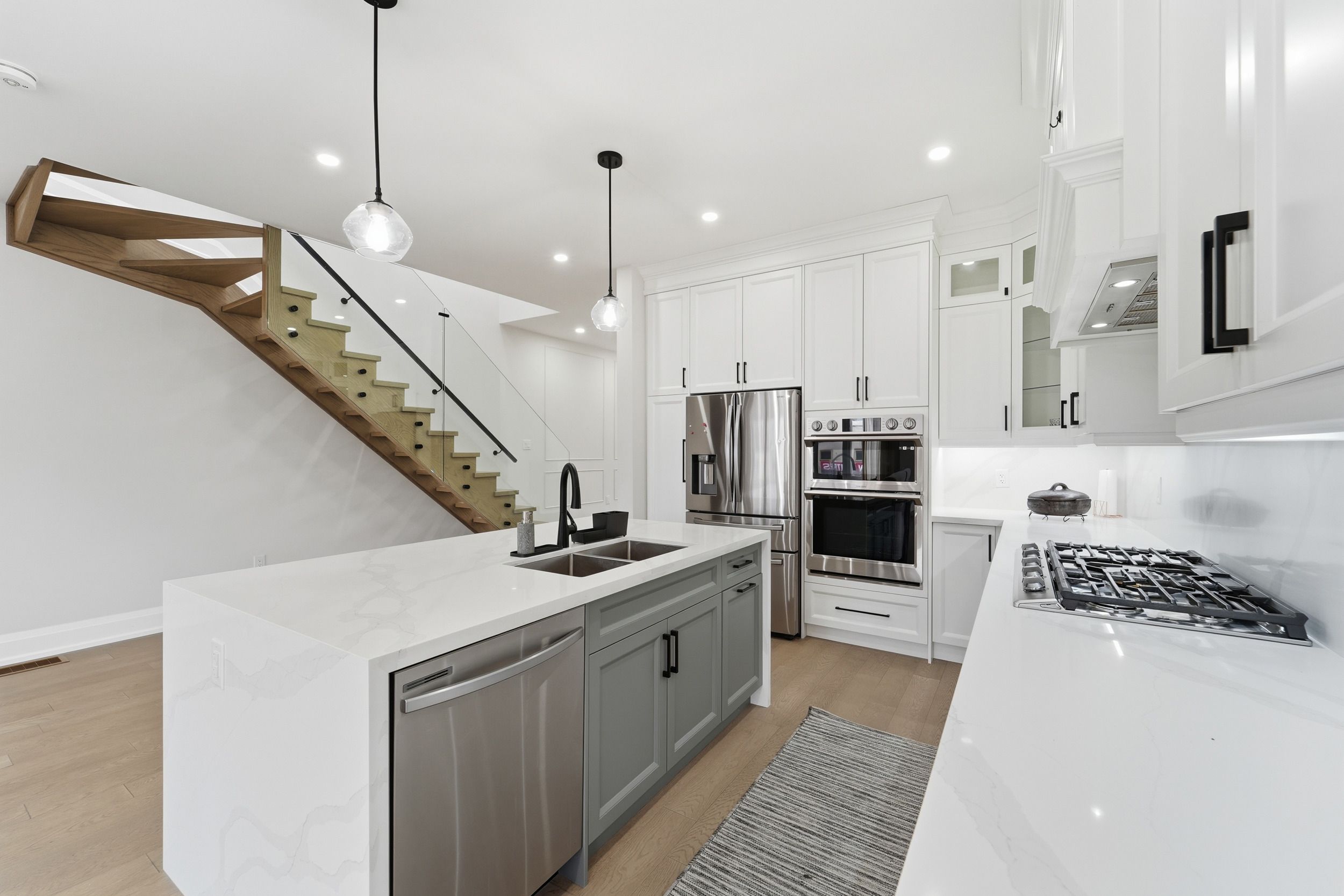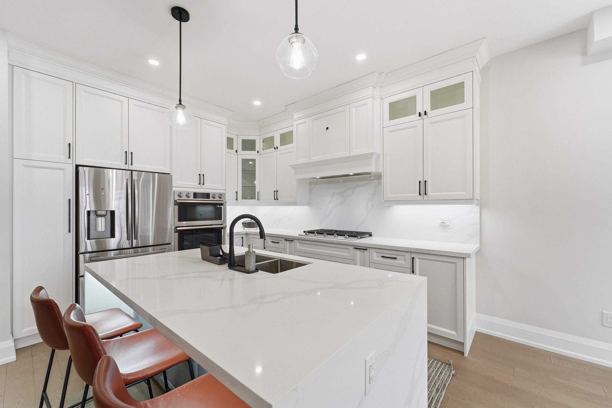 • Gourmet kitchen features stainless steel appliances and quartz countertops.