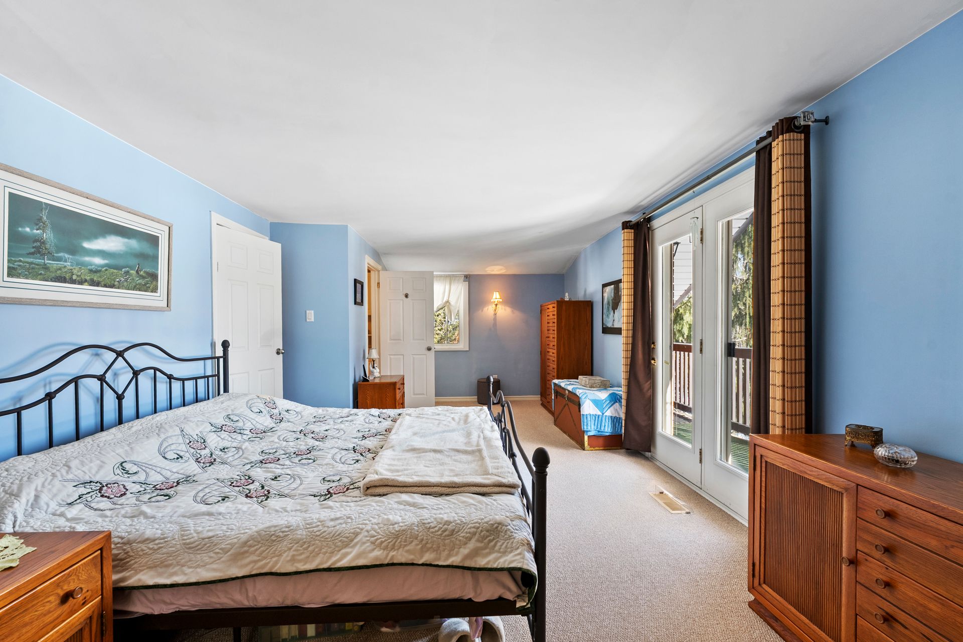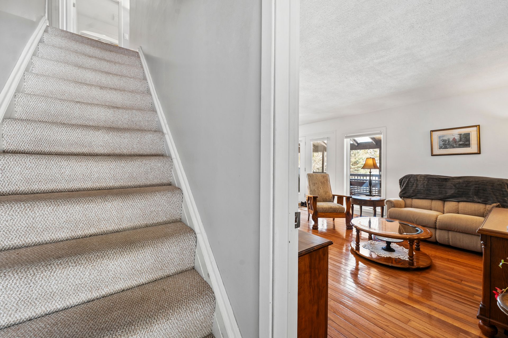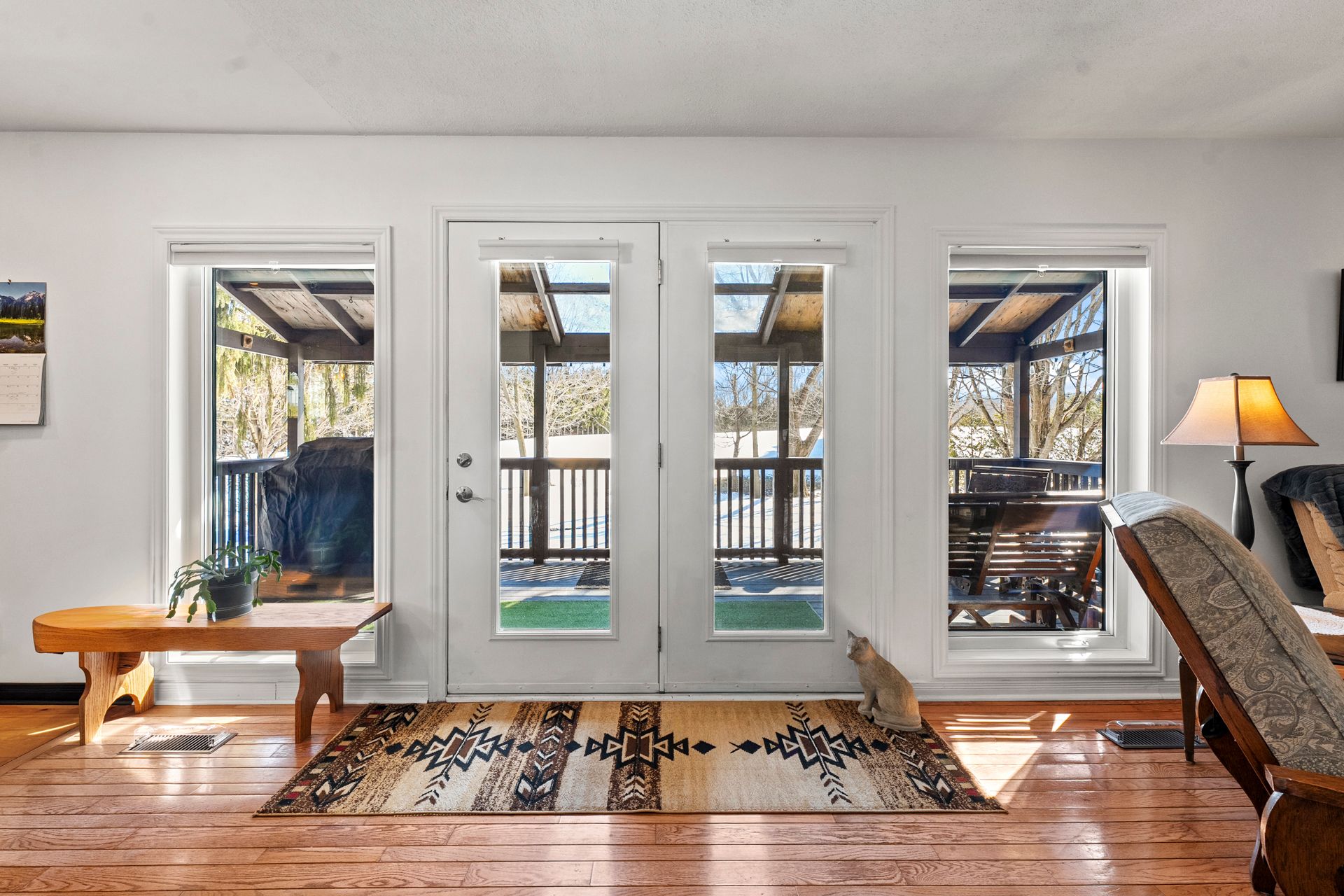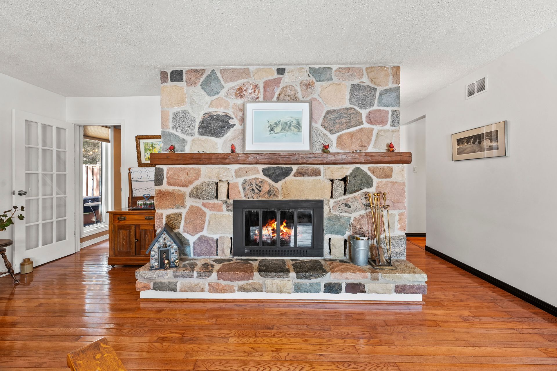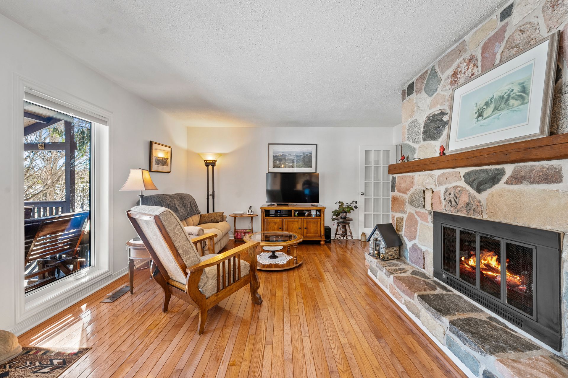 • Spacious living room with a wood-burning fireplace and covered porch views.