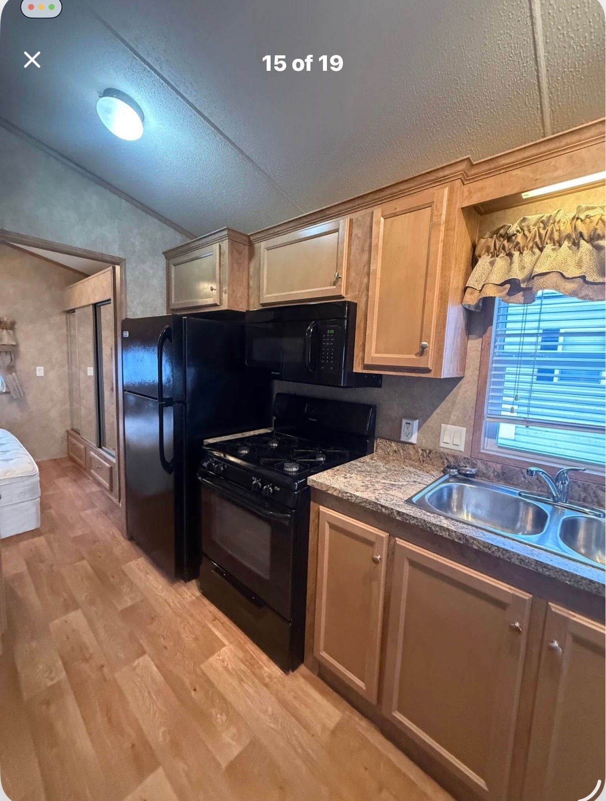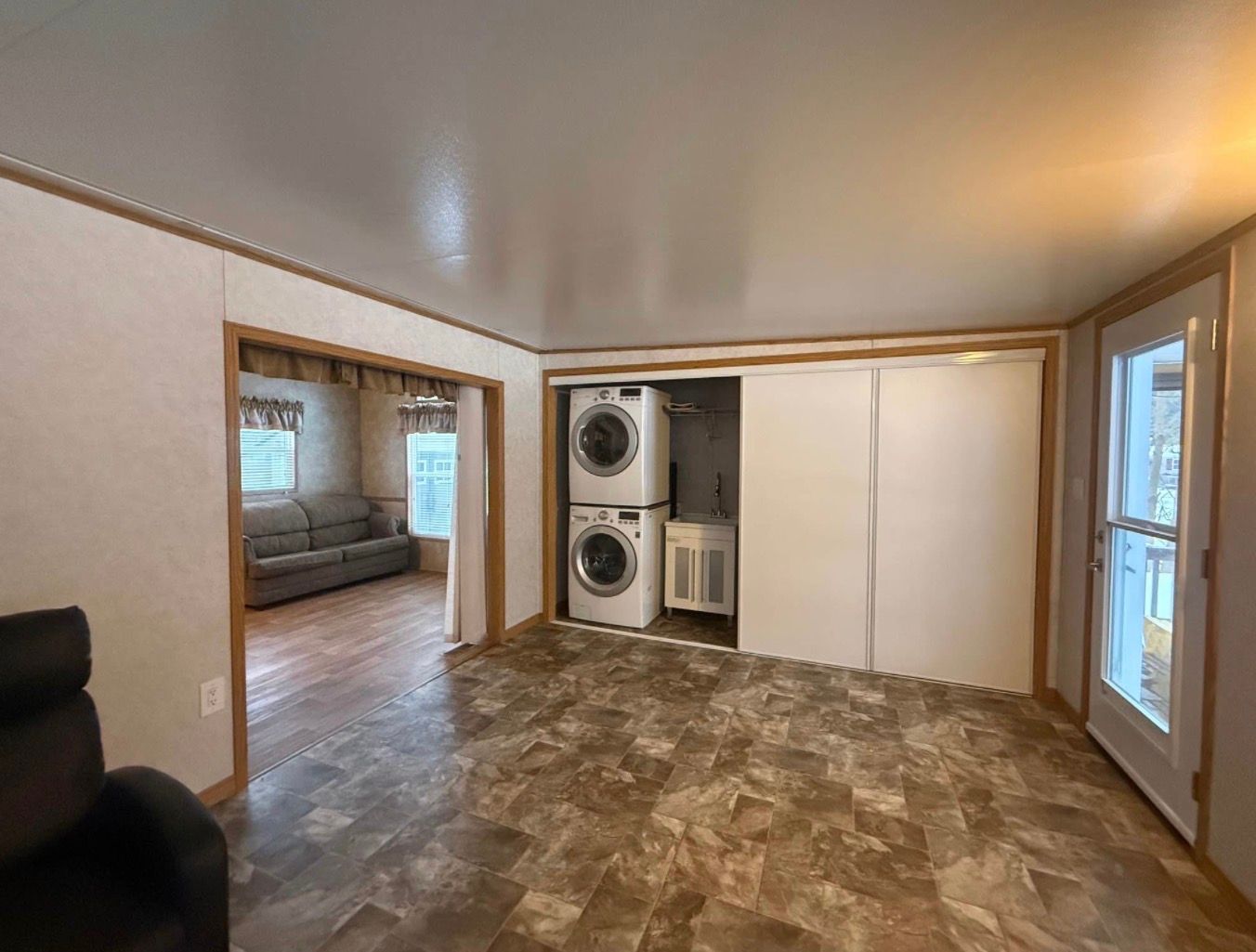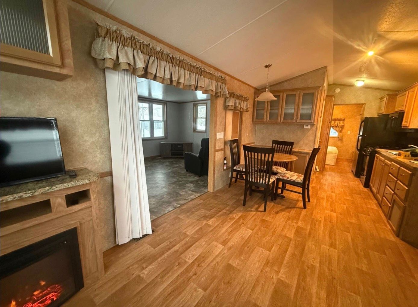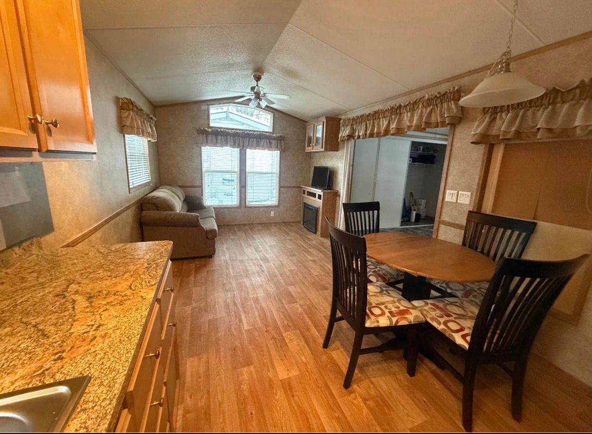 Escape to your own slice of seasonal paradise with this beautifully maintained 2017 forest river park model, ideally located in the sought-after 9-month section of happy hills resort. Tucked away in a quiet area of the park, this property offers relaxation, comfort, and outdoor enjoyment. Step inside to a bright and inviting front living room, complete with a cozy built-in fireplace, paddle fan with lighting, and sofa bed-perfect for hosting family and friends. The open-concept kitchen features black appliances, full-size fridge, propane stove, over the range microwave, and a dining area with seating for four, making entertaining easy and enjoyable. This unit offers 1 bedroom plus a versatile add-a-room, which can easily be converted into a second bedroom, giving you flexible space for guests or extended stays. The rear bedroom includes a queen-size bed and mirrored wardrobe, while the 4-piece bathroom provides both a tub and shower. Enjoy the convenience of in-suite laundry with a full-size washer and propane dryer, plus on-demand hot water for efficient, comfortable living. Outside is where this property truly shines-as you relax under the covered front porch, or unwind in the recessed hot tub. With a large carport and parking for up to 3 vehicles, there's plenty of space for family and friends. Whether you're looking for a weekend retreat, a seasonal getaway, or a place to create lasting memories, this happy hills gem delivers it all.