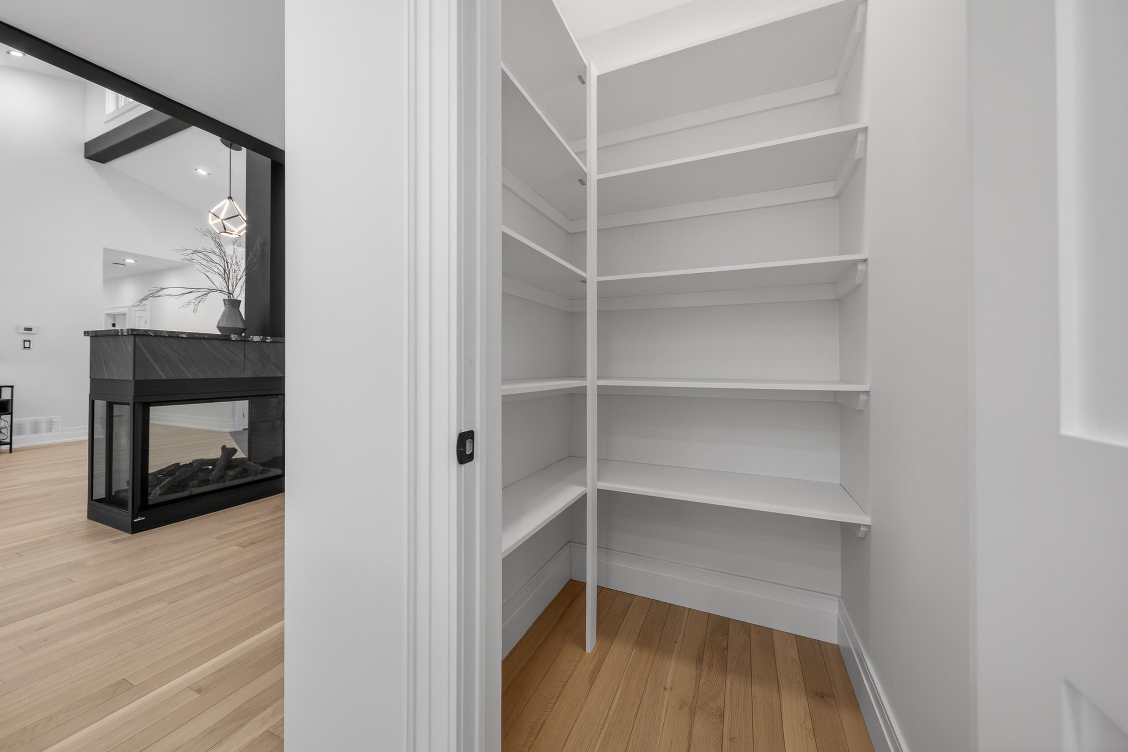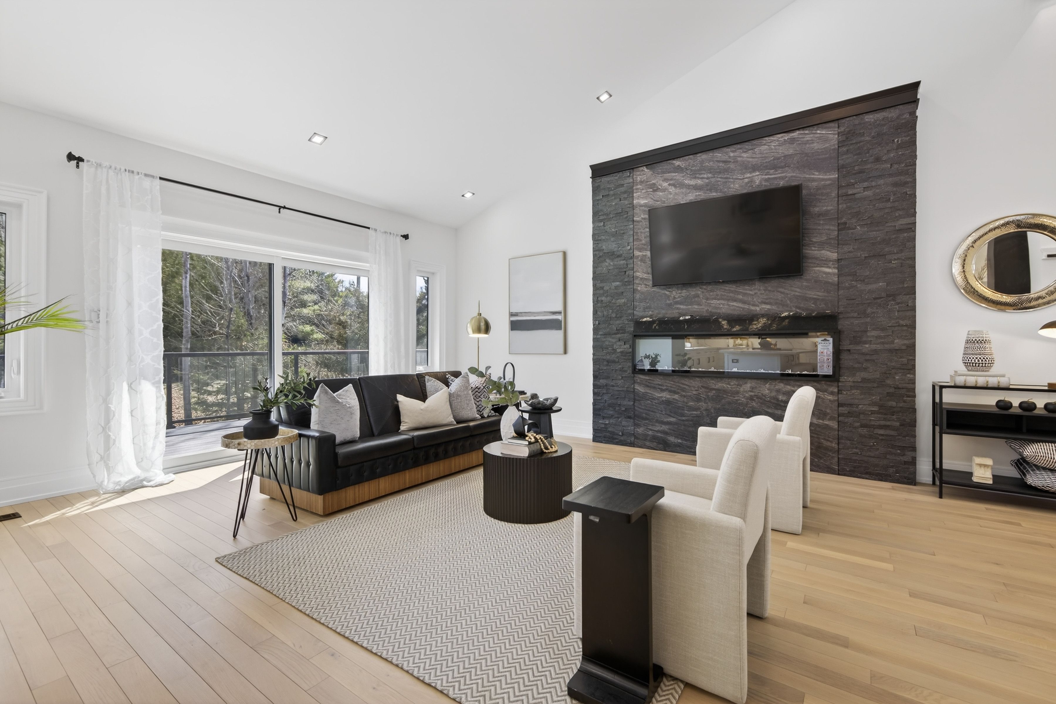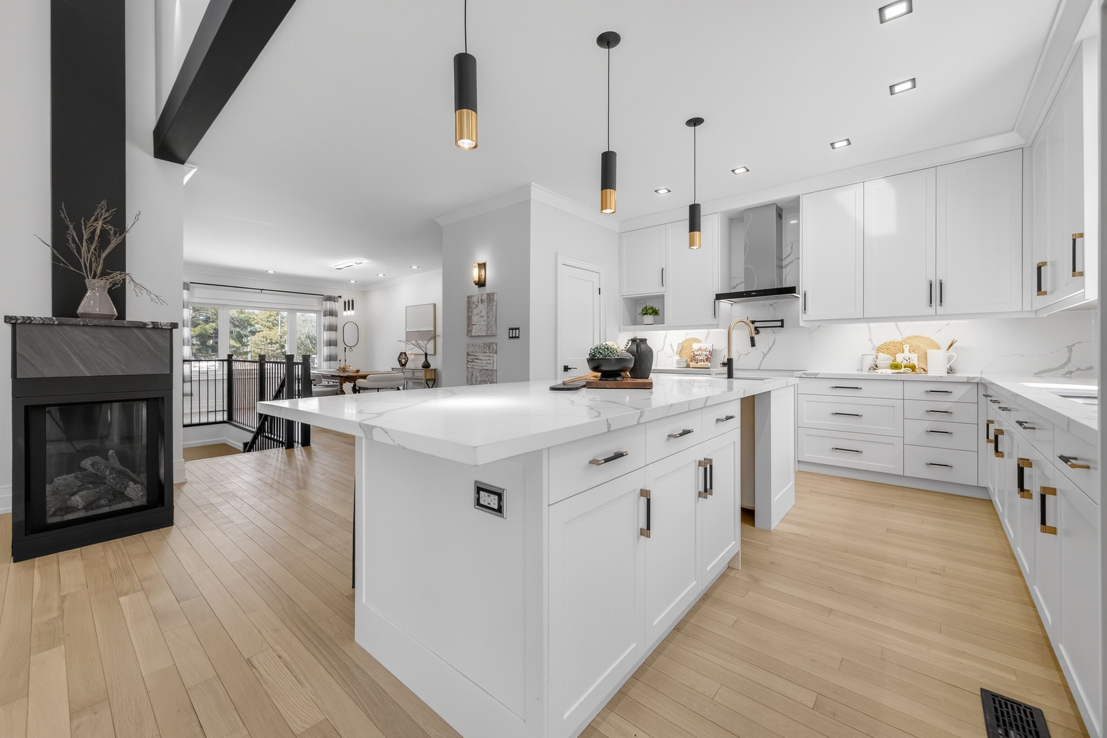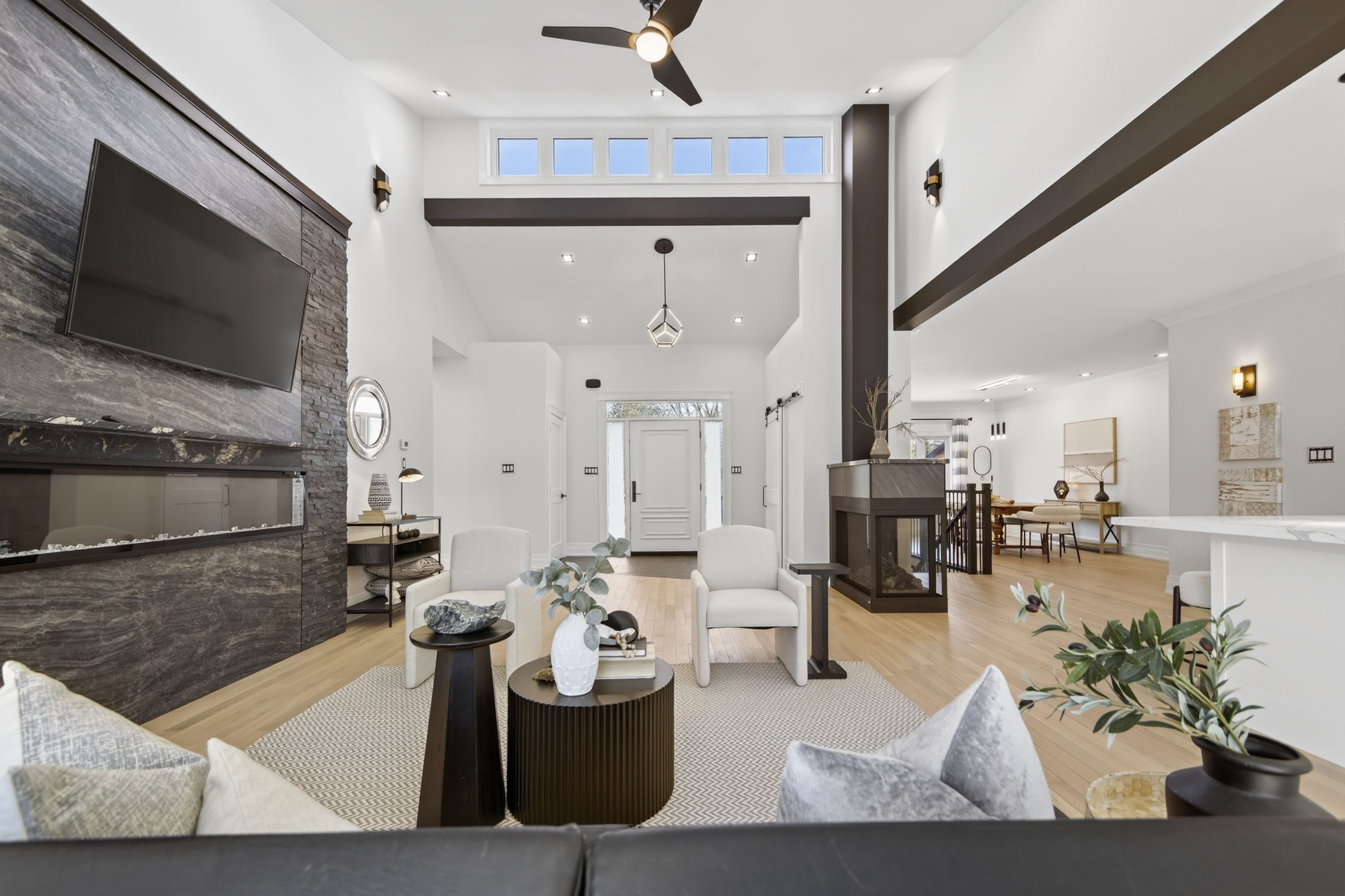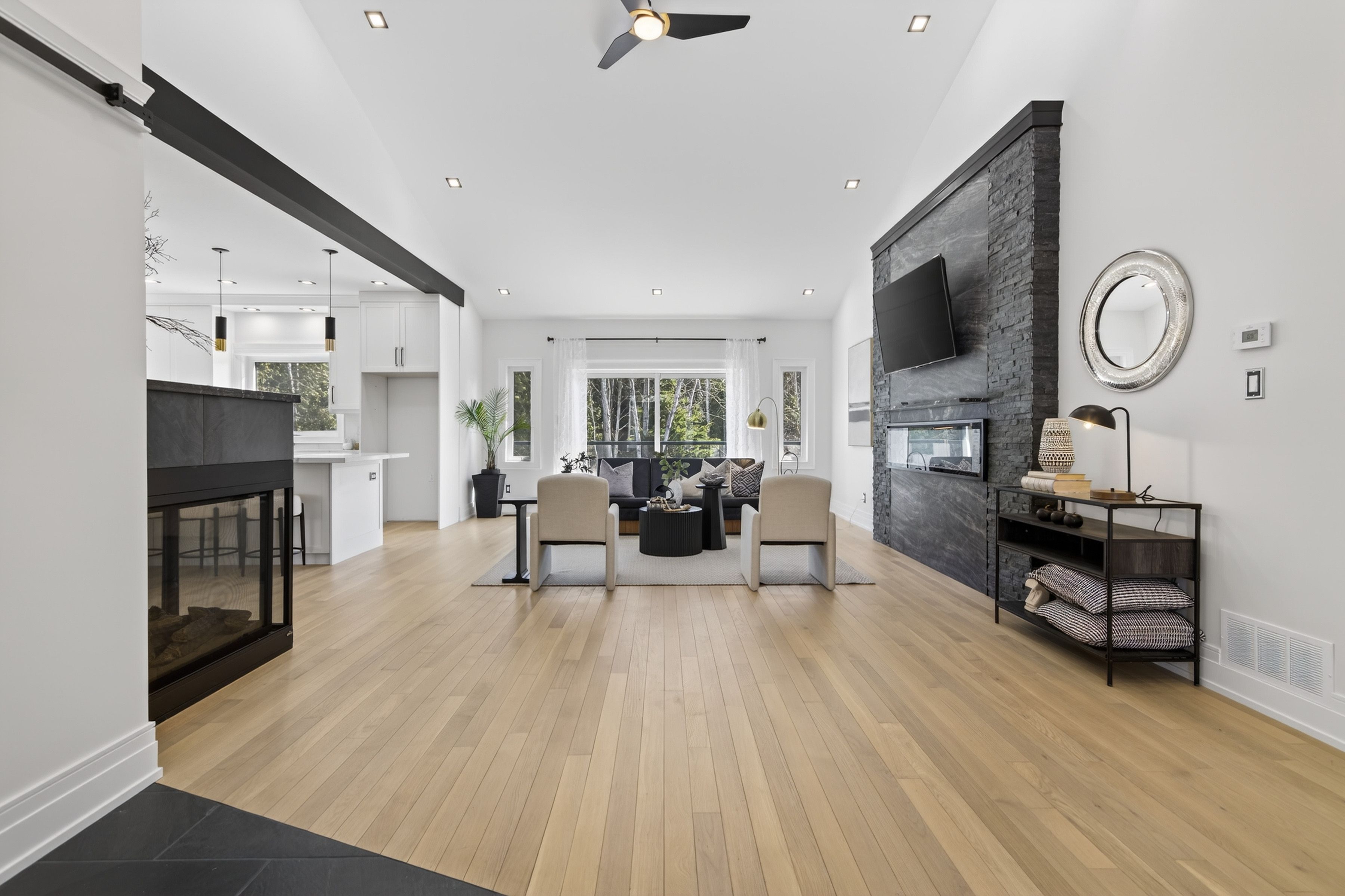• Open-concept living room with cathedral ceiling and a cozy three-sided fireplace.