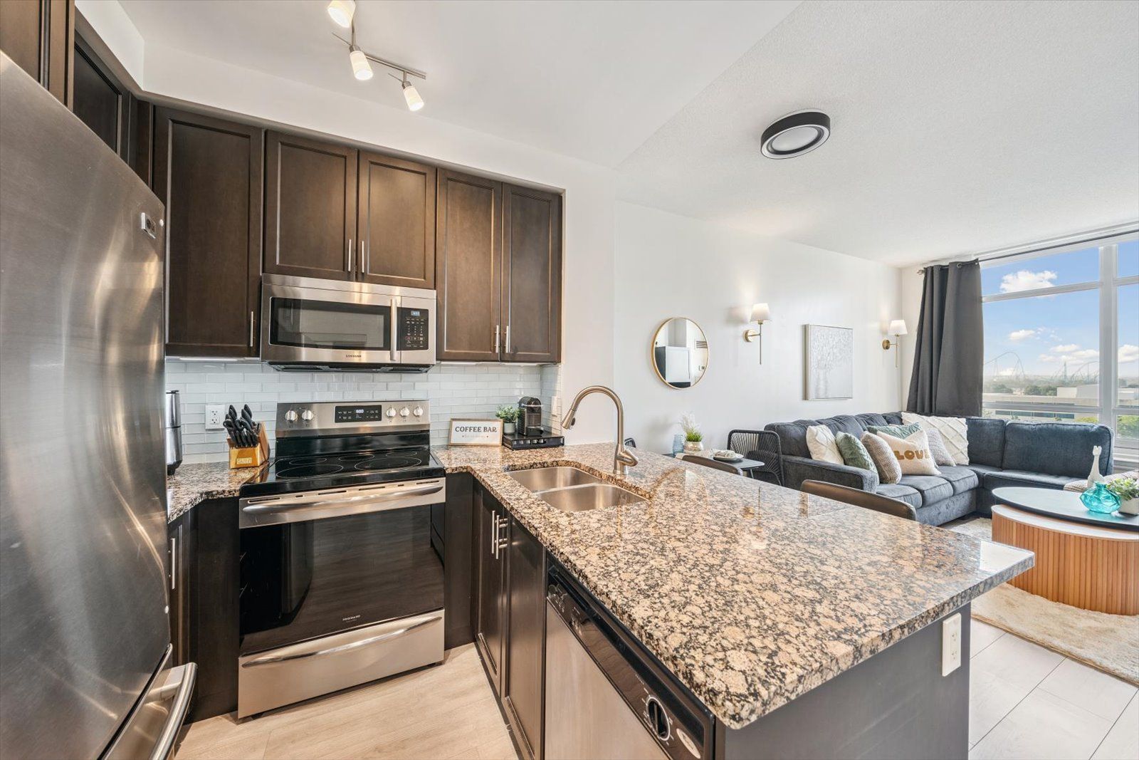 • Open-concept design featuring 9' ceilings and modern stainless steel appliances.