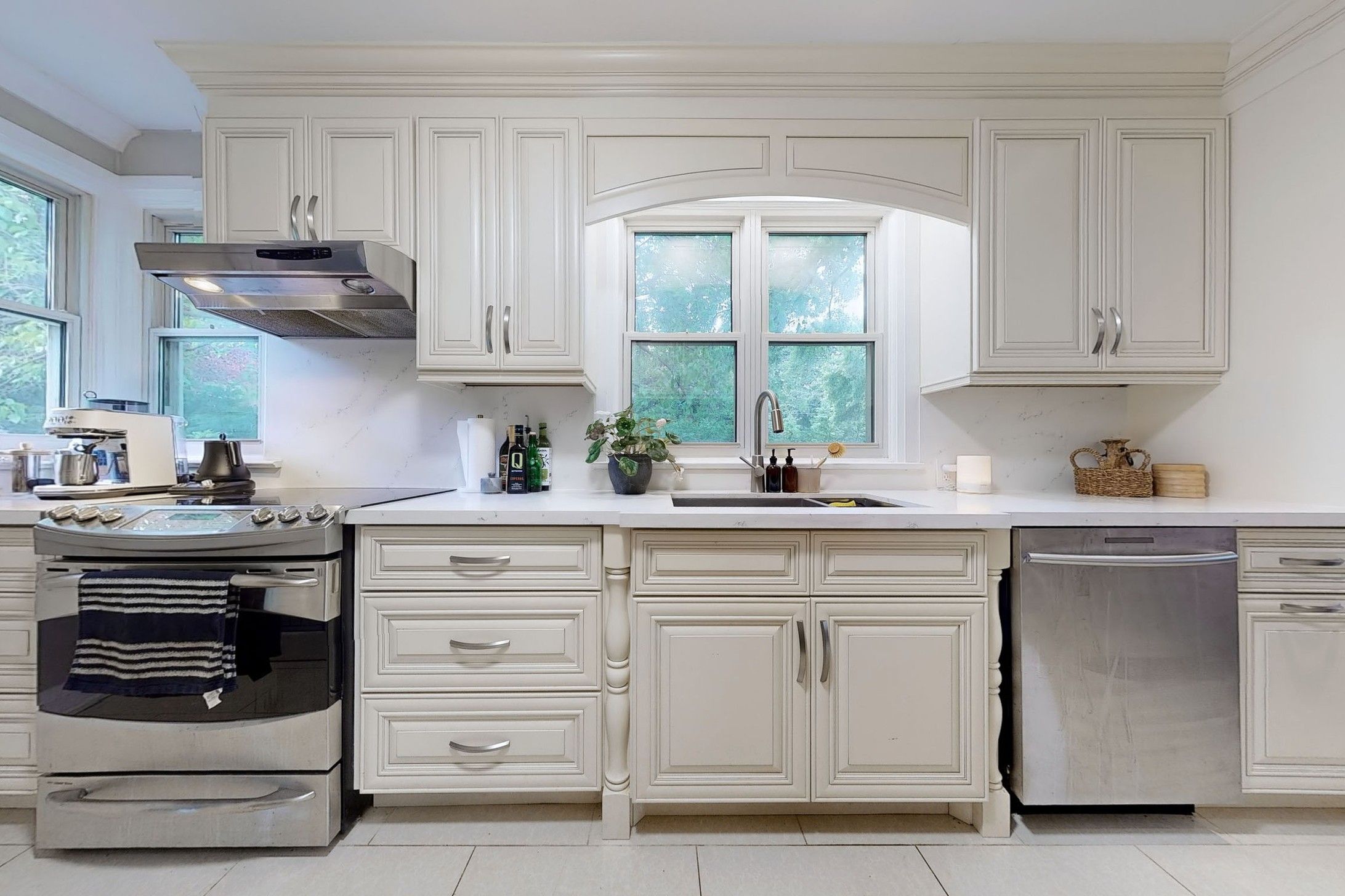 • Custom open concept kitchen featuring quartz countertops and stainless steel appliances.