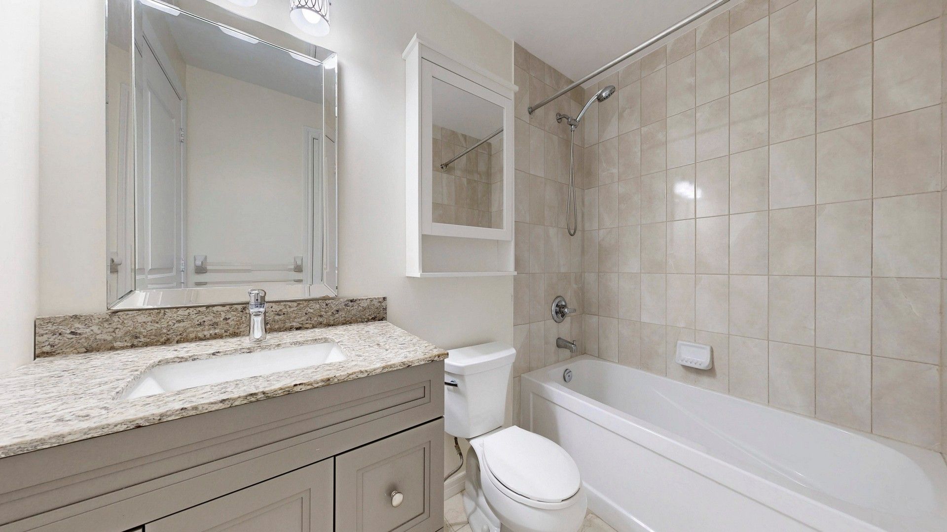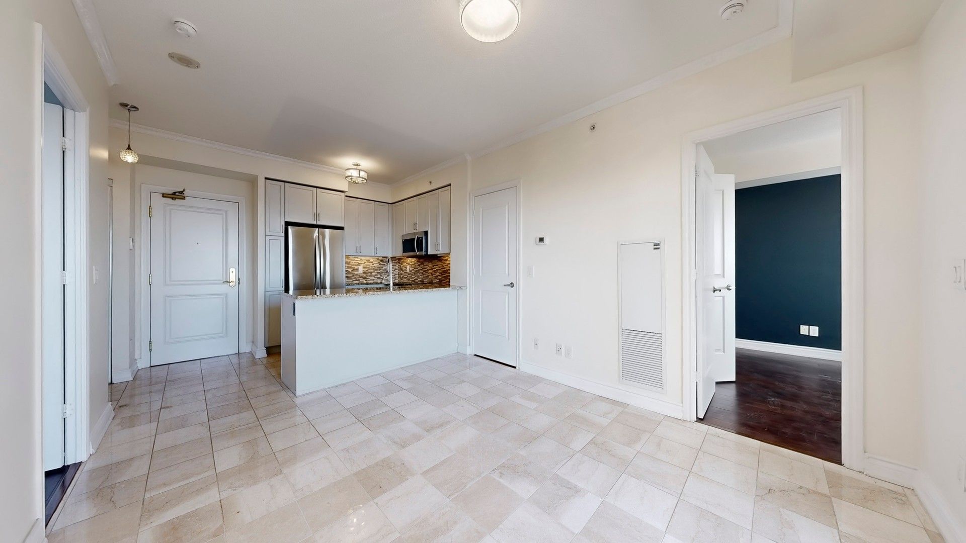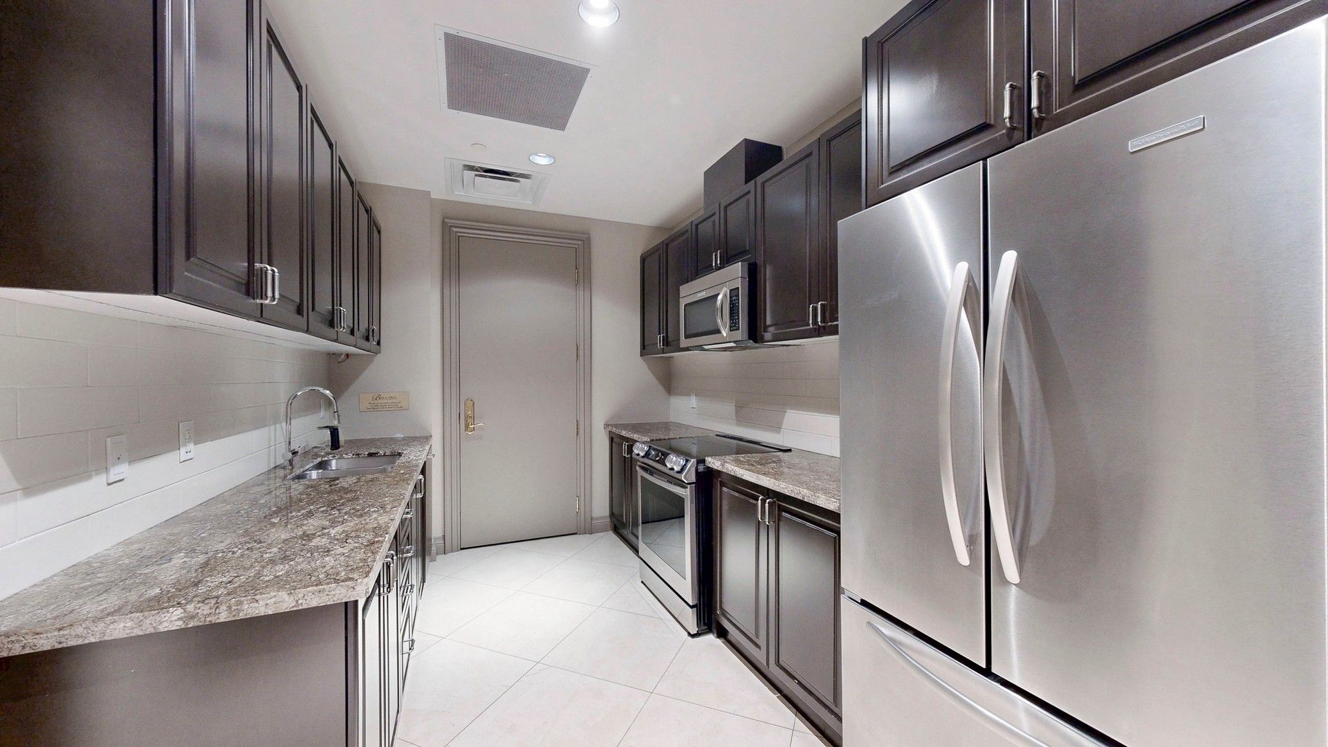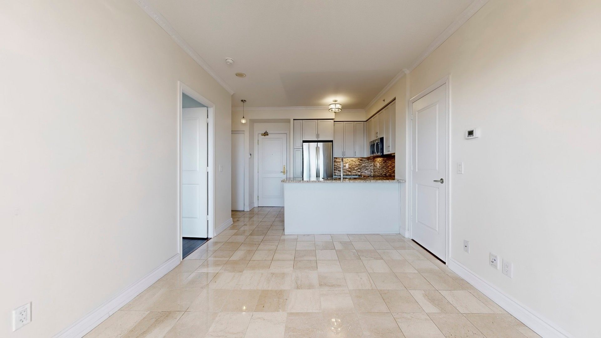 • Modern kitchen features marble countertops and stainless steel appliances.