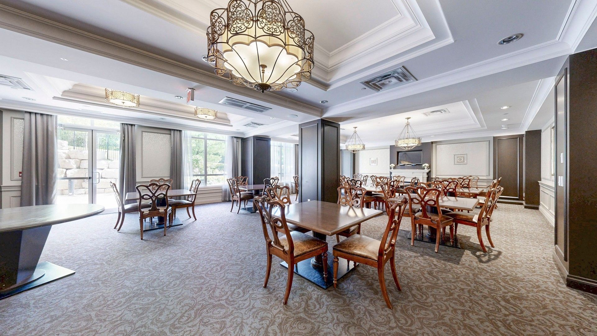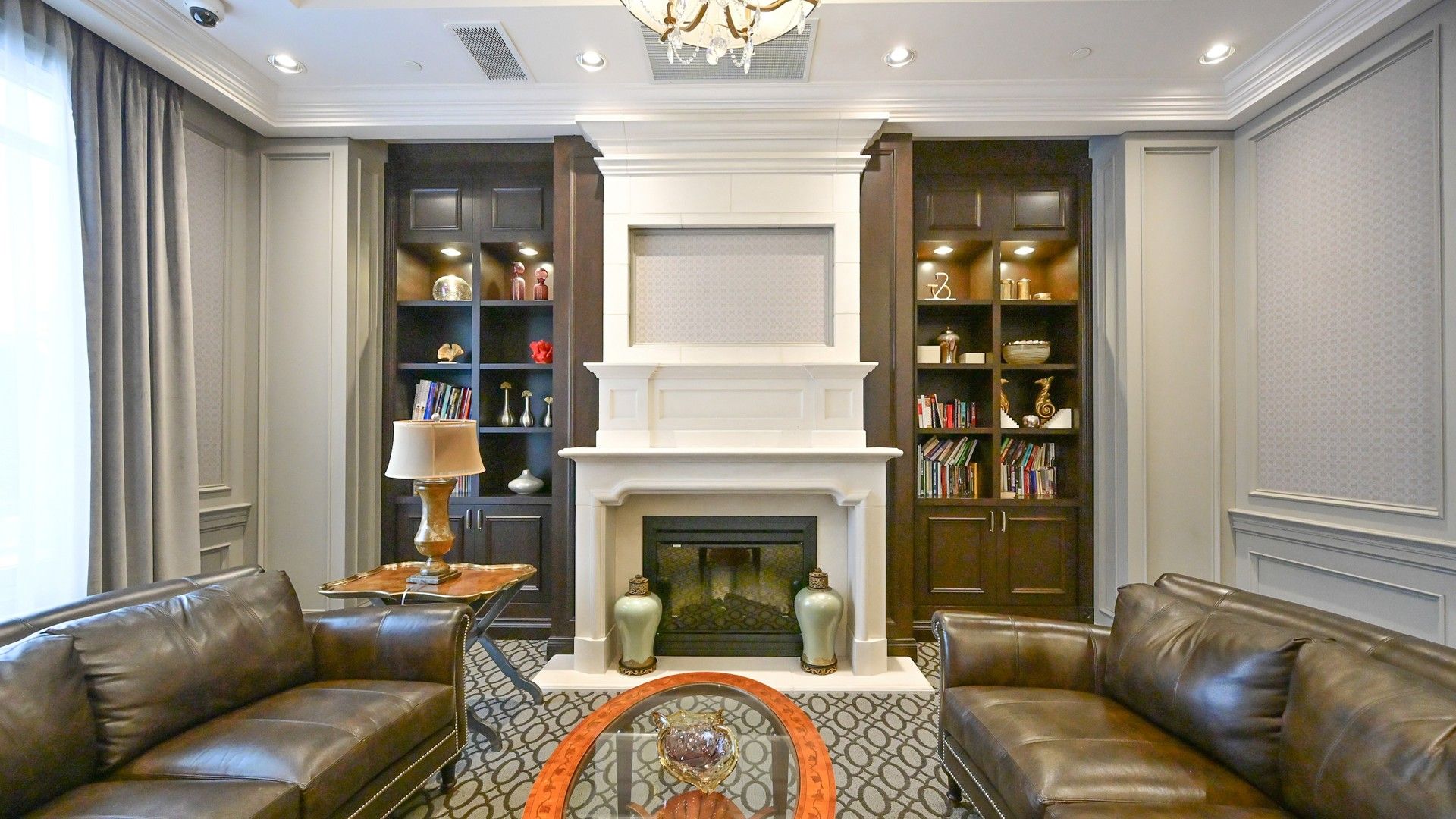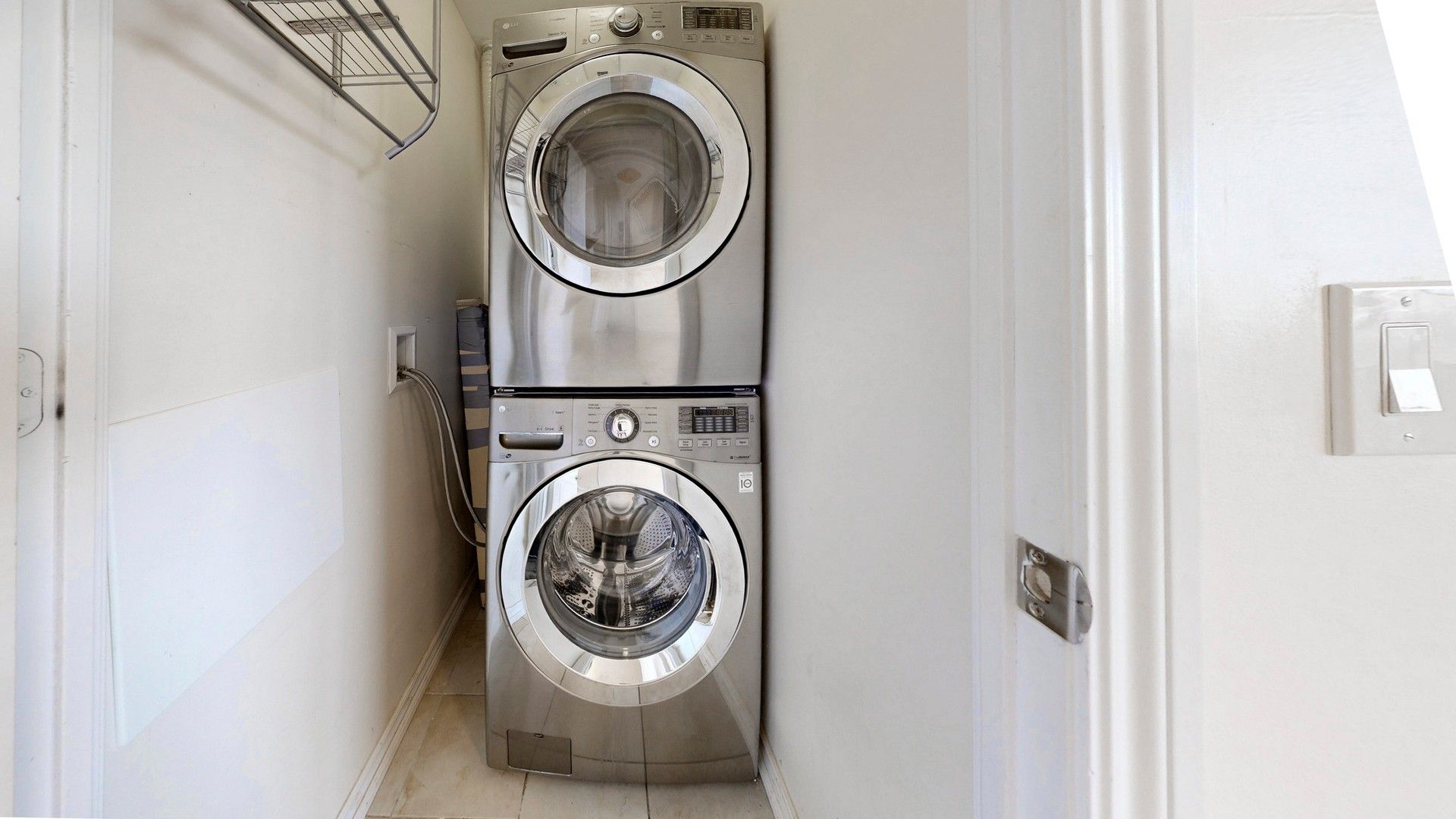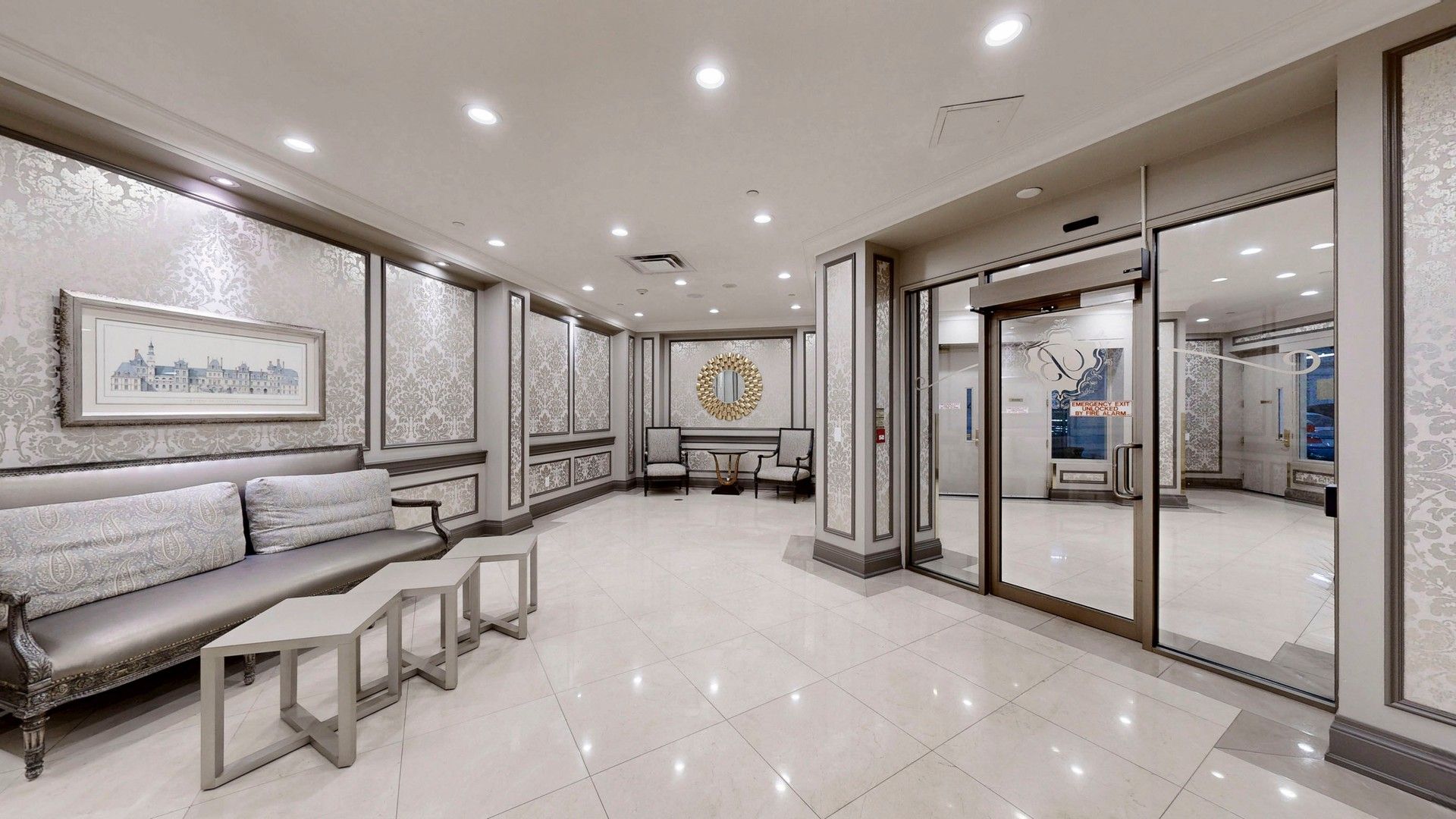 • Modern kitchen features marble countertops and stainless steel appliances.