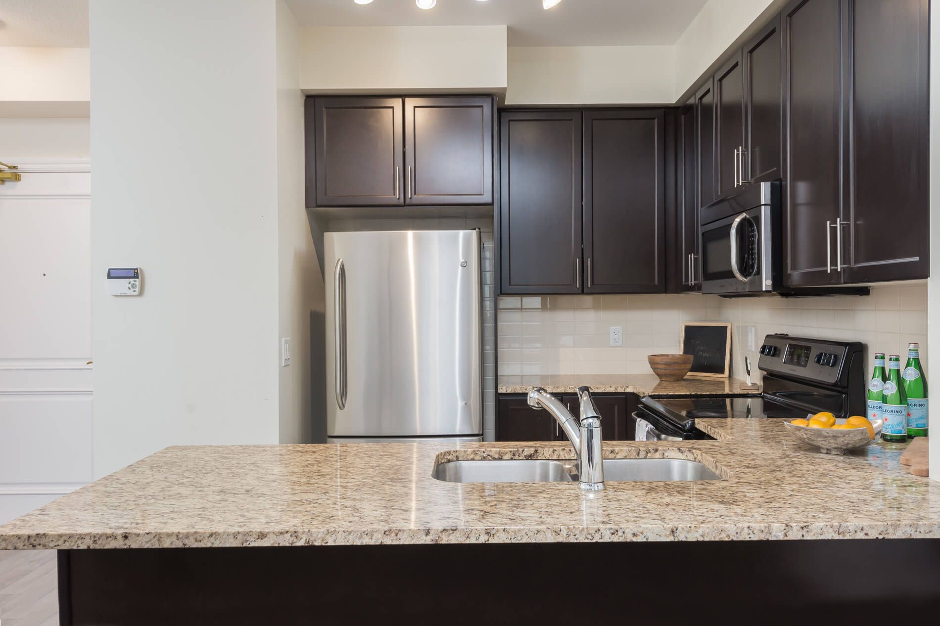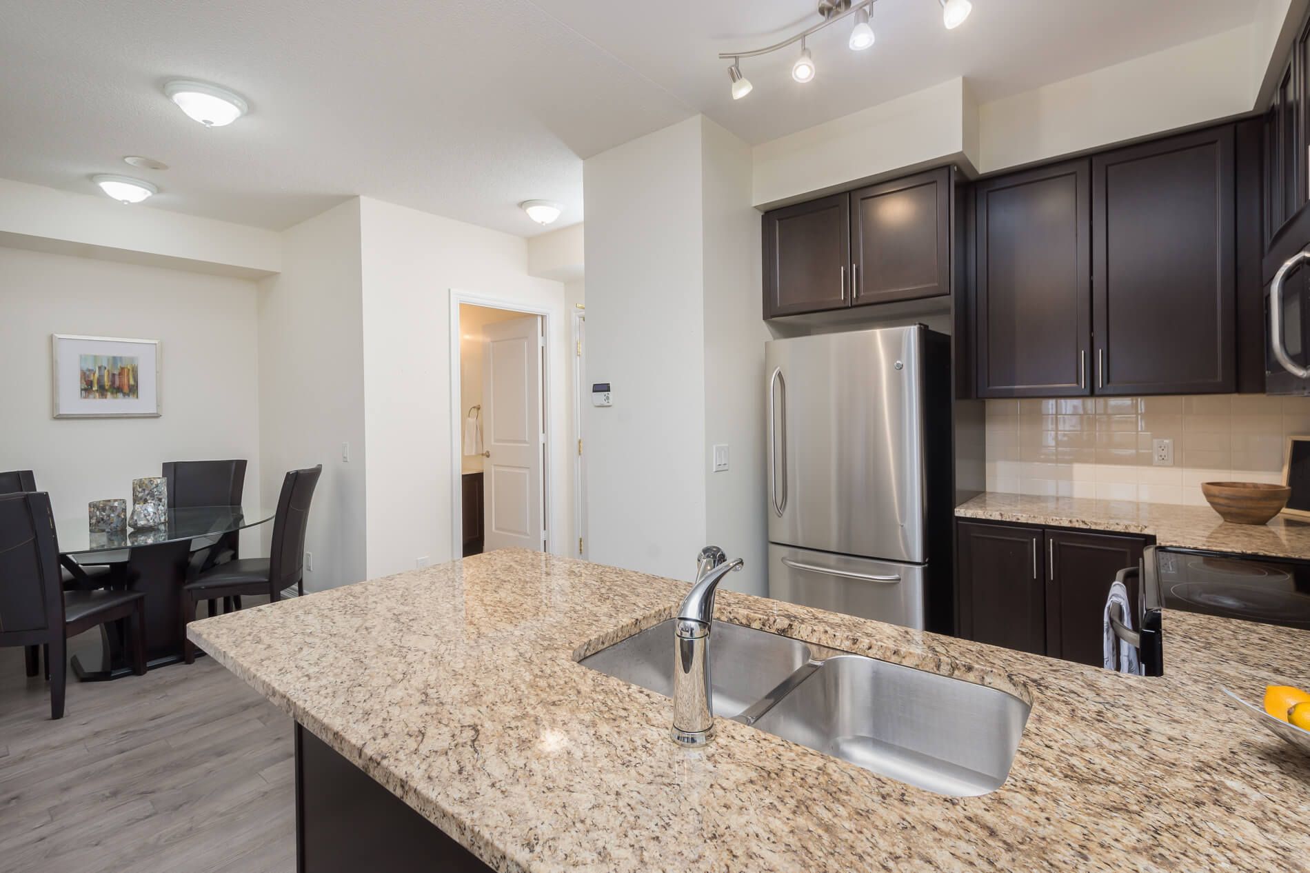 • Modern kitchen with granite countertops and stainless steel appliances.