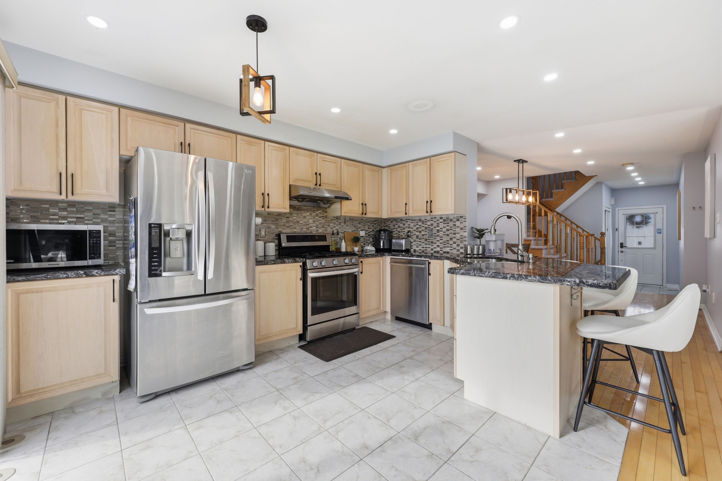 • Modern kitchen with stone countertops and stainless steel appliances.