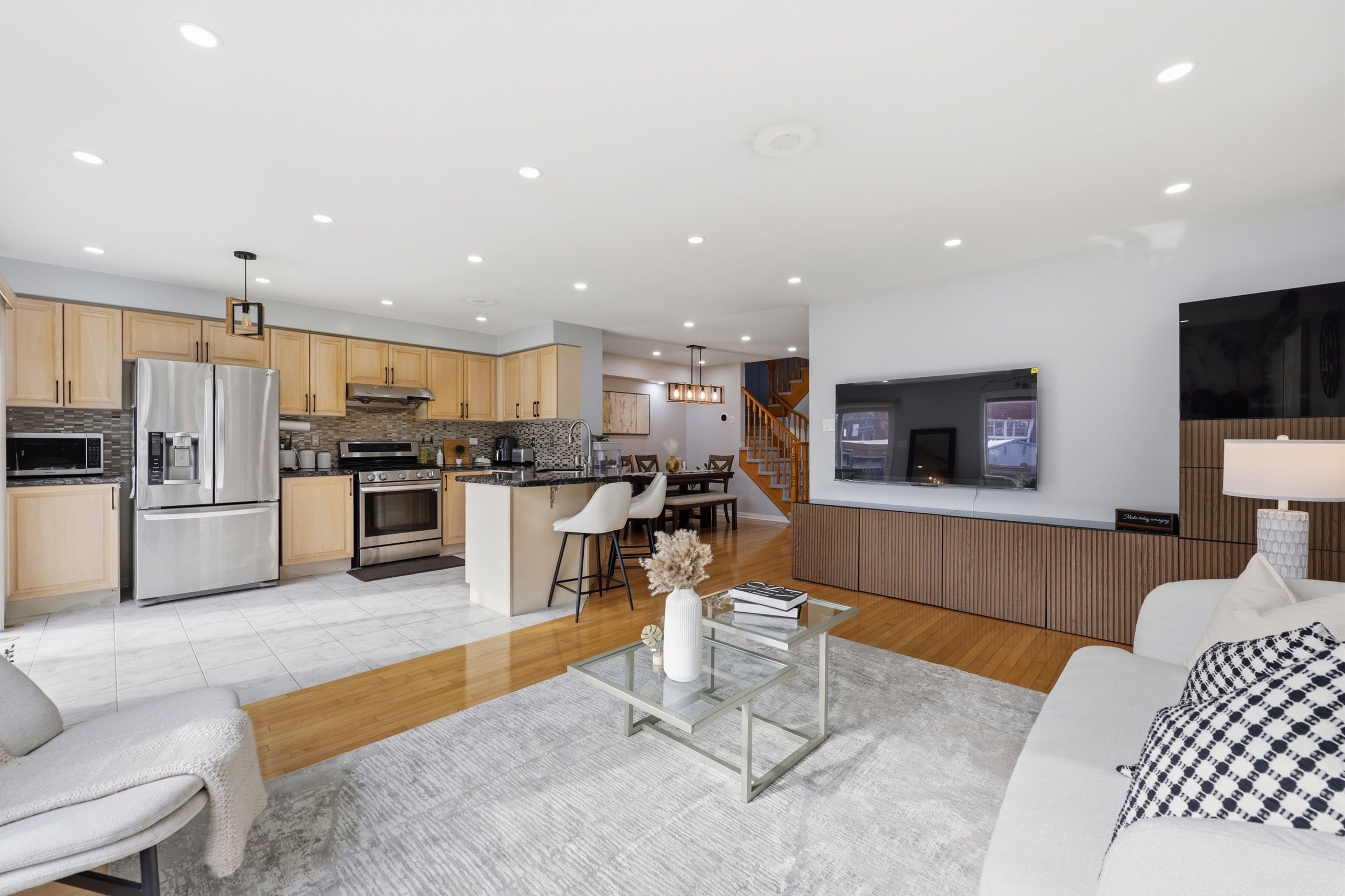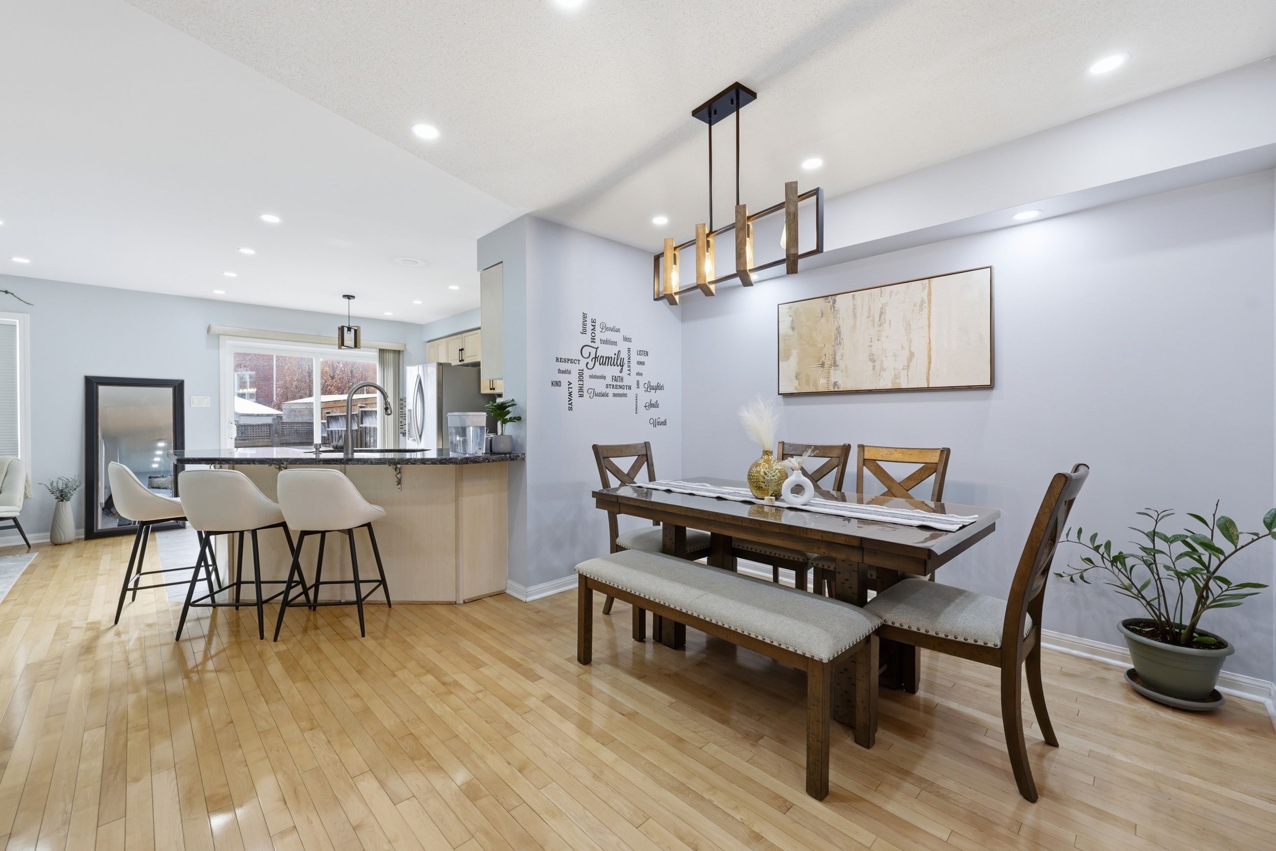 Experience true pride of ownership in this bright, meticulously maintained 3-bed, 3-bath freehold townhouse. The sun-drenched, west-facing main level features soaring ceilings, hardwood flooring, pot lights, and upgraded lighting throughout. A seamless open-concept flow leads from the spacious dining area to a great sized family room. The modern chef's kitchen is a standout, boasting stone countertops, a stylish backsplash, stainless steel appliances, and a breakfast bar with direct walk-out to a private, fully fenced backyard. Upstairs, discover three generously sized bedrooms, including a primary retreat and two full bathrooms. Perfectly situated in one of milton's most connected neighborhoods, you are steps away from top-rated schools, parks, shopping, cafes, and transit. Move-in ready and perfect for growing families!