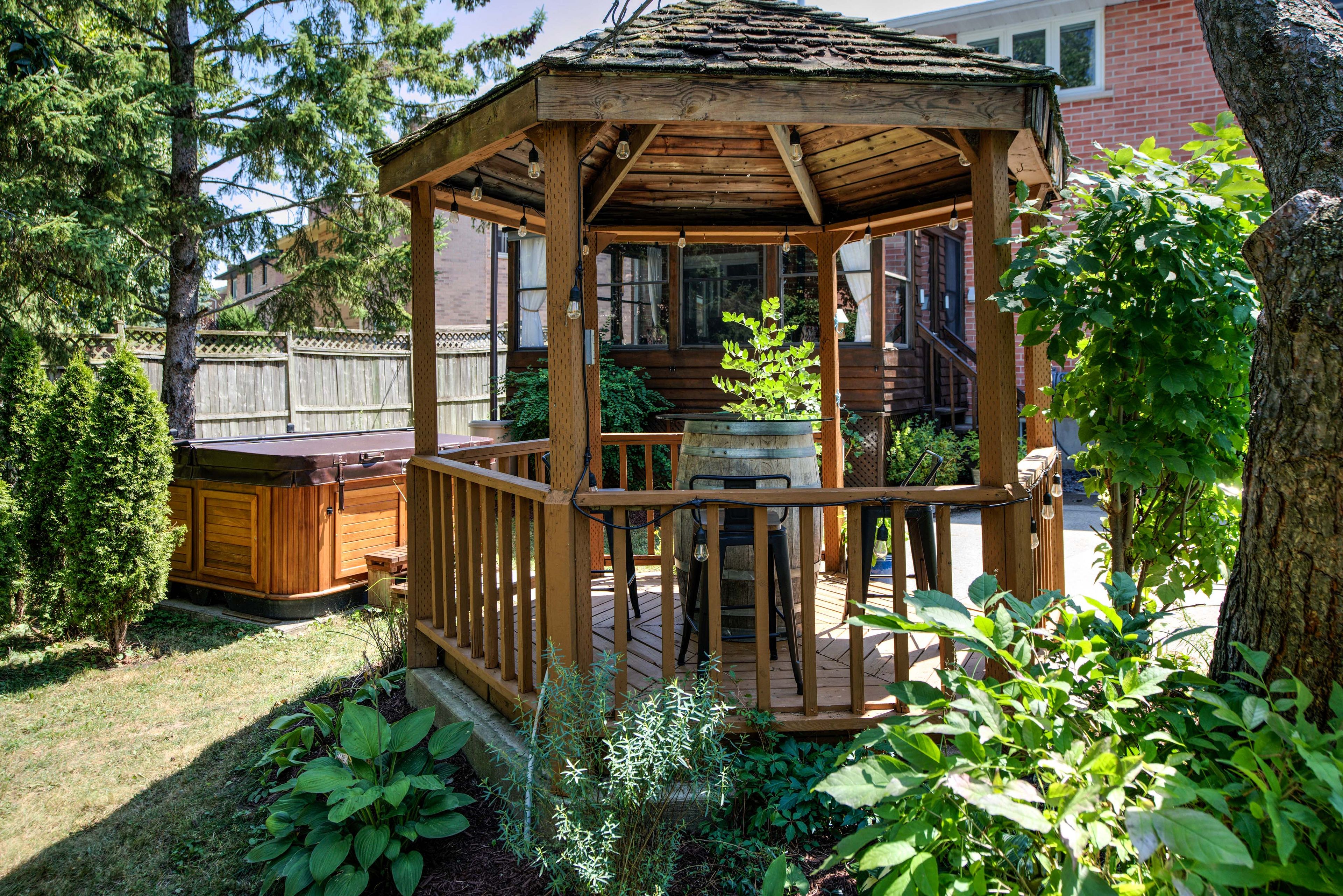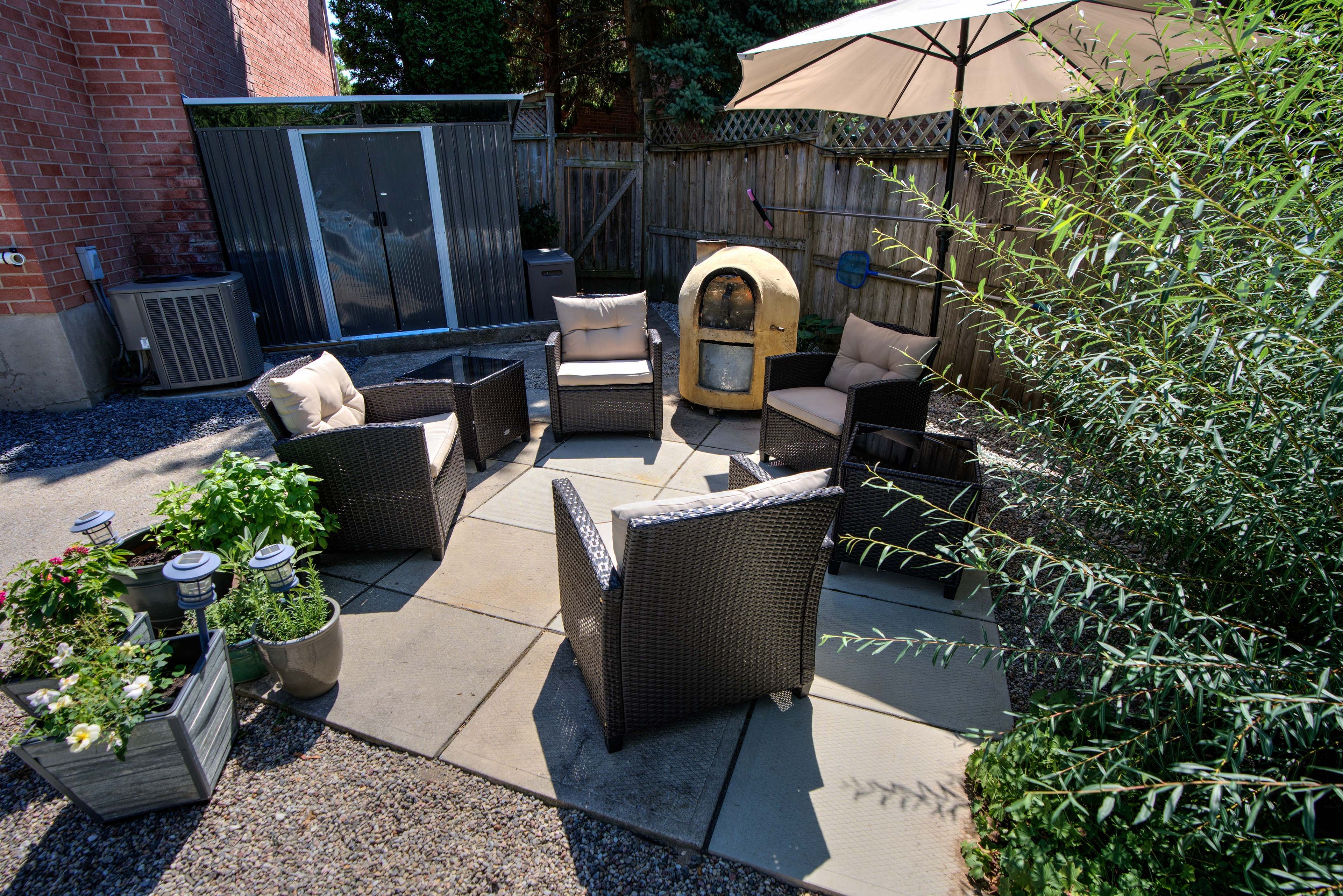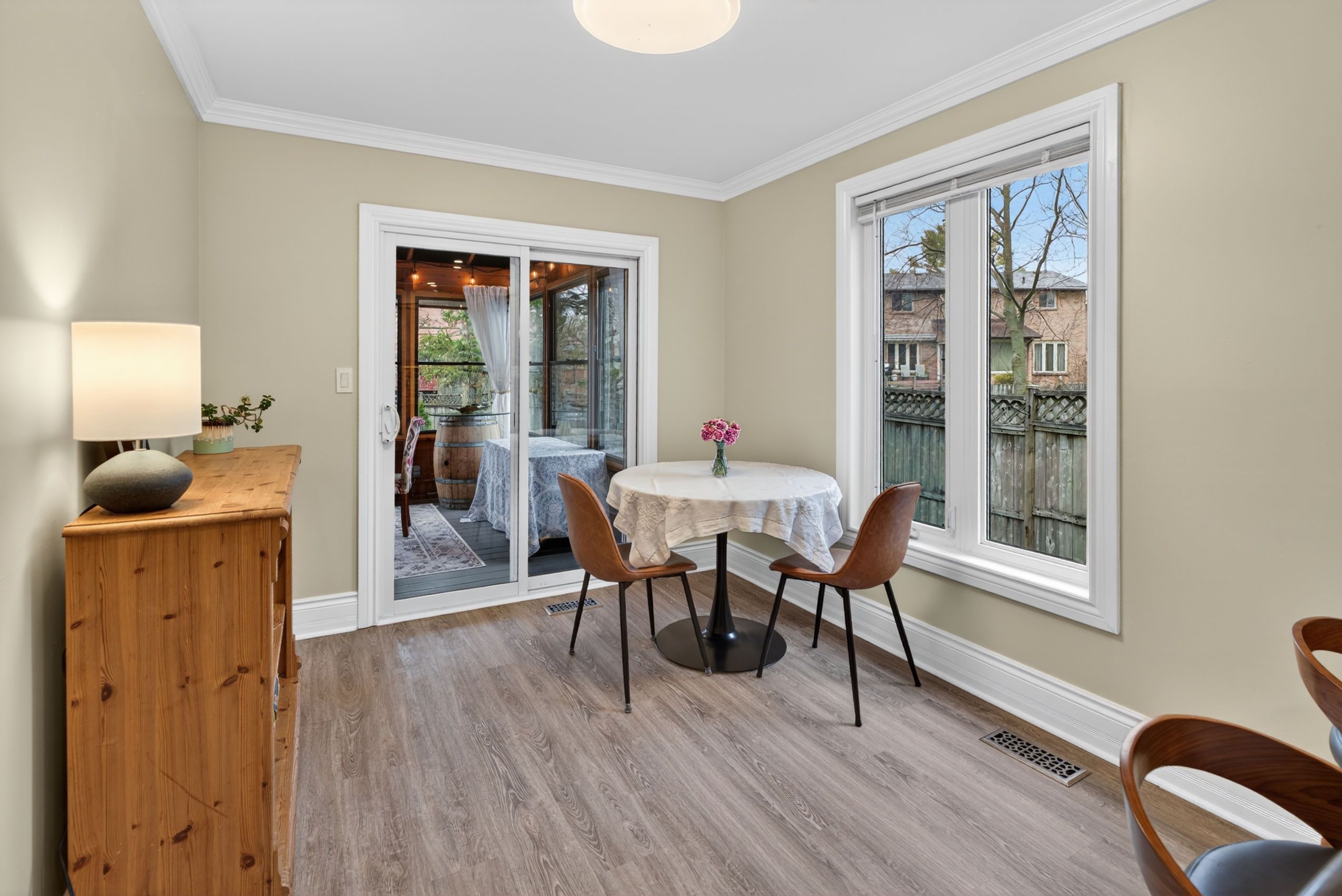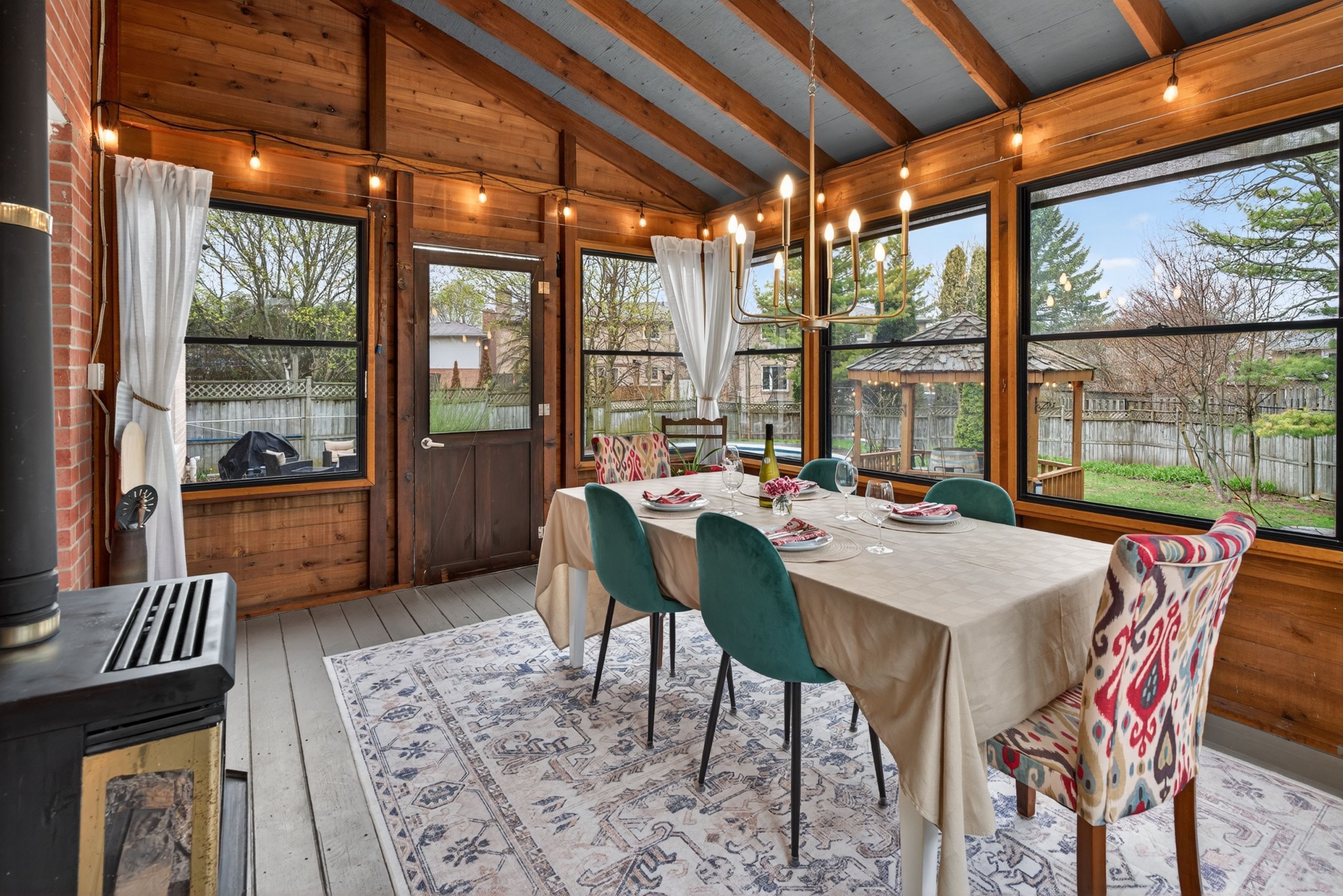 • Bright sunroom offers a relaxing view of a private backyard oasis.