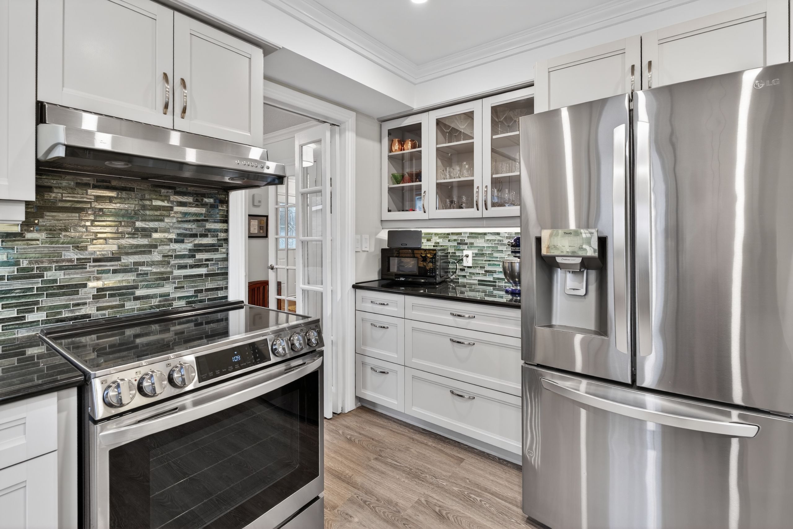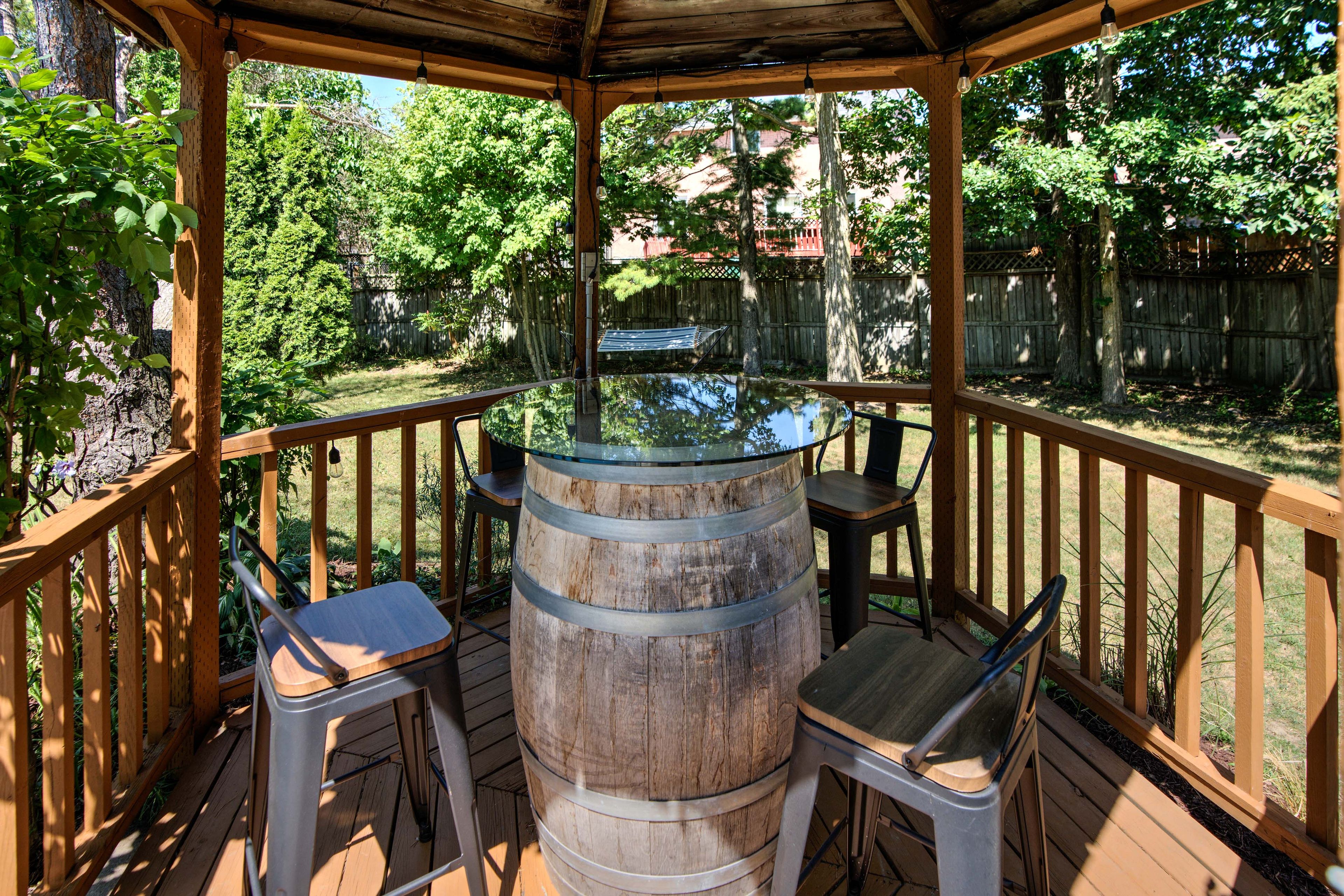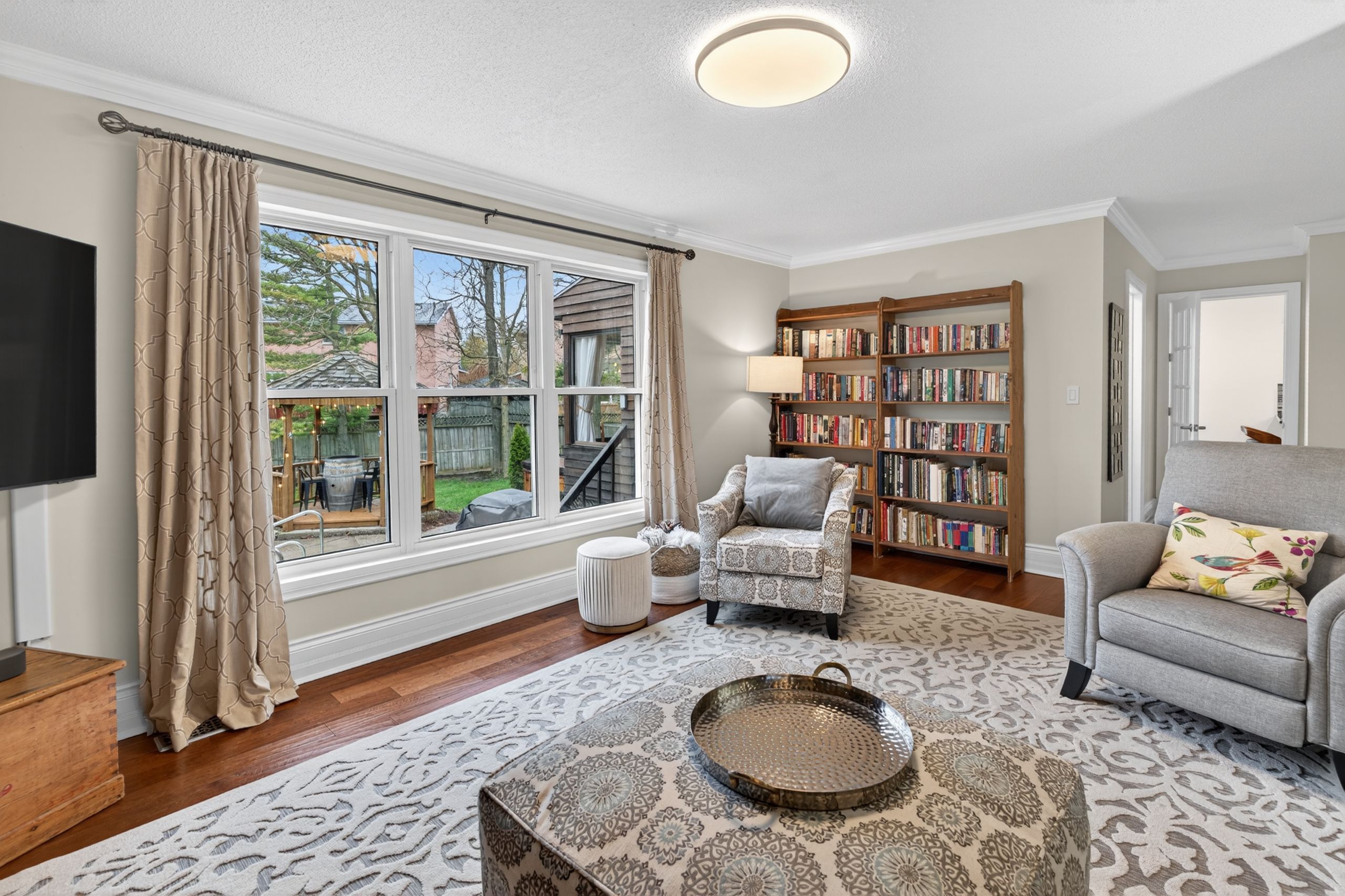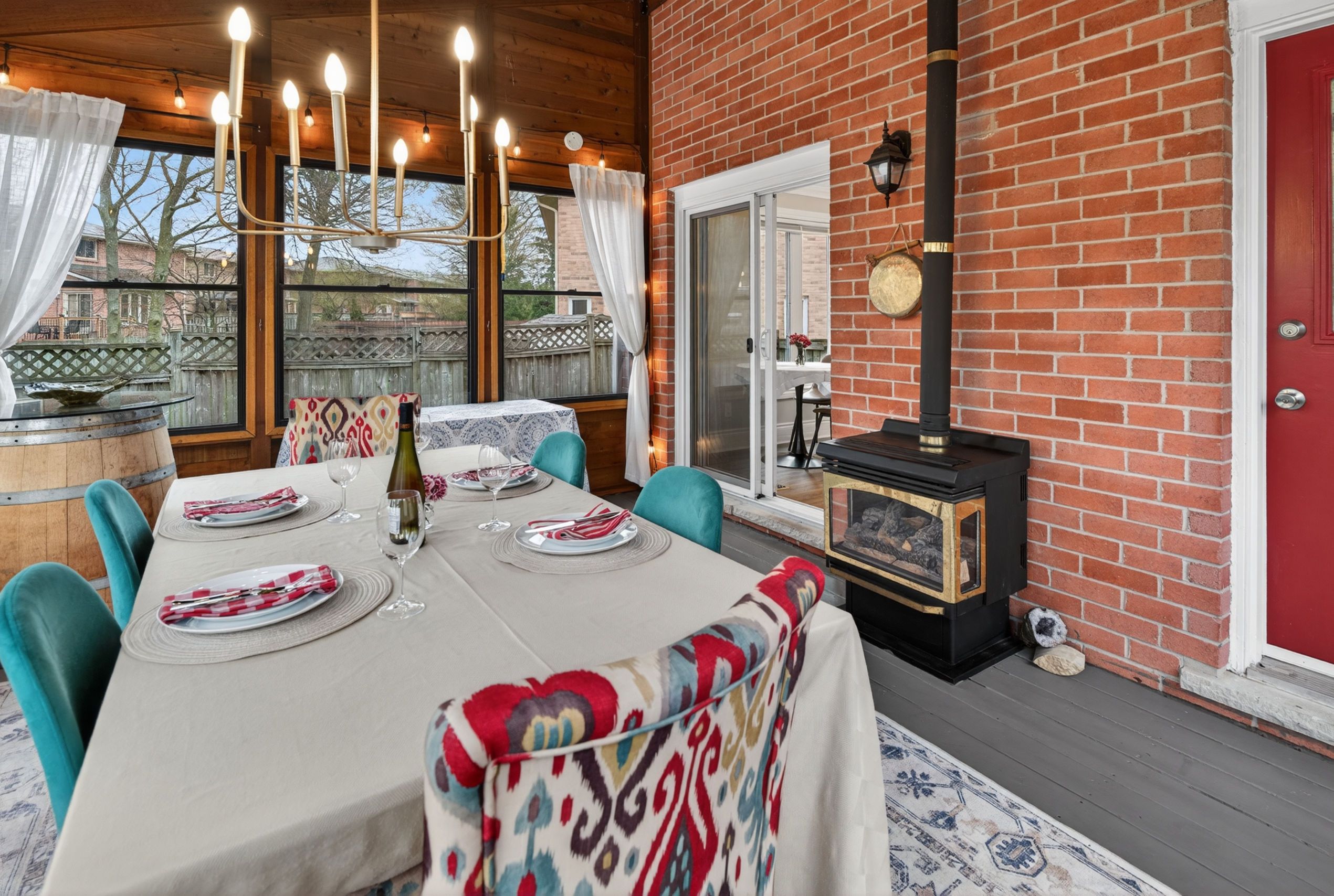 • Bright sunroom offers a relaxing view of a private backyard oasis.