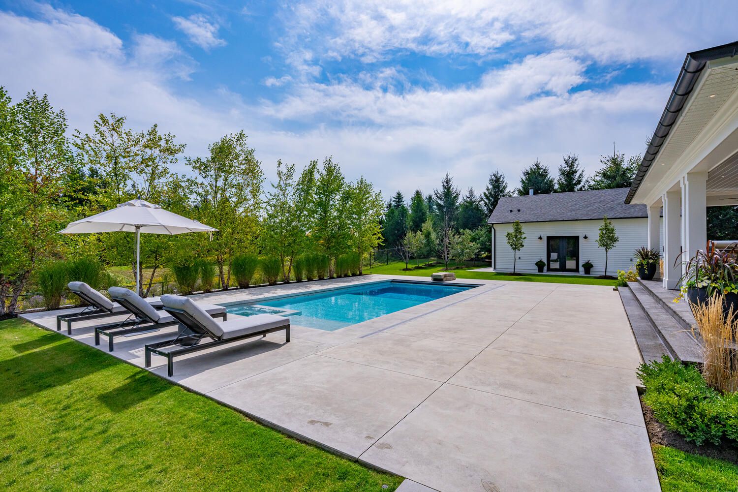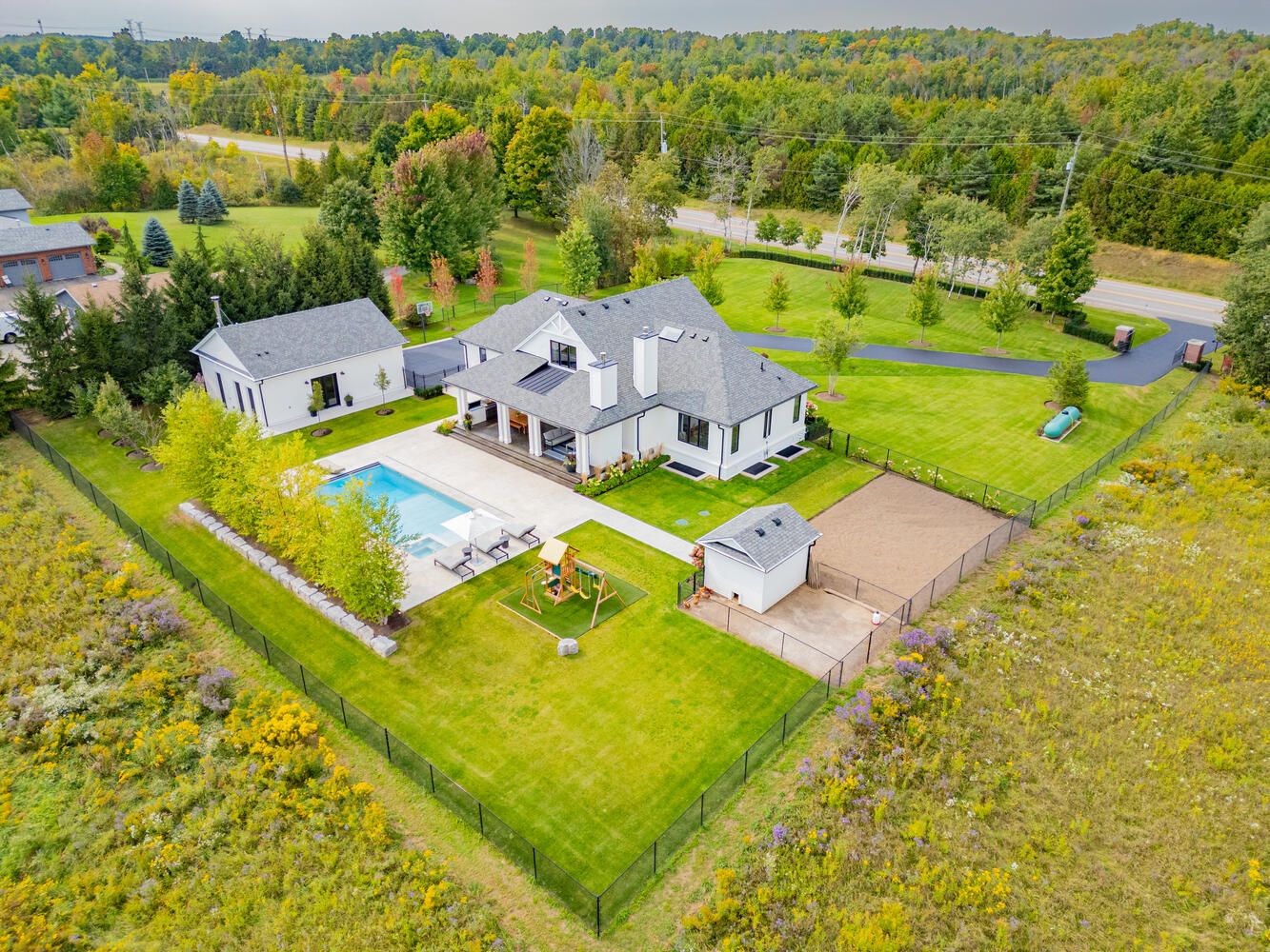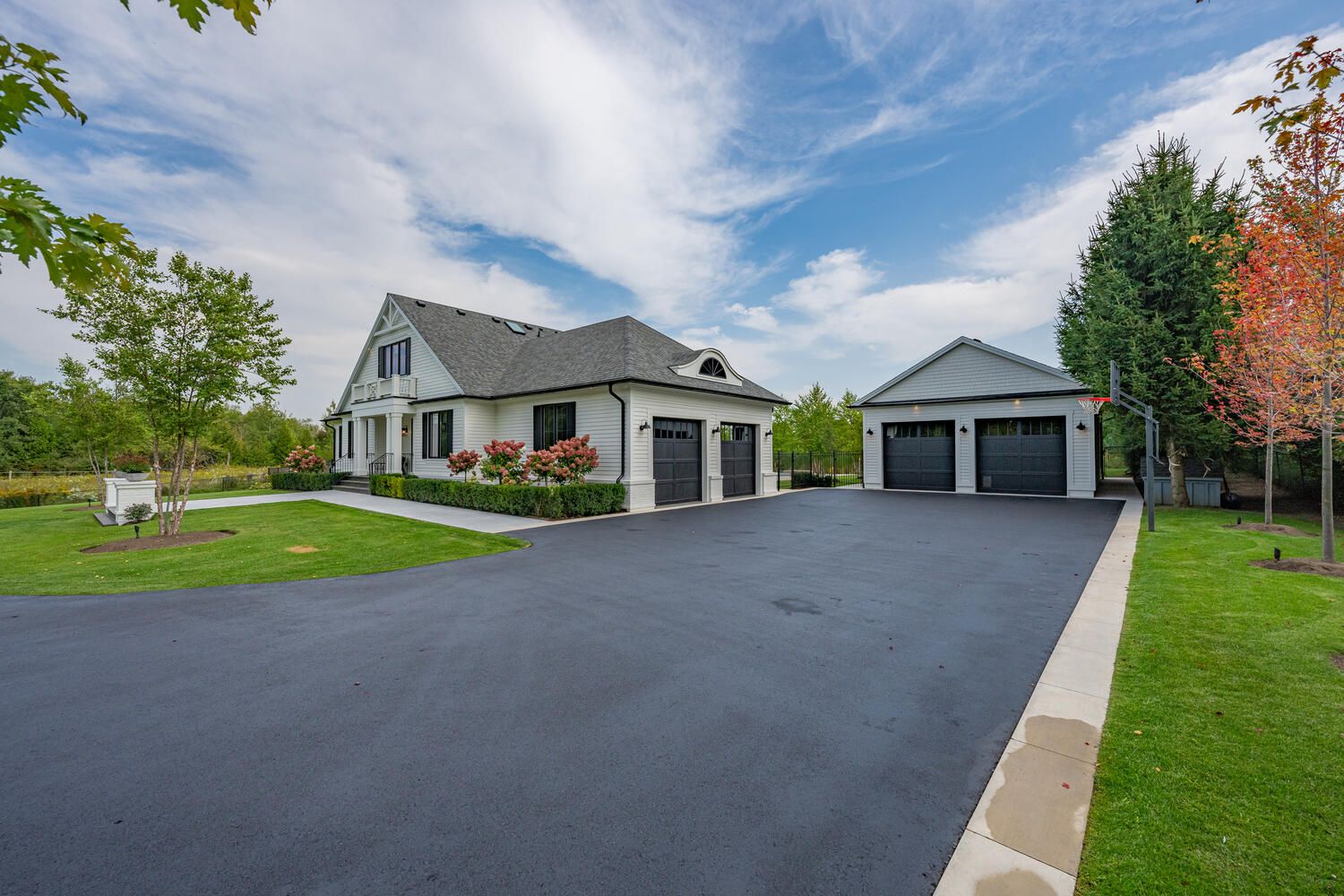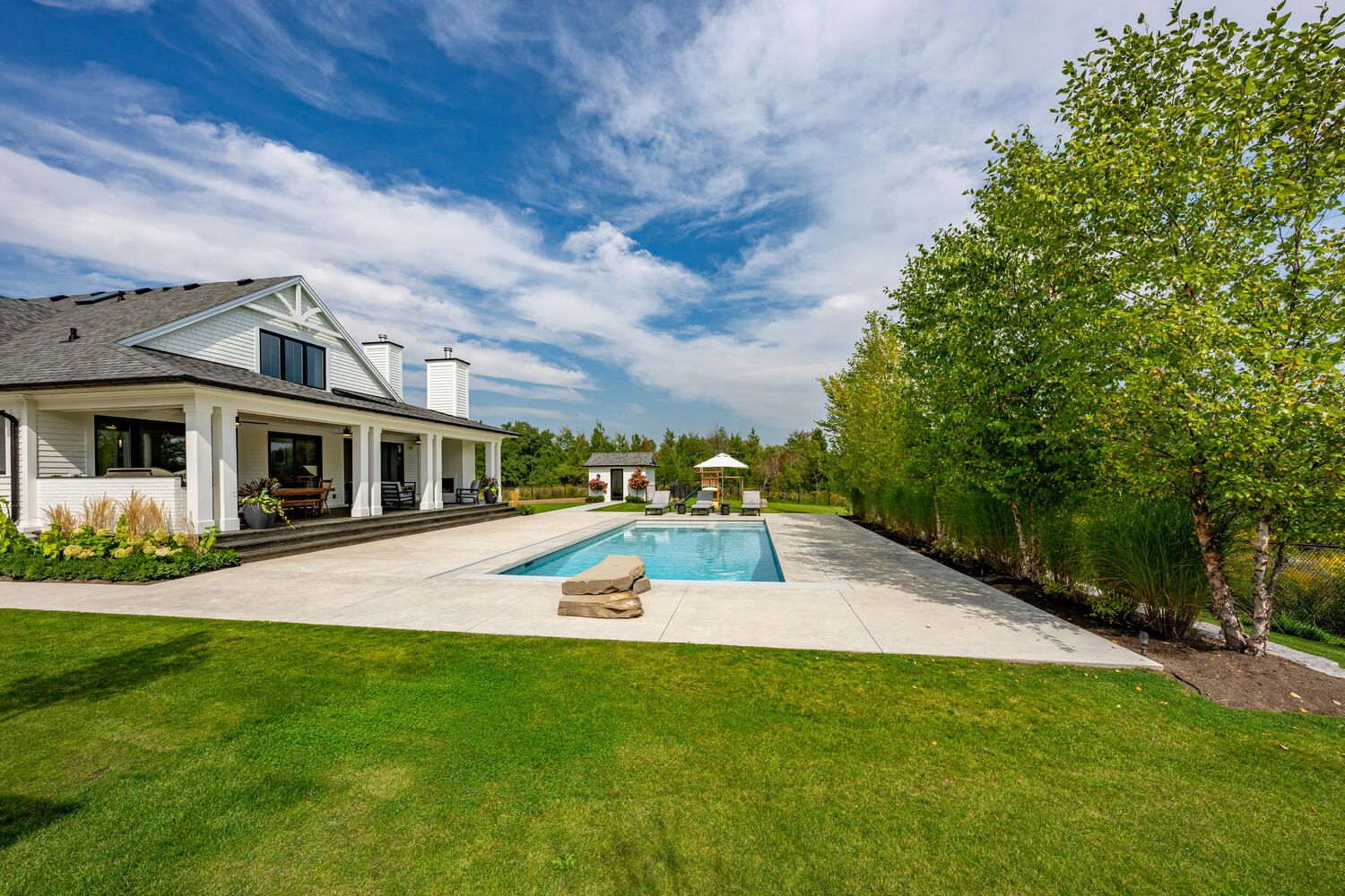 When home is a sanctuary: from the moment you drive through the gates of this john wilmott-designed custom home, every detail speaks of exceptional craftsmanship. The handcrafted modular brick and cape cod siding set the tone, while the crushed granite flagstone path leads to a stunning mahogany entry door. Step inside to soaring 10-ft ceilings, white oak flooring, custom poplar trim, and elegant crown mouldings - a home that truly inspires. The heart of the home is thekitchen with marble counters, opening to a covered back porch featuring a brick fireplace, built-in bbq, concrete pool and spa, and a seamless speaker system - perfect for entertaining year-round. Relax in the main-floor principal bedroom with a spa-like ensuite, curbless shower, and a large walk-in closet. A main-floor office, powder room, and laundry complete the level. Upstairs, two additional bedrooms and a bathroom provide space for family or guests. The lower level boasts a large family room with above-grade windows and fireplace, an additional bedroom and bath, a sizable exercise room with rubber flooring, and ample storage with built-in cupboards. Step outside to thoughtfully designed landscaping for privacy and impact. Park with ease in the oversized 2-car garage with epoxy floors or take advantage of the additional detached garage with heated floors, a 3-piece bath/change room, and a custom wood-burning oven. This isn't just a home - it's a lifestyle of luxury, attention to detail, and timeless design.